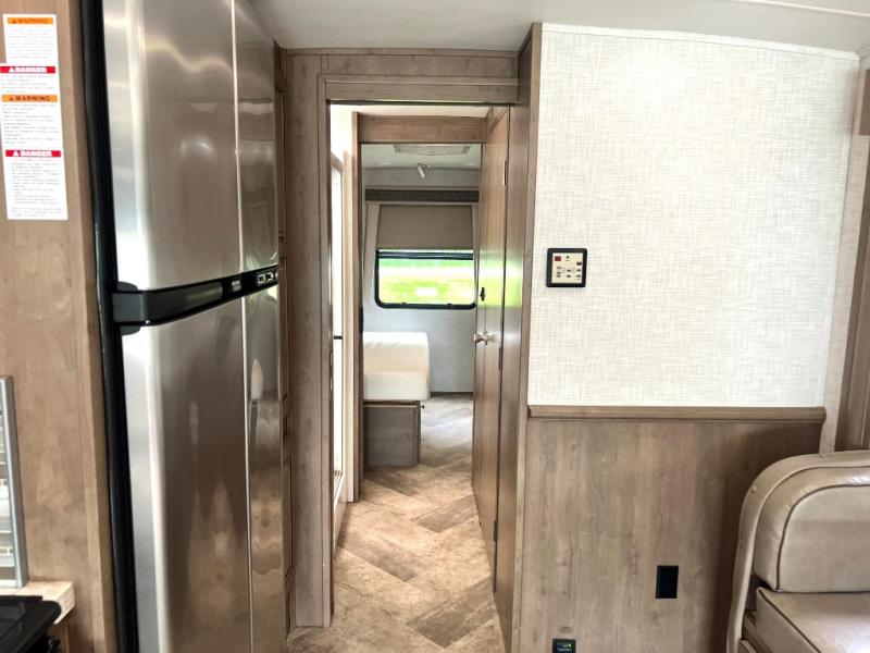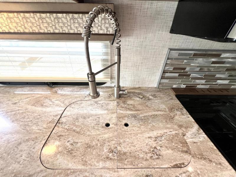 Load up your family of five and see just how easy it is to camp in style and comfort with this Georgetown 5 Series 31R5 class A gas motorhome. Sleeping room can be found at the sofa, the dream dinette, and the king bed. Inside the rear private bedroom, you will also find two wardrobes, one of which is prepped to add the optional washer/dryer so that you can keep up with your laundry throughout your trip, and there is even a 32" LED TV. The front passenger work station makes it easy to get a little work done while you are away from home too. In the kitchen you will find all of the amenities needed to create your favorite meals for your family while you are away from home. There is an 18 cu. ft. stainless steel refrigerator, a three-burner range, plus a microwave and plenty of overhead cabinets throughout to keep all of your cooking/traveling necessities!