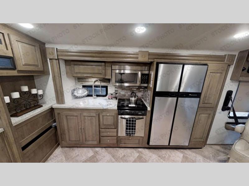 For comfort and style you will want a Forest River Georgetown 5 Series class A gas motorhome. Along the exterior there is a "Super Storage" rear cargo compartment, an outside shower, as well as a stylish fiberglass front cap with a lighted logo, LED accent lights, and an automotive bonded front windshield. As you step inside, be prepared to be wowed with all of the at-home convenient features such as the stainless steel three-burner cooktop with oven, the two LED TVs, and the King Jack™ digital TV antenna with a mount and built-in signal meter. In the cockpit there is a custom dash with ABS side consoles, drink holders, and a 110V outlet/USB. You will also enjoy the convenience of the MyRV touchscreen with wireless technology.