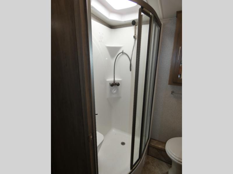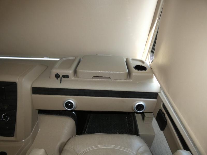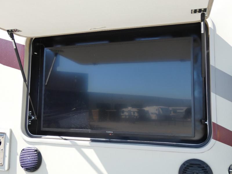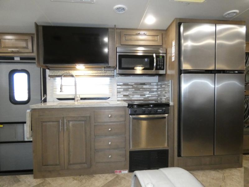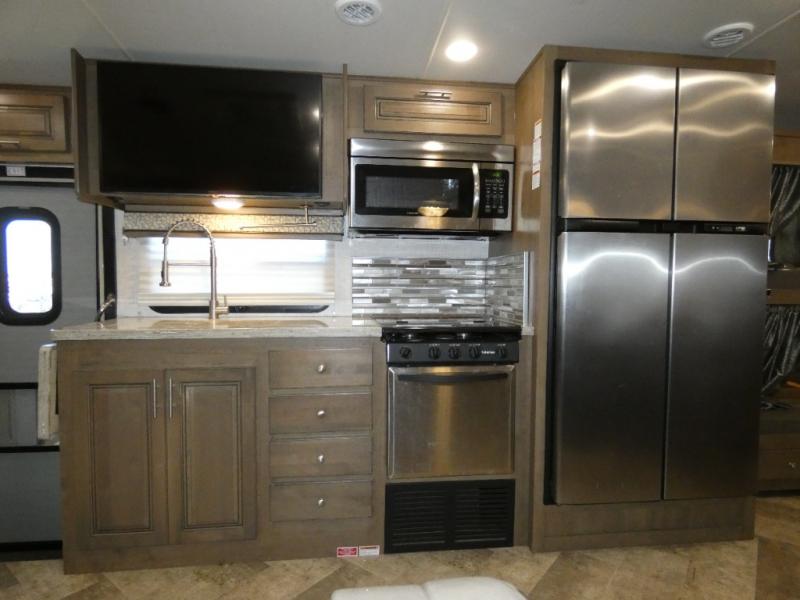 For comfort and style you will want a Forest River Georgetown 5 Series class A gas motorhome. Along the exterior there is a "Super Storage" rear cargo compartment, an outside shower, as well as a stylish fiberglass front cap with a lighted logo, LED accent lights, and an automotive bonded front windshield. As you step inside, be prepared to be wowed with all of the at-home convenient features such as the stainless steel three-burner cooktop with oven, the two LED TVs, and the King Jack™ digital TV antenna with a mount and built-in signal meter. In the cockpit there is a custom dash with ABS side consoles, drink holders, and a 110V outlet/USB. You will also enjoy the convenience of the MyRV touchscreen with wireless technology.