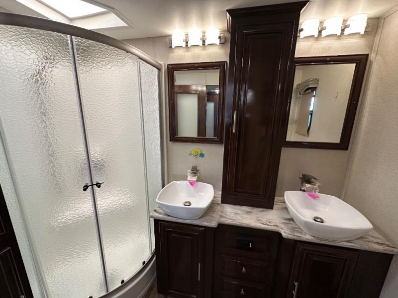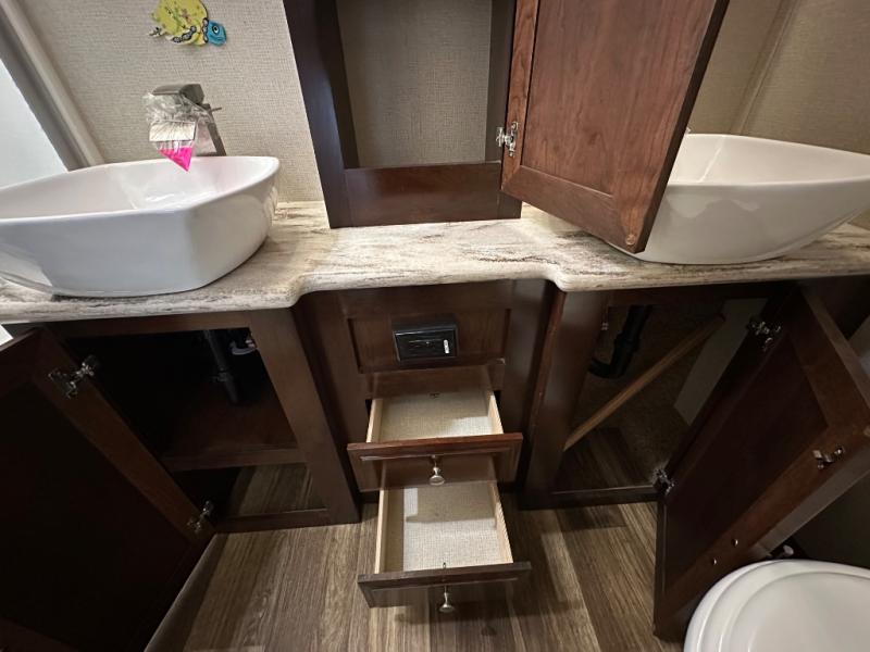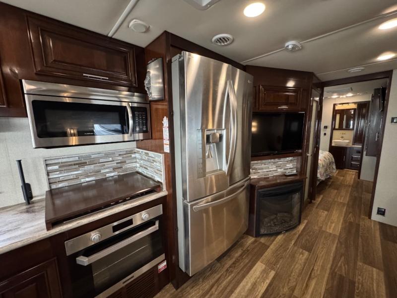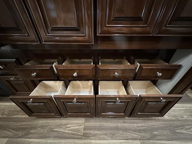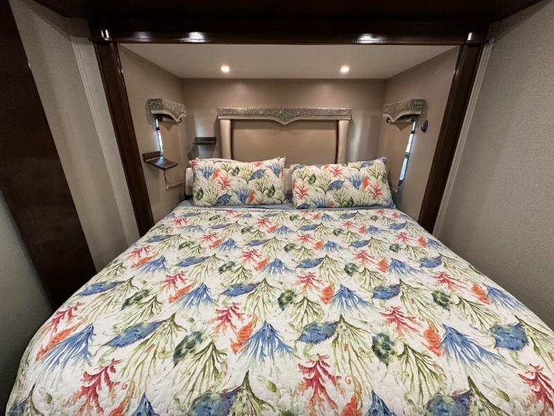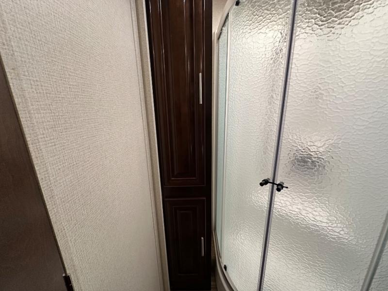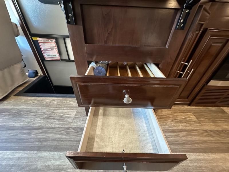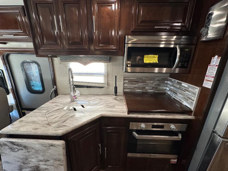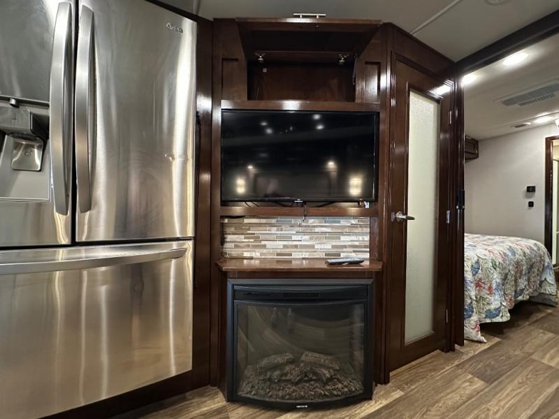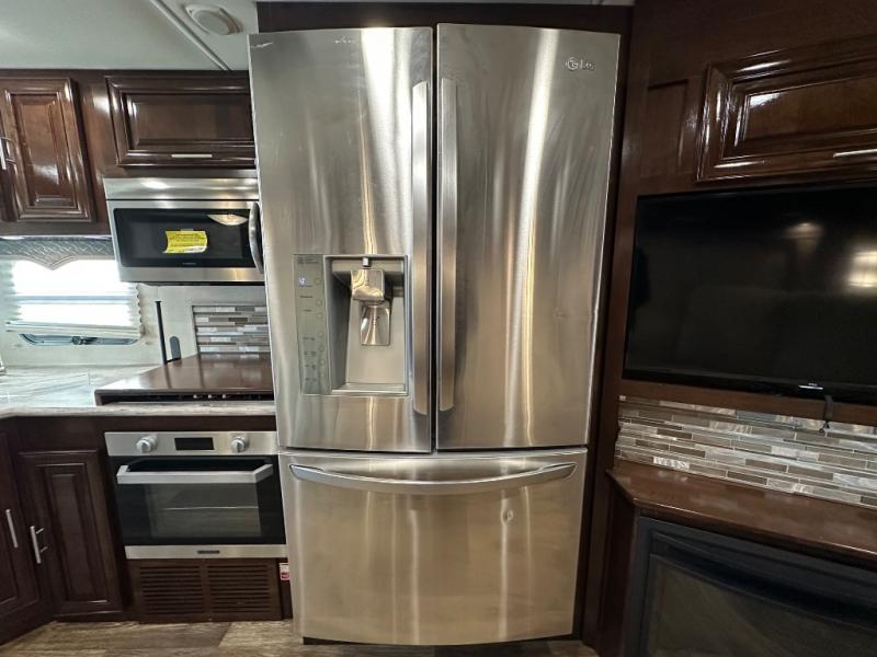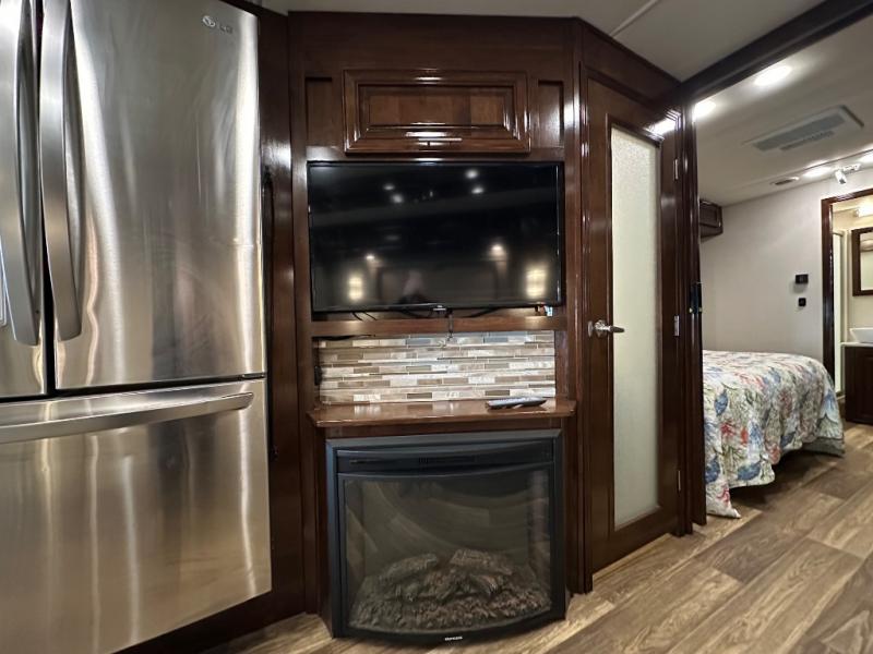 Step inside this Georgetown XL Class A gas motorhome to find comfort and luxury with two slides, sleeping space for five, plus a bath and a half with a dual-sink vanity in the master bathroom! In the evening you can plan to have a fire in the fireplace and watch TV on the 40" LED TV while relaxing on the four-person theater seating. The kitchen has all of the amenities that you would find at home with the stainless steel residential refrigerator, three-burner range, and microwave. You will also find that this model has been prepped for an optional washer and dryer so that you can keep up with your laundry while you are away from home.