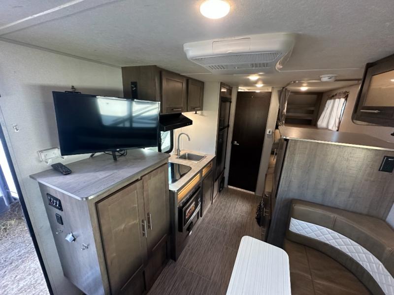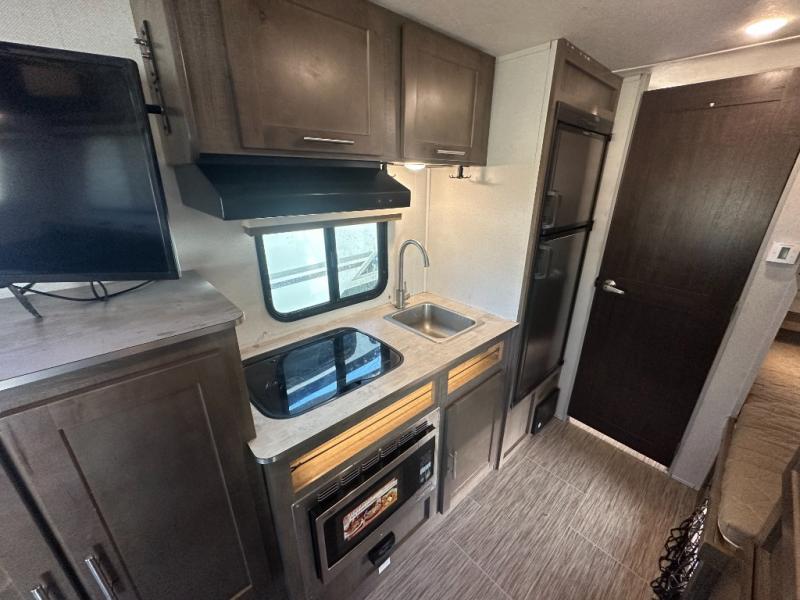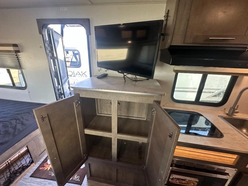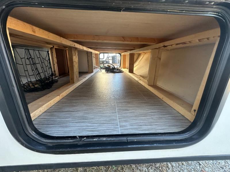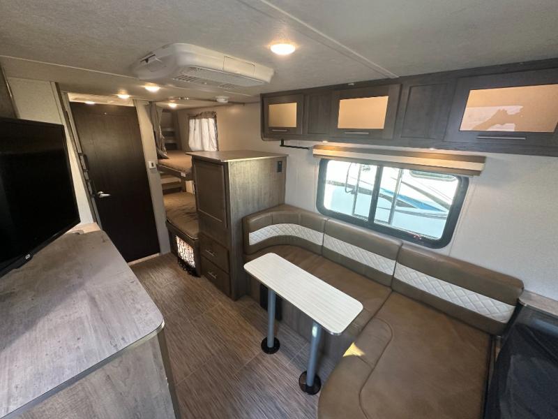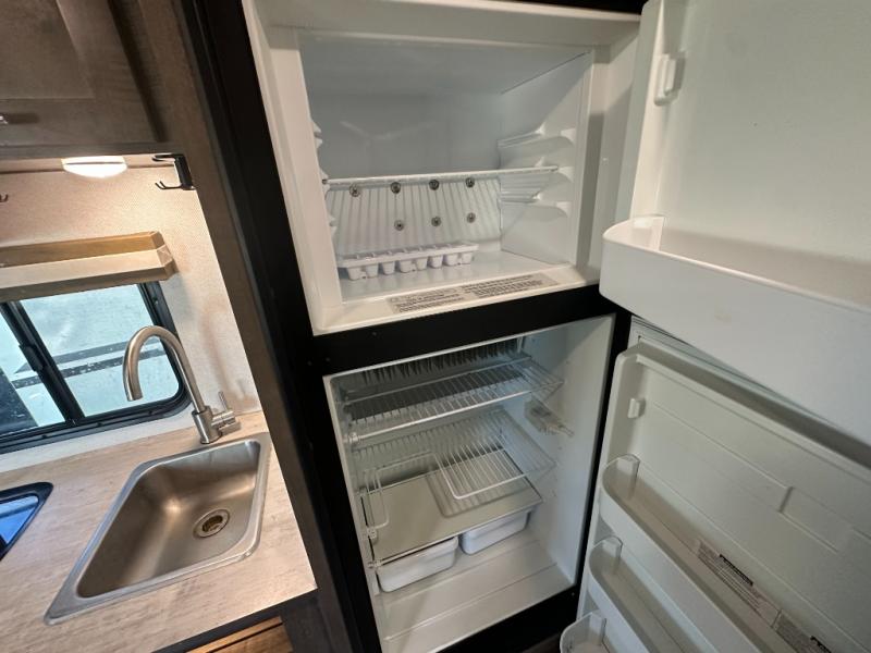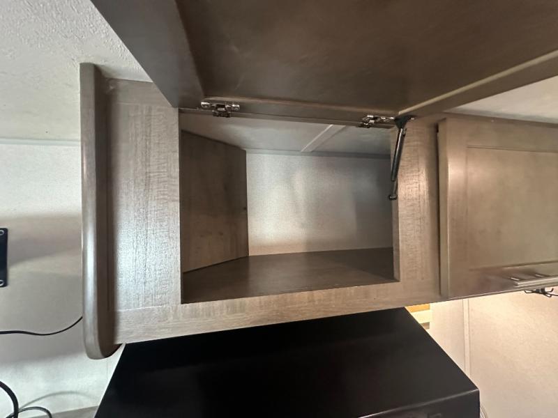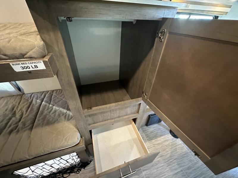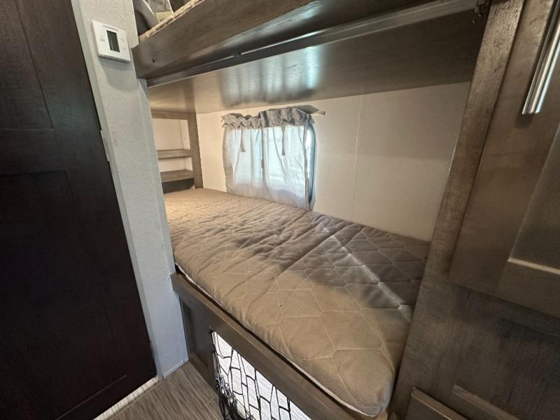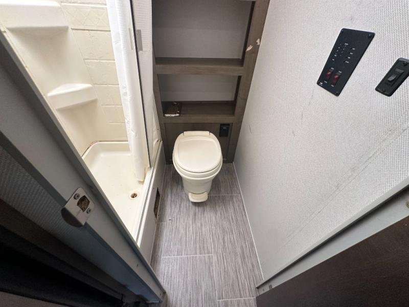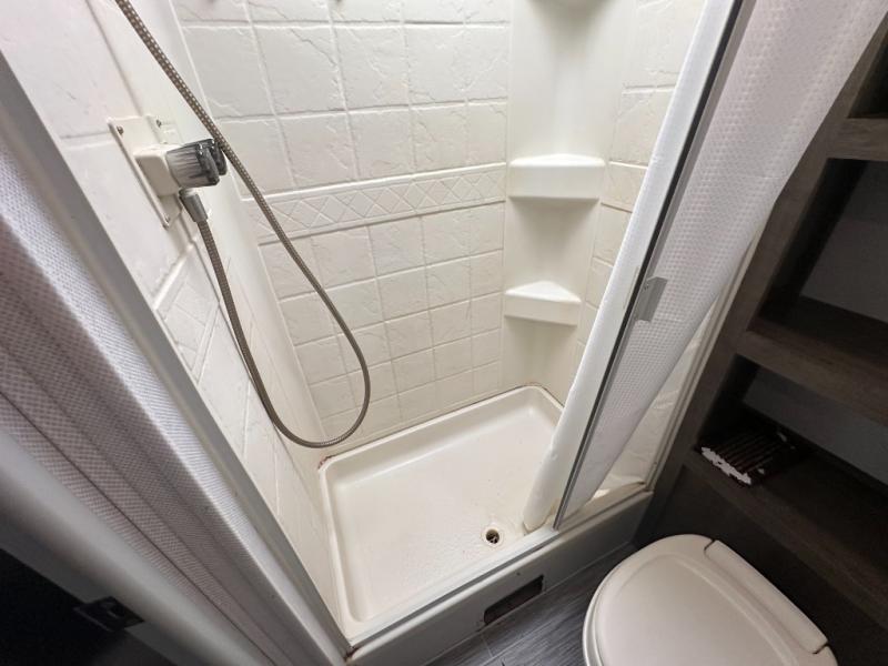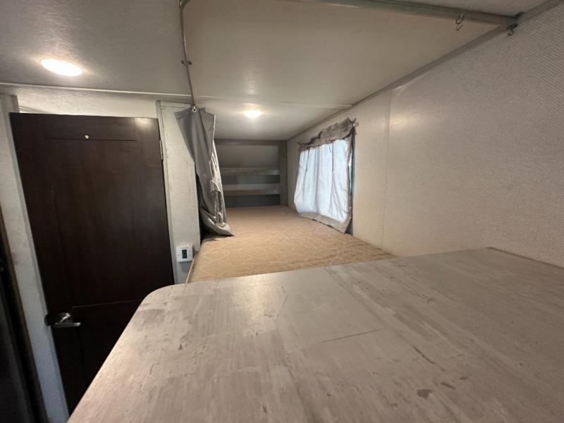 Your adventurous family will love the inside comforts in this unit featuring a set of 31" x 74" bunks for the kiddos, a queen bed for mom and dad, and a private shower and toilet room so everyone can keep clean and fresh while camped. You will find ample storage space for your things in the overhead spaces in front, as well as over the chaise style dinette. You can make meals with the stove-top and store leftovers in the refrigerator. There is also an exterior pass-through compartment accessible from either side for your larger items.
