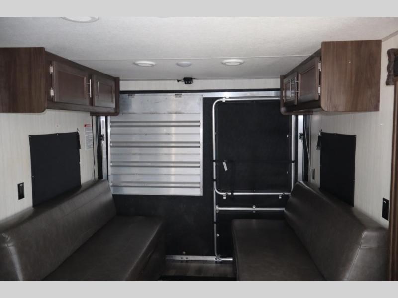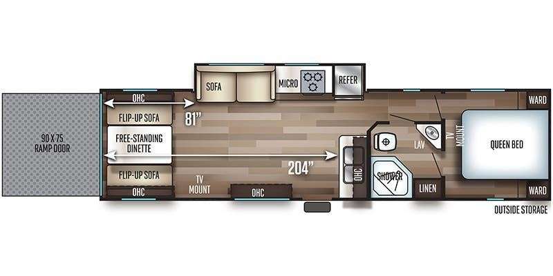 When your off-road toys are calling your name, load up this Cherokee toy hauler travel trailer through the ramp door and hit the road. Model 294RR offers 81" to 204" of cargo space for you toys and some! Once the toys are outside, it's time to enjoy the inside features. The combined living and kitchen area includes seating. The single slide out offers more interior walking around space, plus a sofa and the kitchen appliances. Don't worry about getting dirty because the full bath offers two entries, and everything you need to clean up for dinner. When the owner wants to relax, the private front bedroom is ready with a queen bed. It's time for off-road fun with the comforts of home in this Cherokee toy hauler!