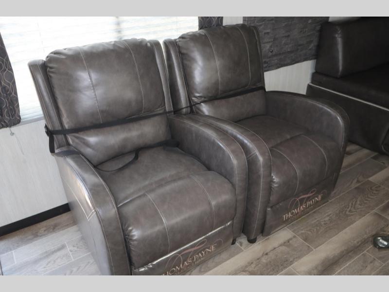 Toy hauler flexibility with a slide out living area, dual entry bath, and a private front queen bedroom.
