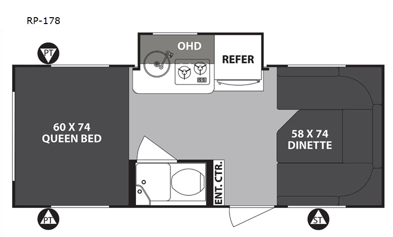 This R-Pod travel trailer by Forest River is a great camping unit for a family of four. You will enjoy the extra floor space thanks to the single slide. After you set up camp then come enjoy the comforts throughout this model, including a refrigerator and a two burner cooktop. You can eat your meals at the 58" x 74" u-dinette and if extra sleeping space is needed, then you can converts this area into a bed. At the rear of the unit there is a queen bed for a great nigh's rest. An added feature is the handy wet bath, plus there is a pass through storage!