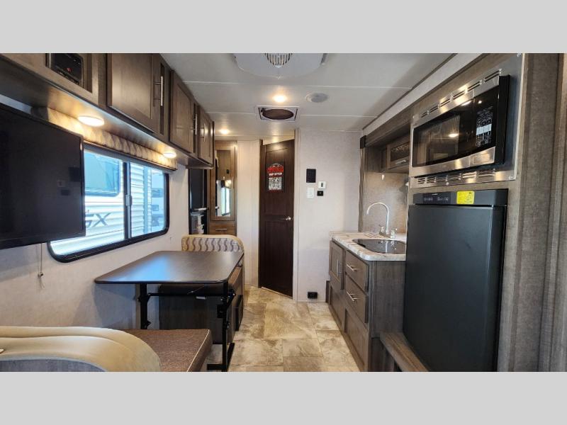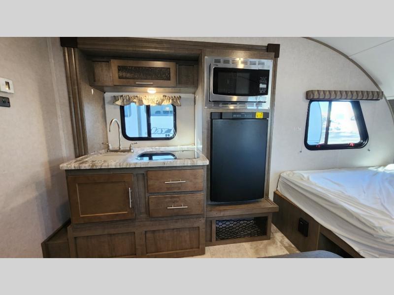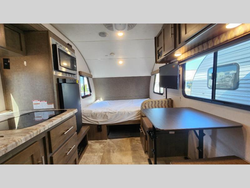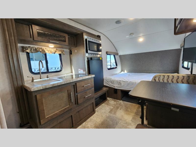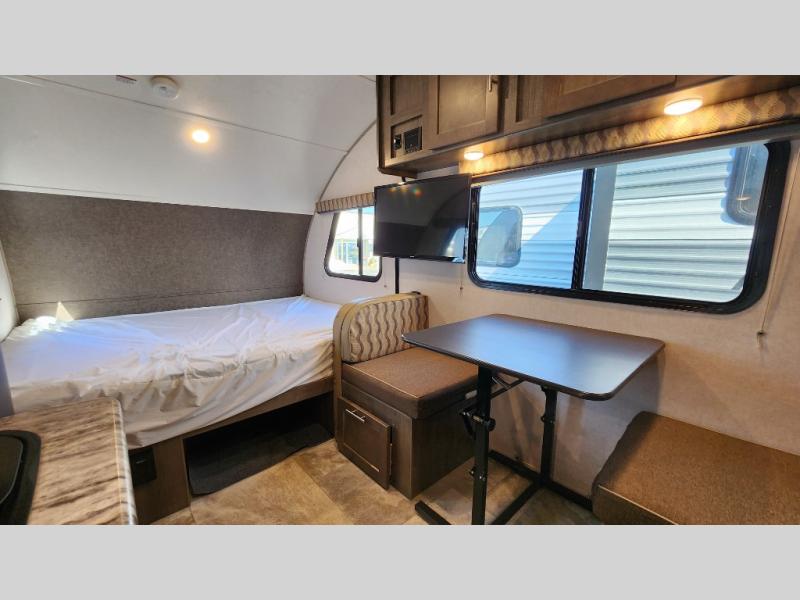 Get ready to travel just about anywhere with this lightweight R-Pod travel trailer! This model is ideal for any couple. There is sleeping space on the front queen bed and the 24" x 75" dinette can easily convert into a sleeping spot for a child. The slide out along the roadside helps open up the floor space, plus you will find all of the kitchen amenities here. The spacious full rear bath has plenty of room to easily get ready for any adventure that lies ahead. You will also enjoy all of the exterior storage for all of your outdoor camping gear! This unit also includes a TV for movie nights!