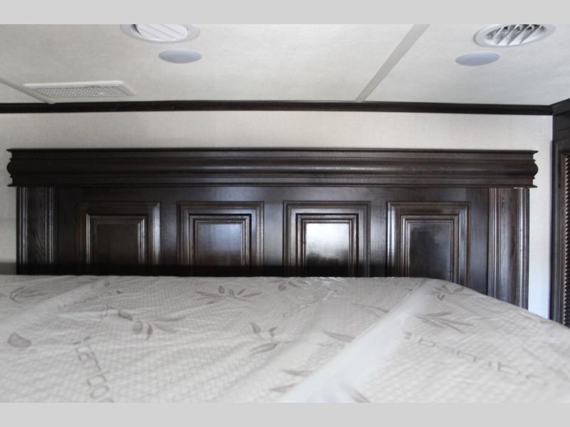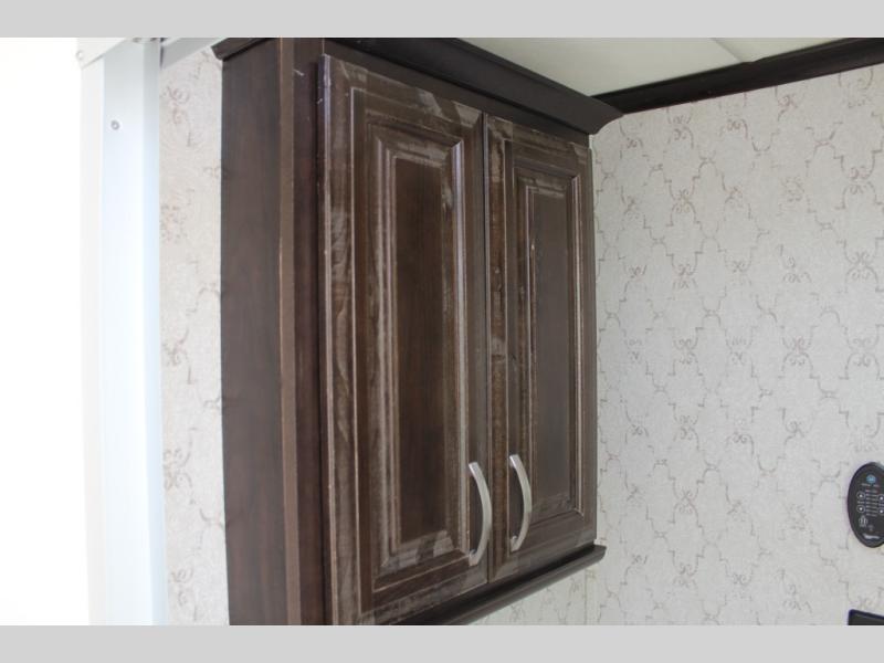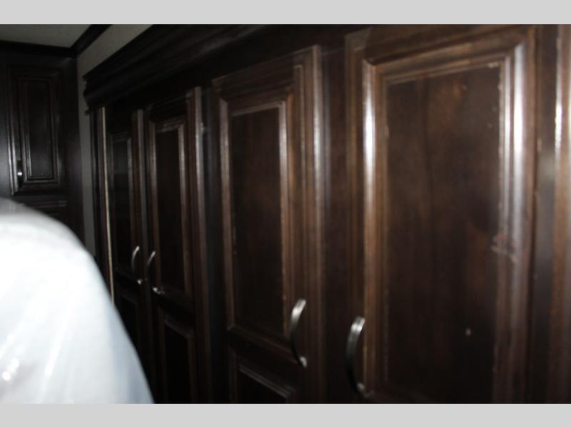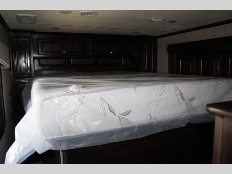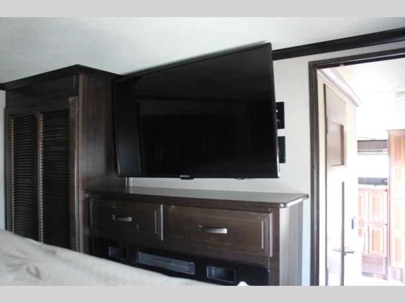 The rear bedroom has a king bed as well as a fireplace, a 32" TV, a wardrobe with overhead cabinets, and a washer/dryer so that you can have clean clothes throughout your entire trip. The bed is raised in these photos, as there is a rear garage space below!