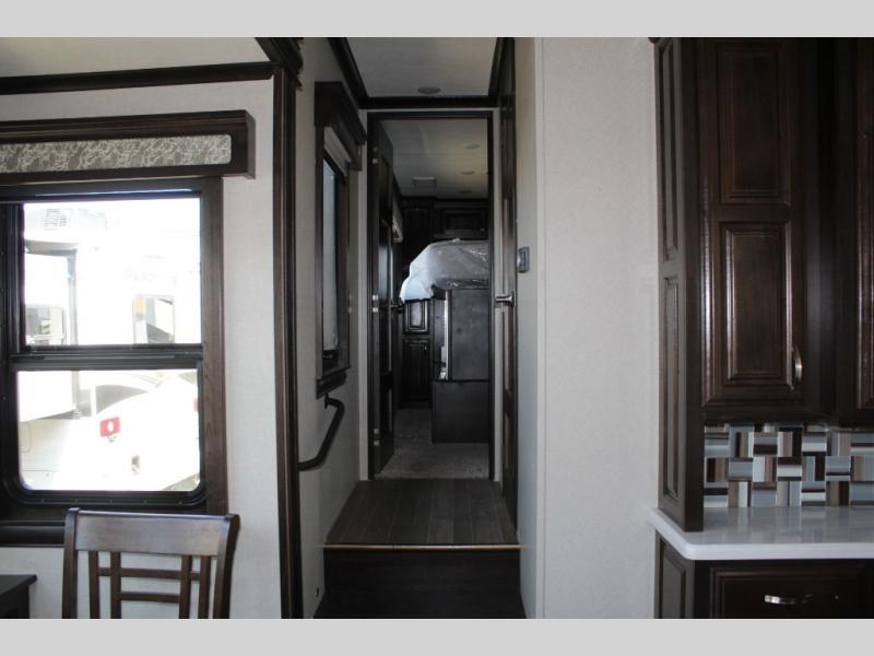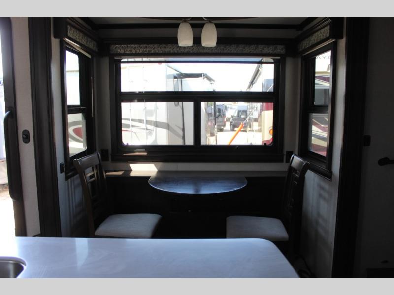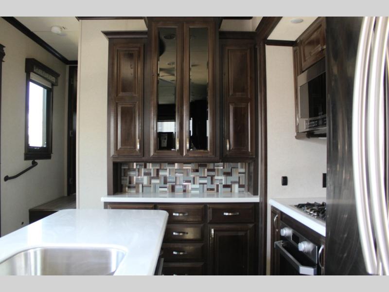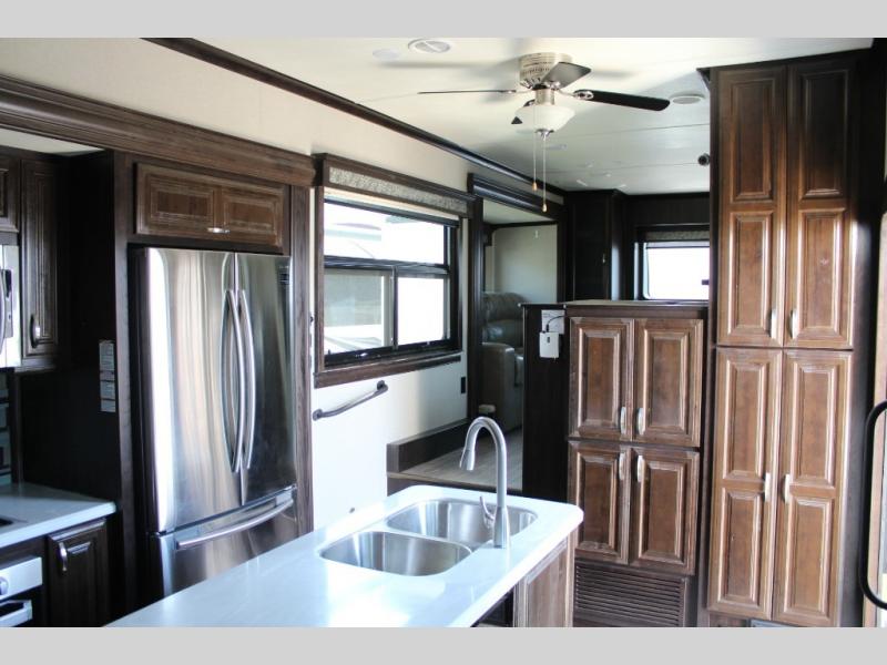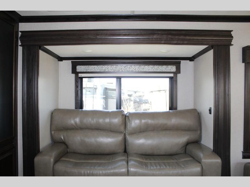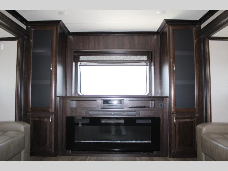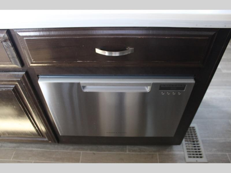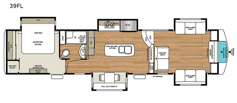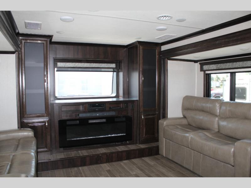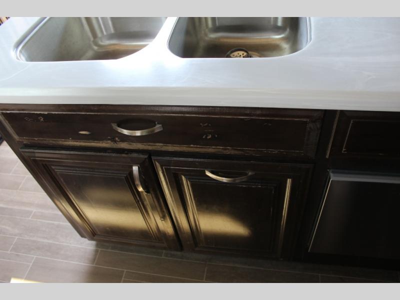Be prepared to be wowed from the minute you enter this Riverstone 39FLTH fifth wheel! You enter this model and find the kitchen area! In the kitchen clean up is so much easier with the double sink at the island plus the convenient touch of the dishwasher. Plan to eat your meals at the free-standing table or you can play a card game here after dinner! Following the kitchen towards the front living area featuring a set of theater seats and when the weather is cooler you will want to enjoy a fire in the fireplace.