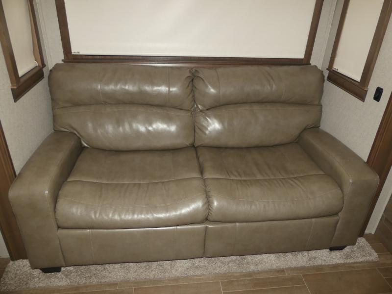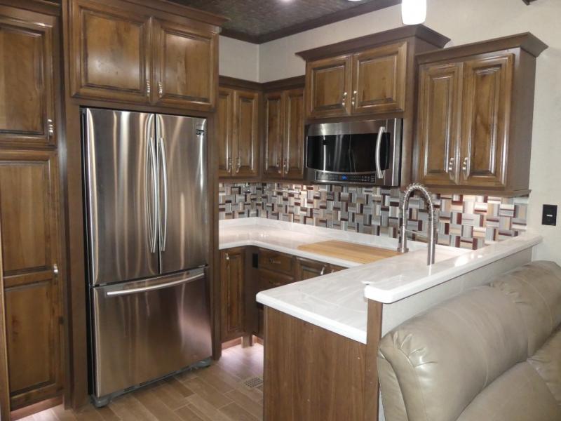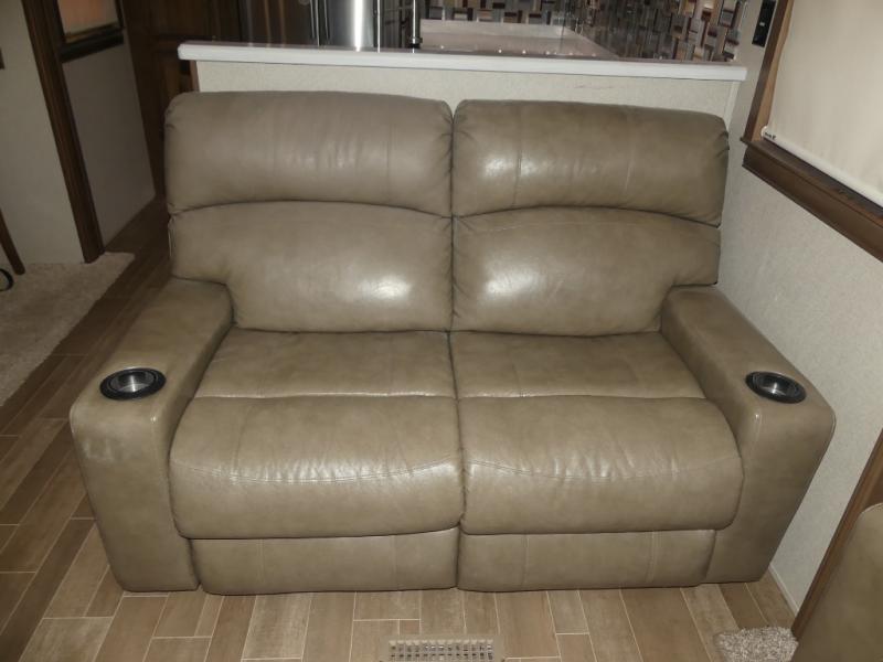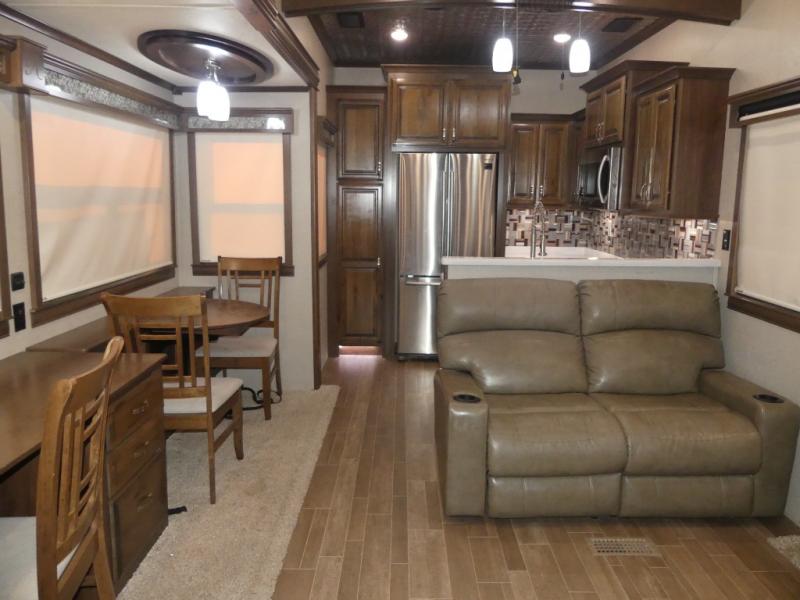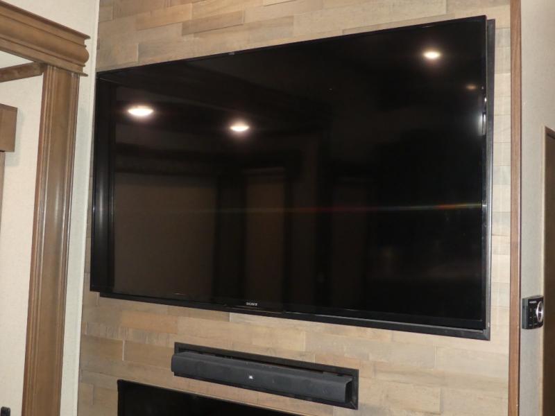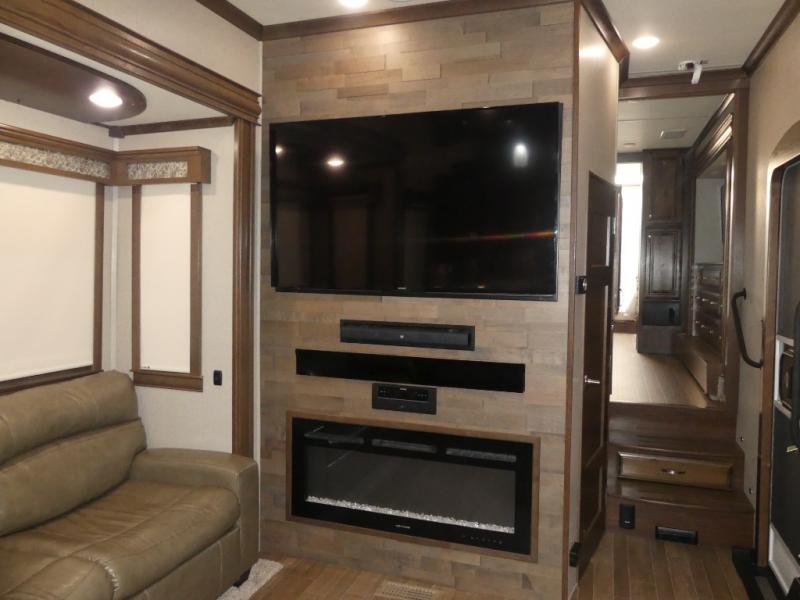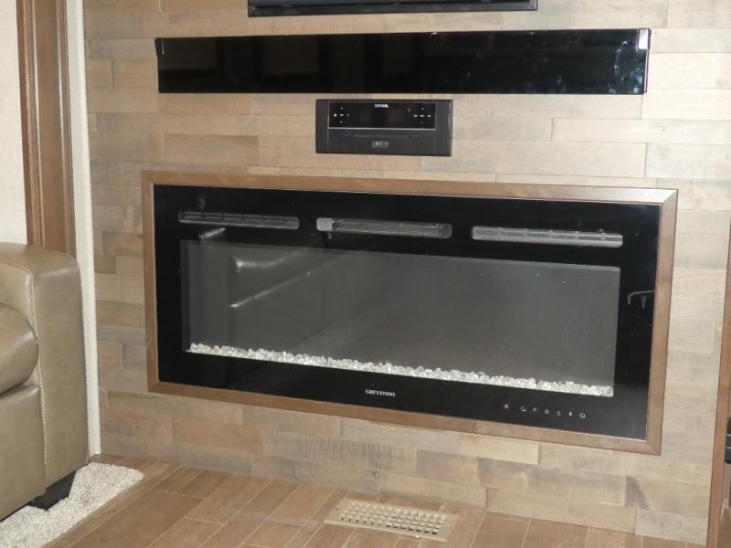 Be prepared for the ultimate fifth wheel with this RiverStone 39RKFB! With a rear kitchen which has plenty of counter space and overhead cabinets to the living area with a tri-fold sofa, theater seats with cupholders, and a fireplace plus a 60" LED smart TV with a premium sound bar and DVD player/stereo. Located near the entry door is the half bathroom with a washer and dryer so now you can easily keep up with any laundry while you are away from home. The front master bathroom is one many people only dream about. Here you will find two sinks, plus a walk-in closet with a bench and shelves and a linen closet. Inside the private bedroom there is a 10" thick memory foam king-size mattress for you to enjoy a good night's rest, a dresser, and a 43" TV for you to watch your favorite movies in true comfort!