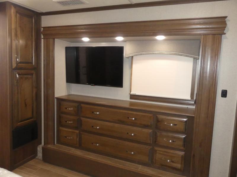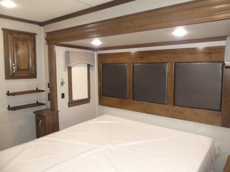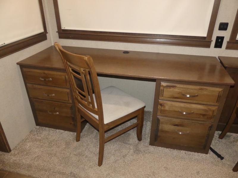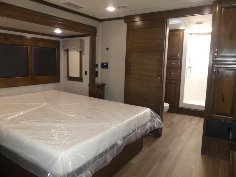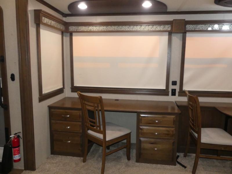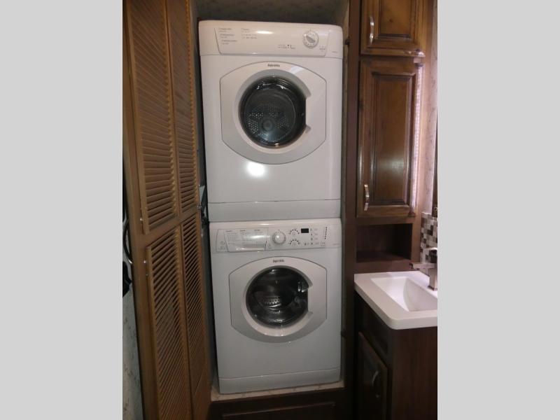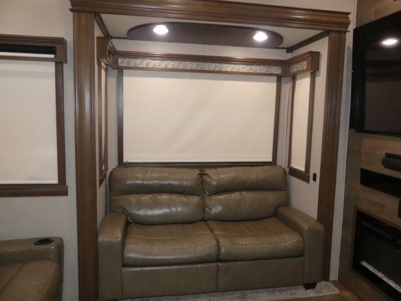 Be prepared for the ultimate fifth wheel with this RiverStone 39RKFB! With a rear kitchen which has plenty of counter space and overhead cabinets to the living area with a tri-fold sofa, theater seats with cupholders, and a fireplace plus a 60" LED smart TV with a premium sound bar and DVD player/stereo. Located near the entry door is the half bathroom with a washer and dryer so now you can easily keep up with any laundry while you are away from home. The front master bathroom is one many people only dream about. Here you will find two sinks, plus a walk-in closet with a bench and shelves and a linen closet. Inside the private bedroom there is a 10" thick memory foam king-size mattress for you to enjoy a good night's rest, a dresser, and a 43" TV for you to watch your favorite movies in true comfort!