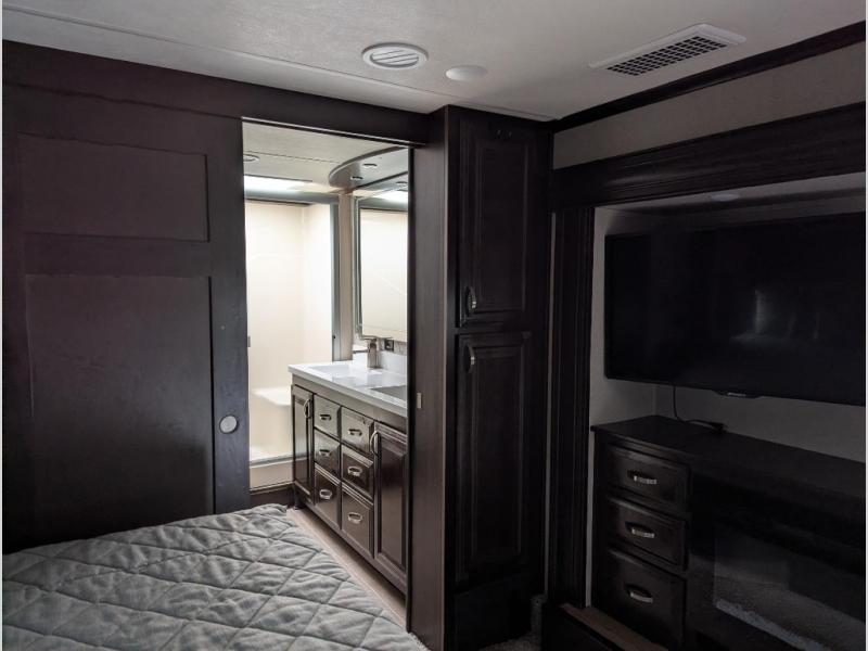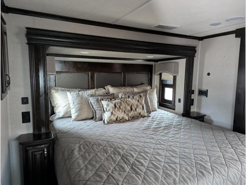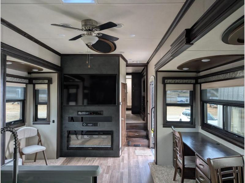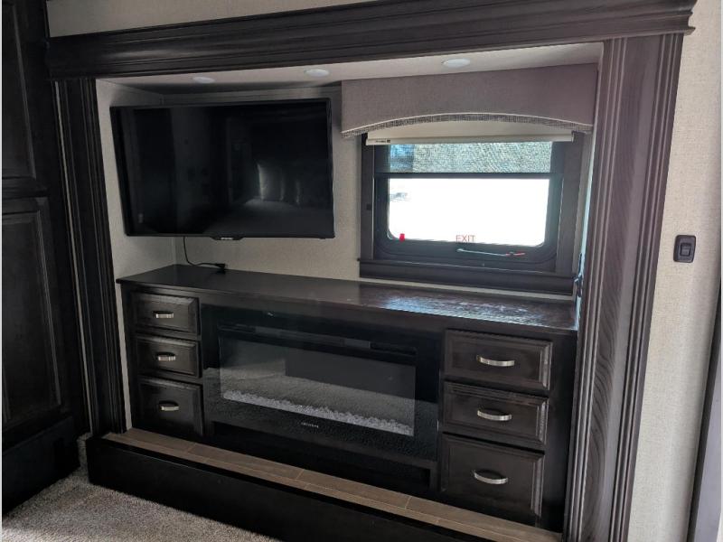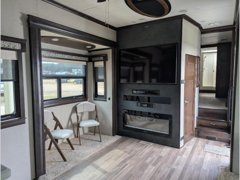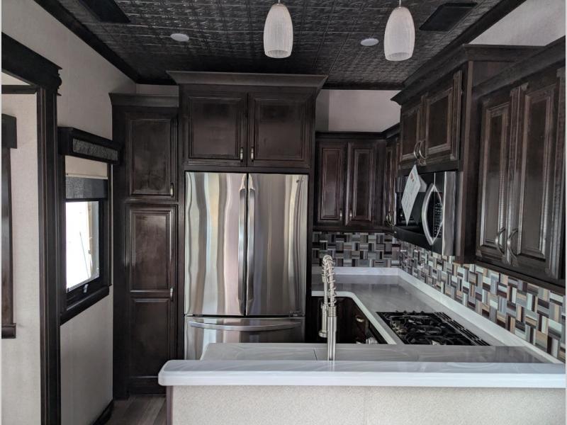 Be prepared for the ultimate fifth wheel with this RiverStone 39RKFB! With a rear kitchen which has plenty of counter space and overhead cabinets to the living area with a tri-fold sofa, theater seats with cupholders, and a fireplace plus a 60" LED smart TV with a premium sound bar and DVD player/stereo. Located near the entry door is the half bathroom with a washer and dryer so now you can easily keep up with any laundry while you are away from home. The front master bathroom is one many people only dream about. Here you will find two sinks, plus a walk-in closet with a bench and shelves and a linen closet. Inside the private bedroom there is a 10" thick memory foam king-size mattress for you to enjoy a good night's rest, a dresser, and a 43" TV for you to watch your favorite movies in true comfort!