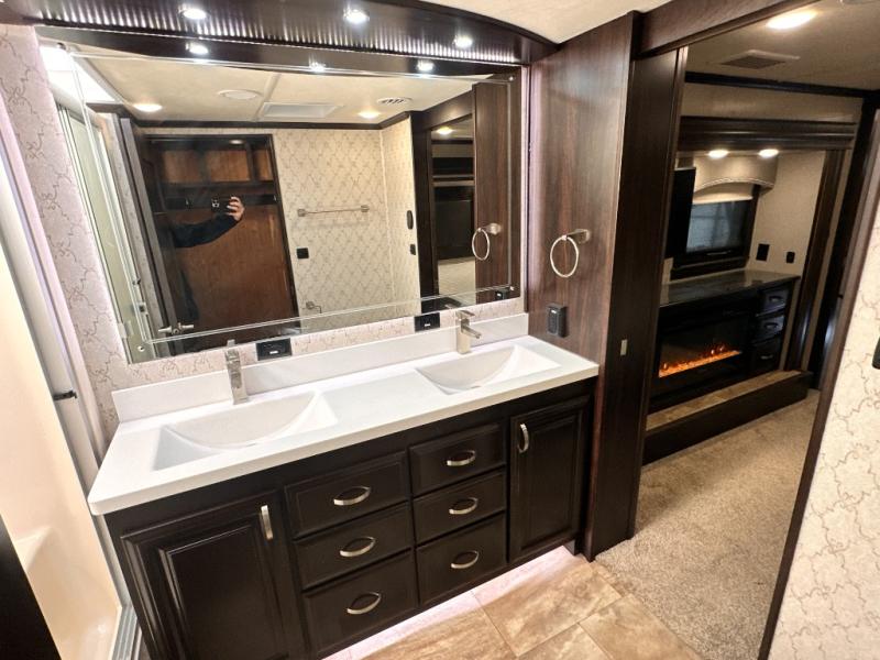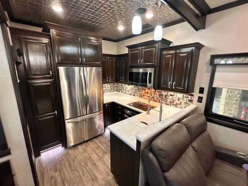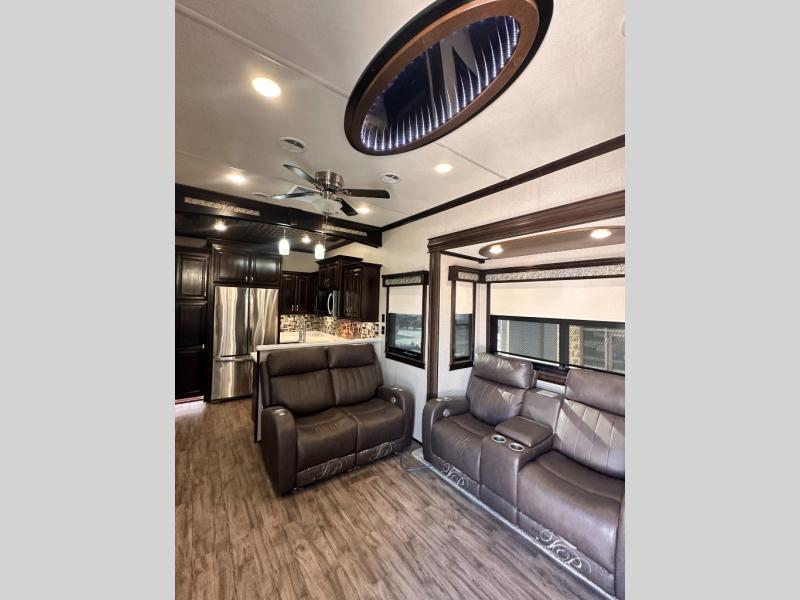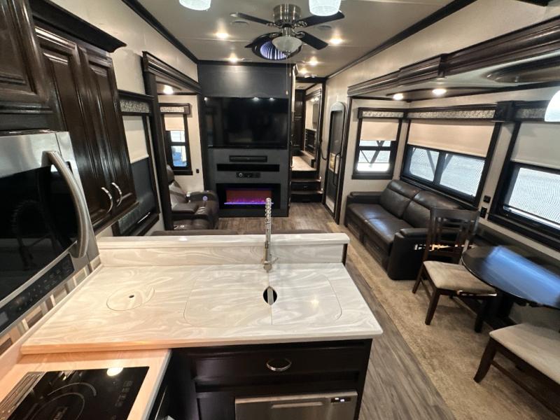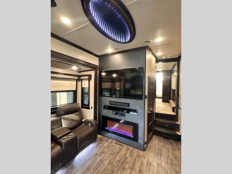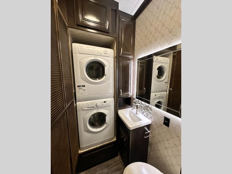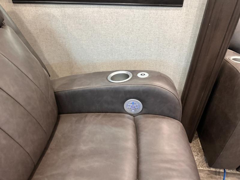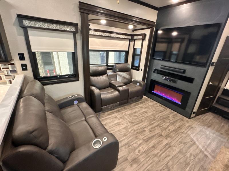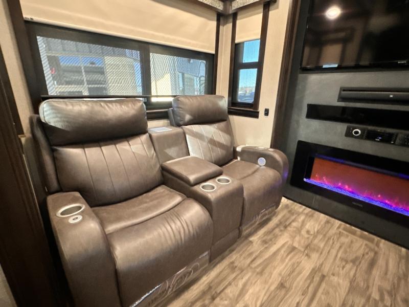 Be prepared for the ultimate fifth wheel with this RiverStone 39RKFB! With a rear kitchen which has plenty of counter space and overhead cabinets to the living area with a tri-fold sofa, theater seats with cupholders, and a fireplace plus a 60" LED smart TV with a premium sound bar and DVD player/stereo. Located near the entry door is the half bathroom with a washer and dryer so now you can easily keep up with any laundry while you are away from home. The front master bathroom is one many people only dream about. Here you will find two sinks, plus a walk-in closet with a bench and shelves and a linen closet. Inside the private bedroom there is a 10" thick memory foam king-size mattress for you to enjoy a good night's rest, a dresser, and a 43" TV for you to watch your favorite movies in true comfort!