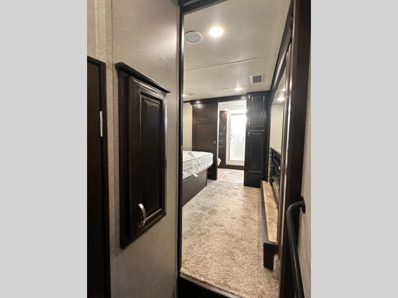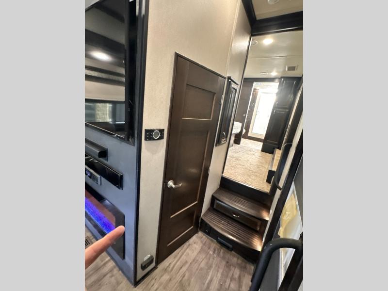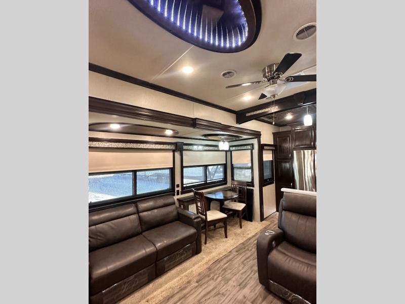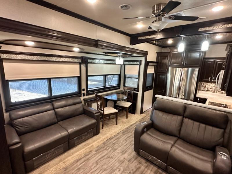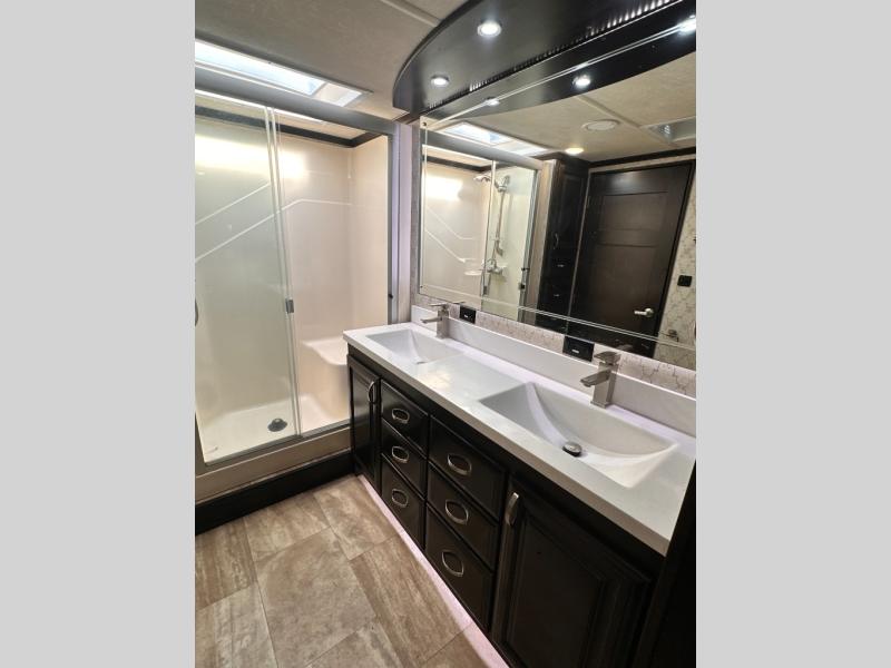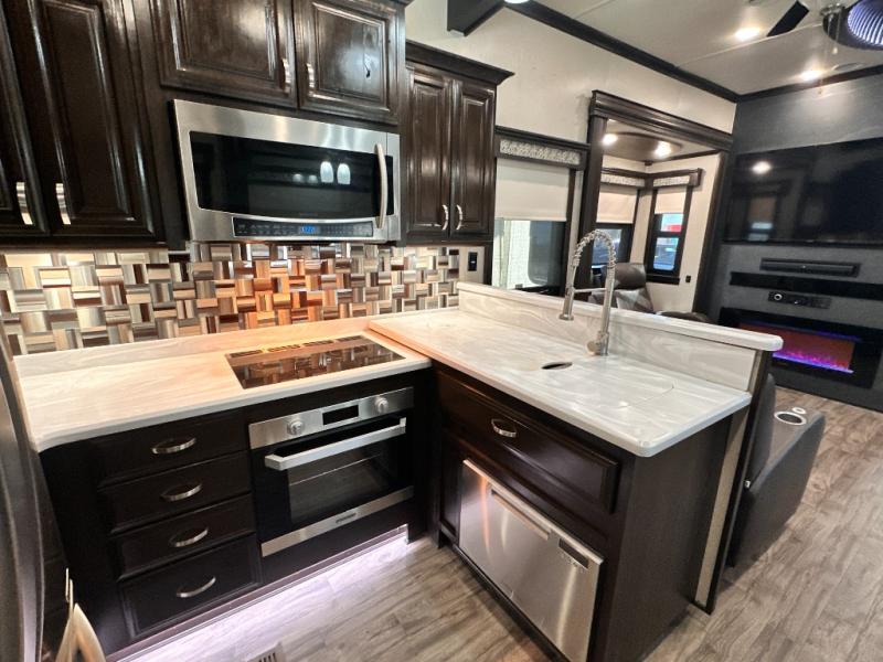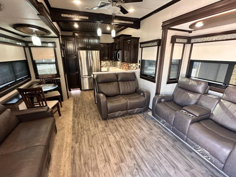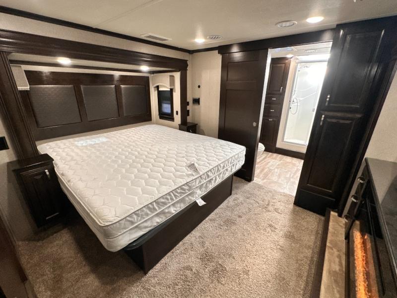 Be prepared for the ultimate fifth wheel with this RiverStone 39RKFB! With a rear kitchen which has plenty of counter space and overhead cabinets to the living area with a tri-fold sofa, theater seats with cupholders, and a fireplace plus a 60" LED smart TV with a premium sound bar and DVD player/stereo. Located near the entry door is the half bathroom with a washer and dryer so now you can easily keep up with any laundry while you are away from home. The front master bathroom is one many people only dream about. Here you will find two sinks, plus a walk-in closet with a bench and shelves and a linen closet. Inside the private bedroom there is a 10" thick memory foam king-size mattress for you to enjoy a good night's rest, a dresser, and a 43" TV for you to watch your favorite movies in true comfort!
