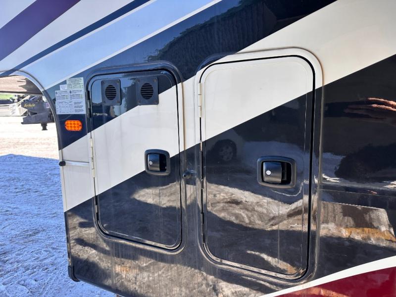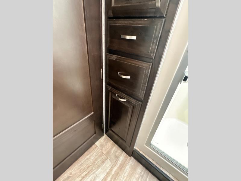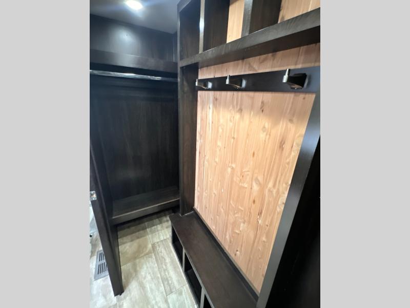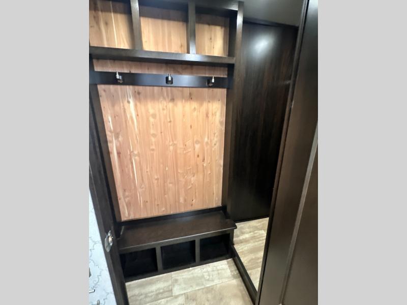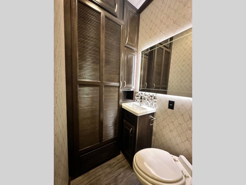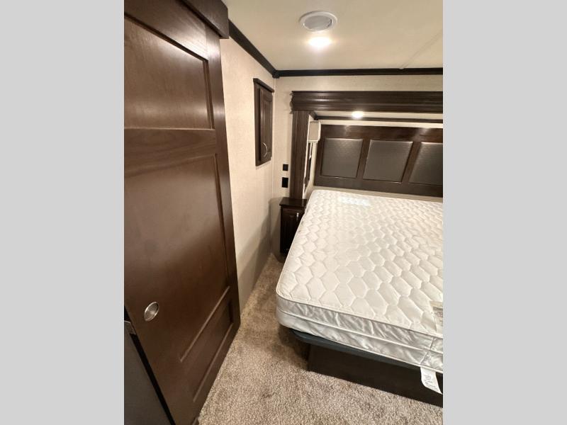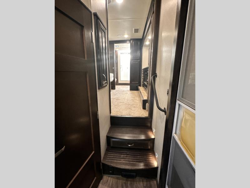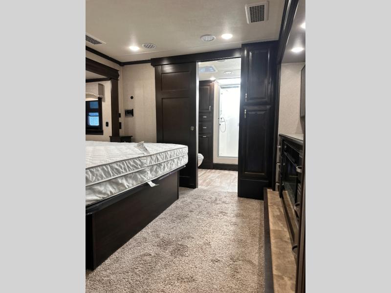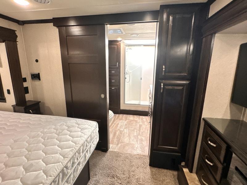 Be prepared for the ultimate fifth wheel with this RiverStone 39RKFB! With a rear kitchen which has plenty of counter space and overhead cabinets to the living area with a tri-fold sofa, theater seats with cupholders, and a fireplace plus a 60" LED smart TV with a premium sound bar and DVD player/stereo. Located near the entry door is the half bathroom with a washer and dryer so now you can easily keep up with any laundry while you are away from home. The front master bathroom is one many people only dream about. Here you will find two sinks, plus a walk-in closet with a bench and shelves and a linen closet. Inside the private bedroom there is a 10" thick memory foam king-size mattress for you to enjoy a good night's rest, a dresser, and a 43" TV for you to watch your favorite movies in true comfort!