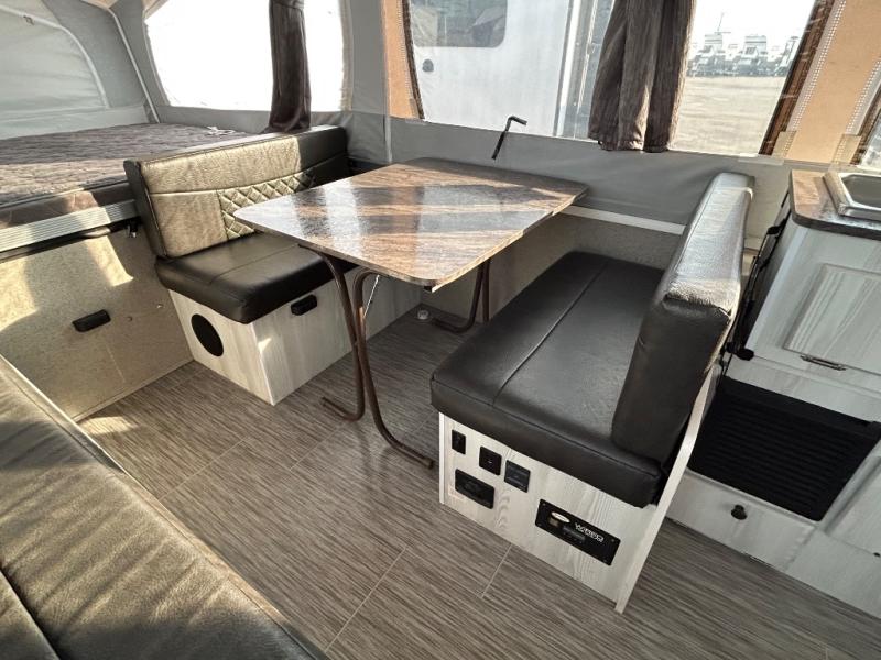 Forest River's Rockwood Freedom Series tent campers make time spent with family and friends exactly what it should be - relaxing, enjoyable and easy to do! These units offer luxurious features from home such as the quilted top mattresses, the residential style cabinet doors, wood drawers with full extension metal guides, and the leather appearance seating, plus the wood look flooring throughout. Each unit has kitchen amenities for you to whip up your best meals like the permanently mounted 3-burner indoor range with cover and the 3 way 1.9 cu. ft. refrigerator. They also feature a one piece fiberglass vacuum bonded fiberglass roof with a metal interior ceiling, a one-piece undercoated structure wood floor, a five piece sectionalized Vinolon Supreme tenting, full perimeter aluminum bed frames, and tinted vinyl windows.