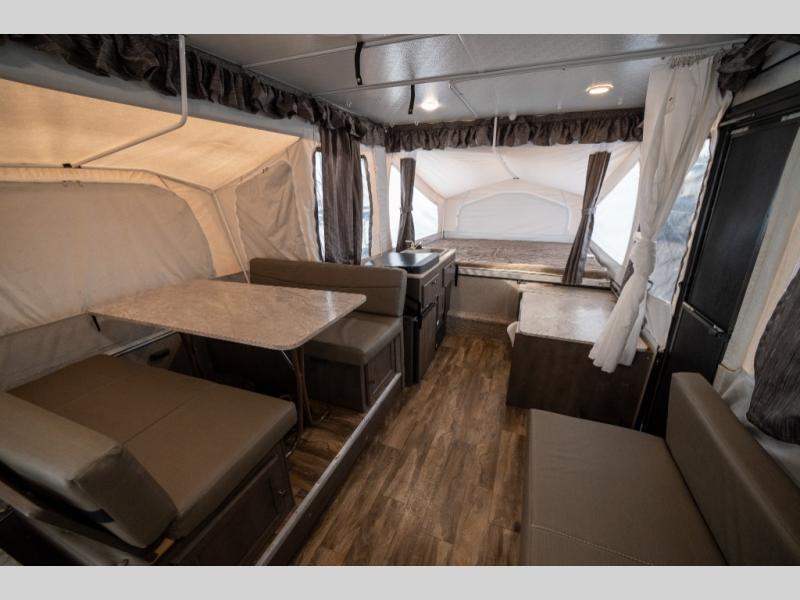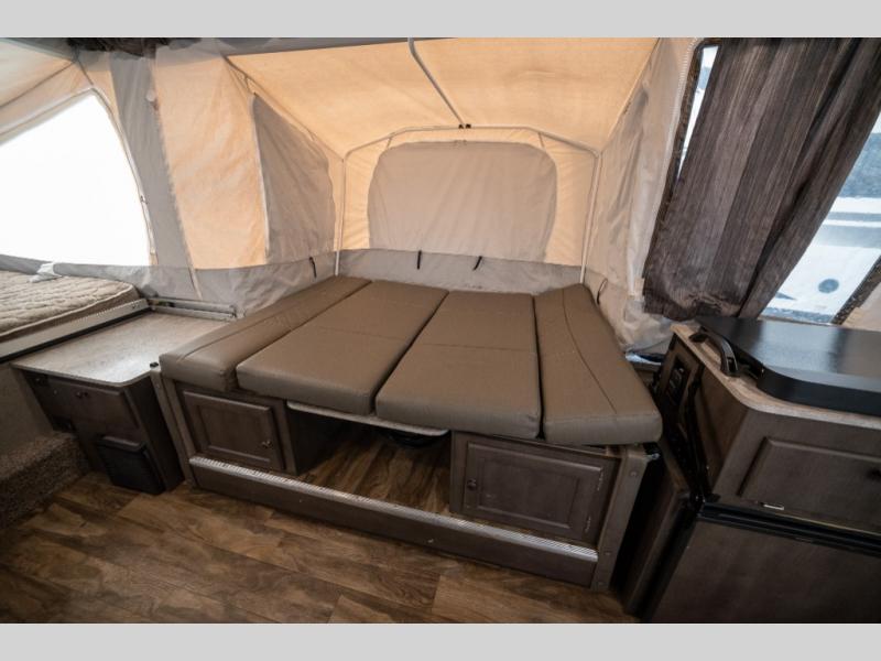 Forest River's Rockwood Freedom Series tent campers make time spent with family and friends exactly what it should be - relaxing, enjoyable and easy to do! These units offer luxurious features from home such as the quilted top mattresses, the residential style cabinet doors, wood drawers with full extension metal guides, and the leather appearance seating, plus the wood look flooring throughout. Each unit has kitchen amenities for you to whip up your best meals like the permanently mounted 3-burner indoor range with cover and the 3 way 1.9 cu. ft. refrigerator. They also feature a one piece fiberglass vacuum bonded fiberglass roof with a metal interior ceiling, a one-piece undercoated structure wood floor, a five piece sectionalized Vinolon Supreme tenting, full perimeter aluminum bed frames, and tinted vinyl windows.