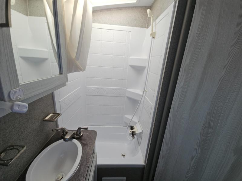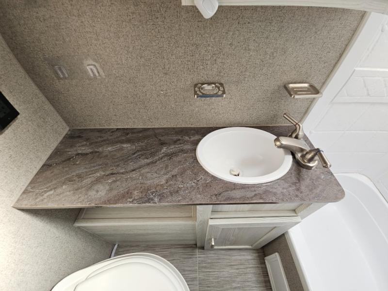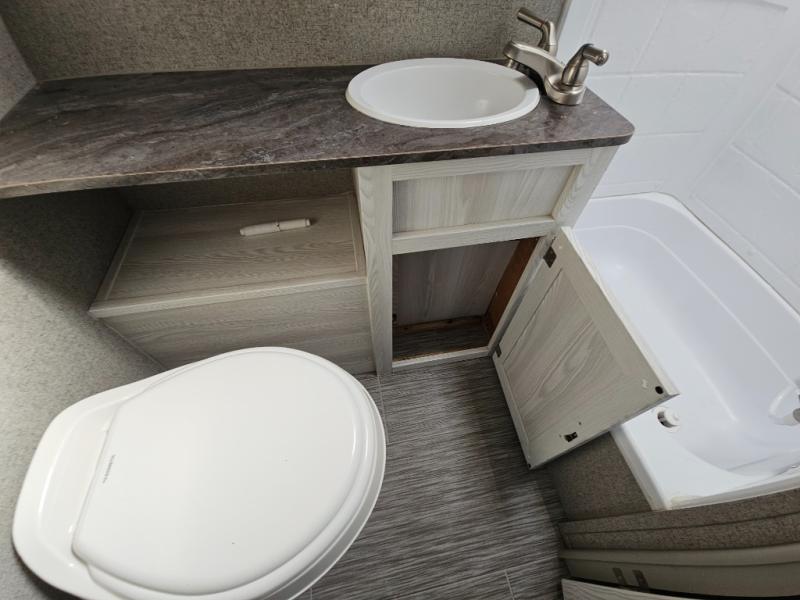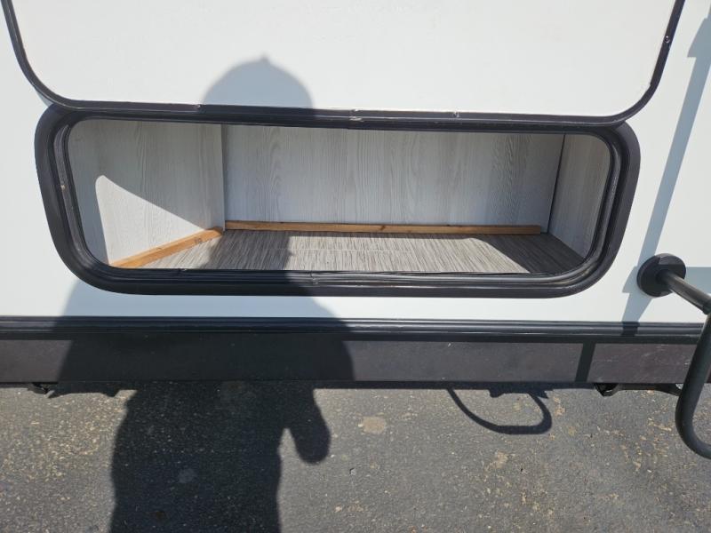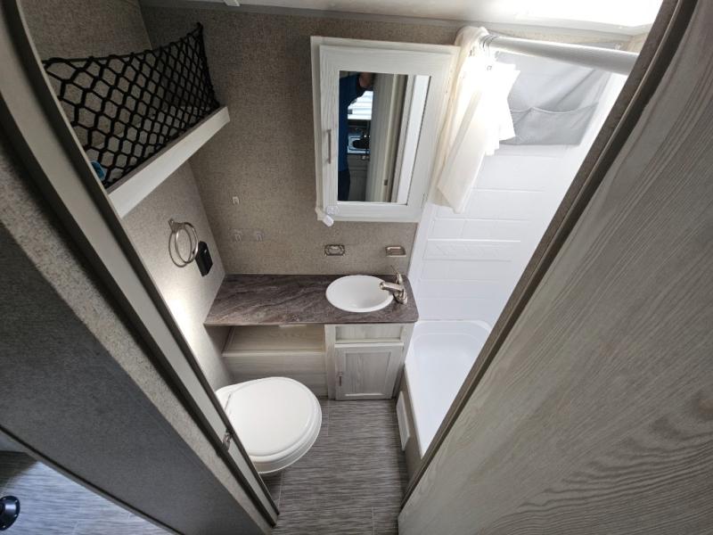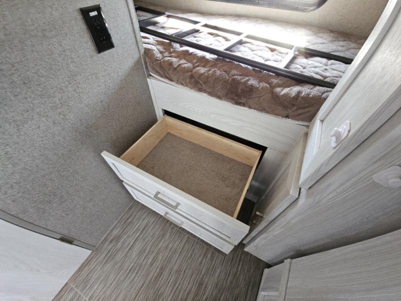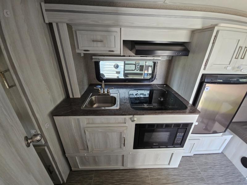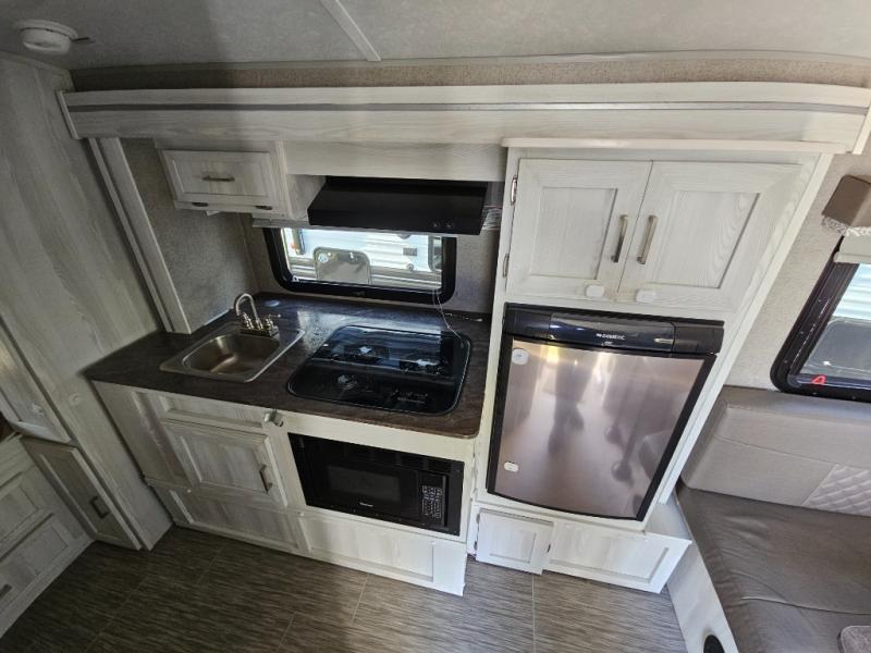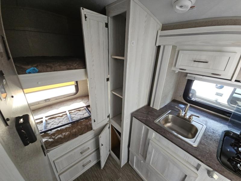 For the camping enthusiast that enjoys inside comforts but also loves to explore the great outdoors, take a look at this Rockwood Geo Pro travel trailer! You have the choice of sleeping on one of the bunk beds or the U-shaped dinette when it's folded down for the night. You can cook all of your meals inside with the microwave and recessed cooktop with flush-mount cover, or you can head outside to the outdoor kitchen to whip up a meal. The full bathroom allows you to wash up after a fun day outdoors without having to use the campsite's facilities, and you will find plenty of space to store all of your camping gear with interior overhead cabinets, as well as the exterior storage compartments.
