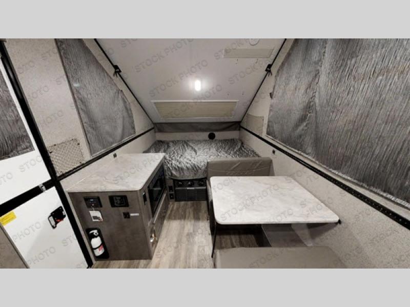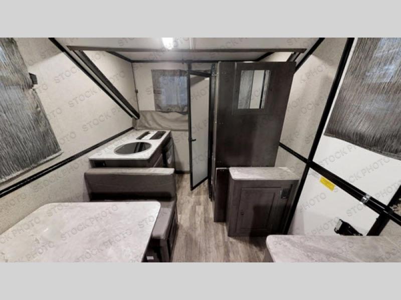 In any Forest River Rockwood Hard Side pop-up camper you will find the perfect product for your camping adventure. These units offer plenty of luxurious features from home such as a WiFi range booster, AM/FM stereo with Bluetooth USB ports, stainless steel look appliances, and a Slatewood interior with wood look flooring and leather appearance seating. The exterior construction consists of a one piece vacuum bonded fiberglass roof with a metal interior ceiling, a one piece undercoated structure wood floor, and an E-coated tubular steel frame, plus there are four E-Z crank-down stabilizer jacks with sand pads. You will also love the privacy this camper provides with the privacy curtains throughout, the two front roof tinted windows with shade, and the large rear roof tinted sky light with shade, plus there is a large, opening picture window for you to enjoy your scenery.