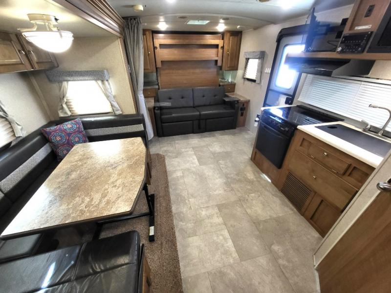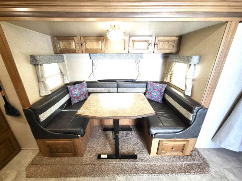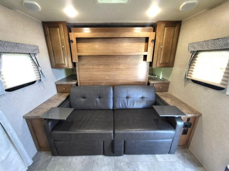 If you have been searching for a travel trailer with a front bedroom, a U-shaped dinette slide out, and a rear bath then take a look inside this Rockwood Mini Lite by Forest River. You have plenty of storage options in this unit between the interior wardrobes, linen closets, kitchen pantry, shelving, and the exterior pass-through storage, plus additional exterior storage. There is a Murphy bed for you to enjoy a good night's rest on and during the day it can be used for extra seating when transformed into the sofa. Outside you will find a 15' power awning with an adjustable rain dump and LED lights for those late night gatherings, and a gas grill for grilling up your best burger, plus a rear ladder that will come in handy!