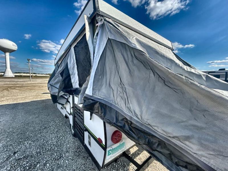 Inside comforts await you in this tent camper such as a shower with cassette toilet allowing you to stay refreshed and ready for any outdoor fun. Inside the you can make meals, sleep on the queen and king tent end mattresses or on the furniture once folded down for the evening, and play games at the U-shaped dinette slide out. There are several exterior storage compartments outside for extra camping gear such as chairs to place under the 13' awning, and you can store cold food in the exterior refrigerator, and grill hot dogs on the gas grill or on your campfire. Start making memories with your family!