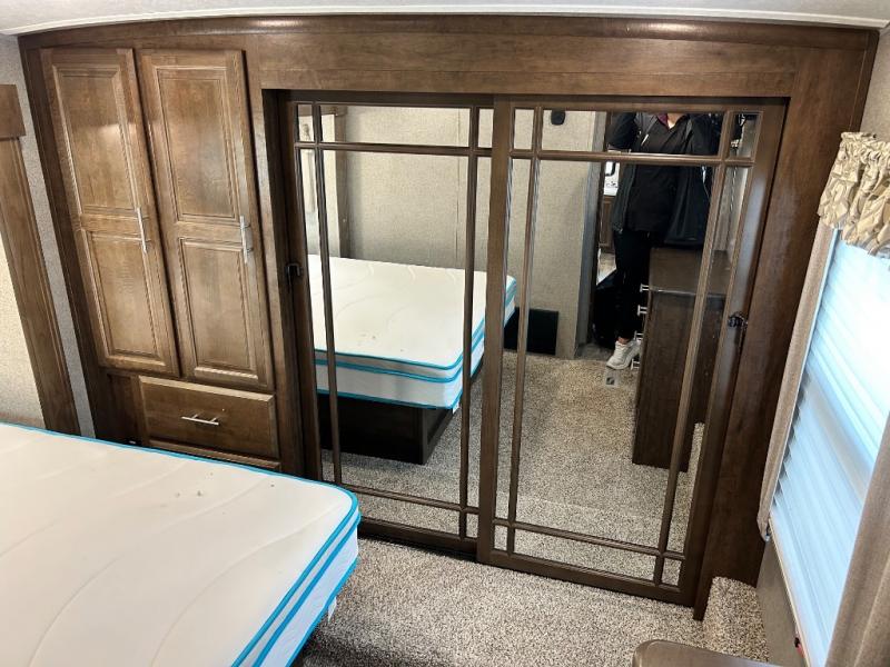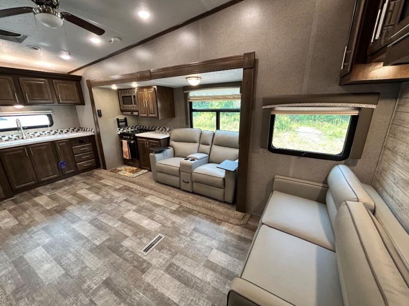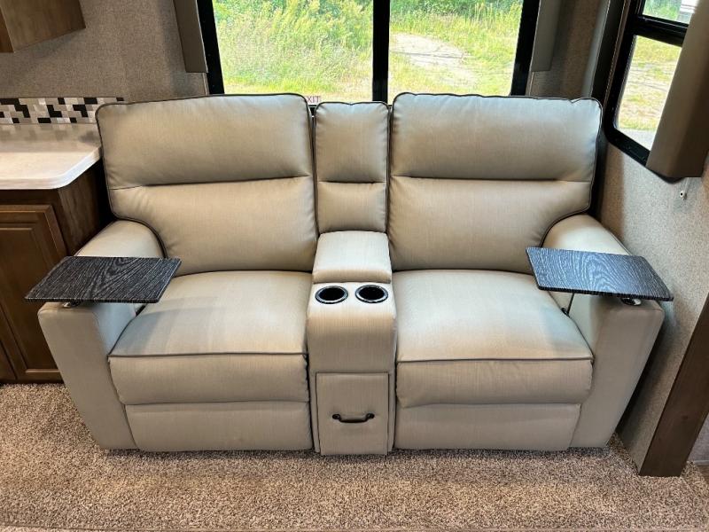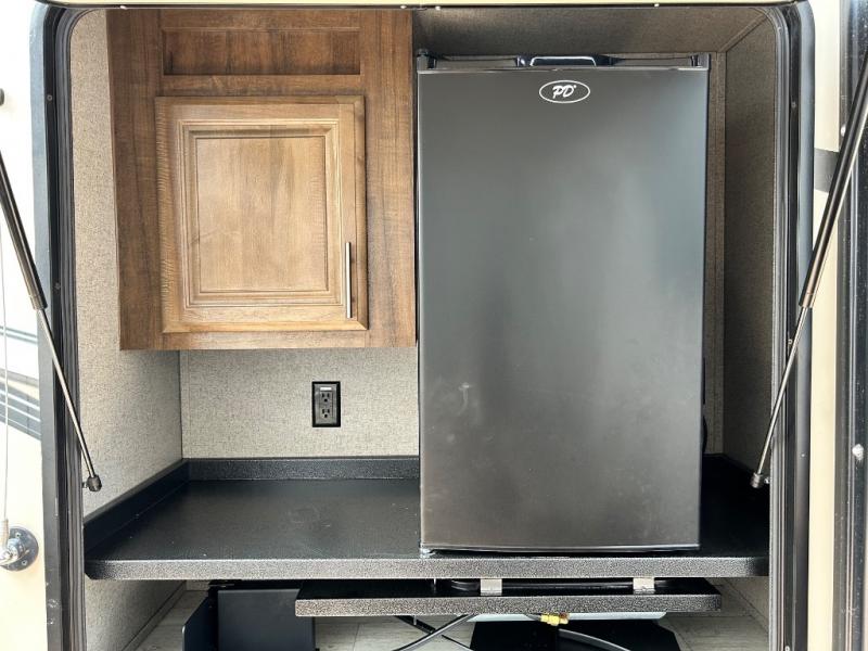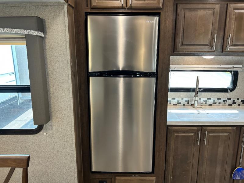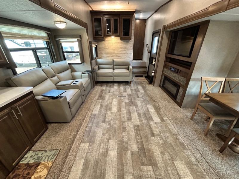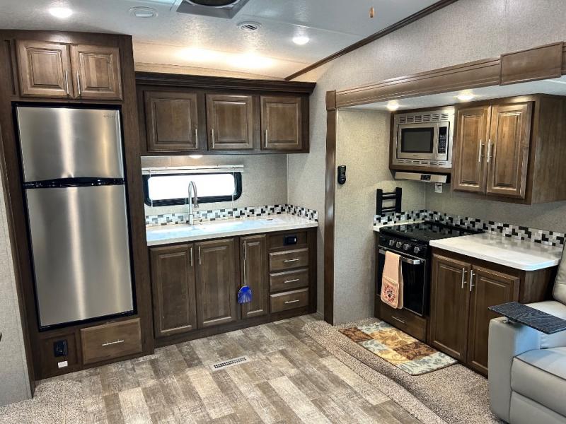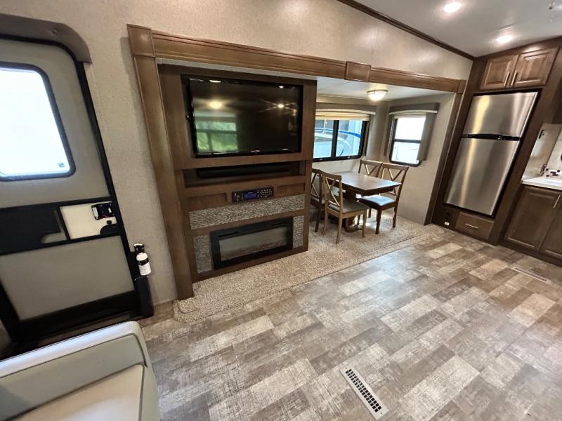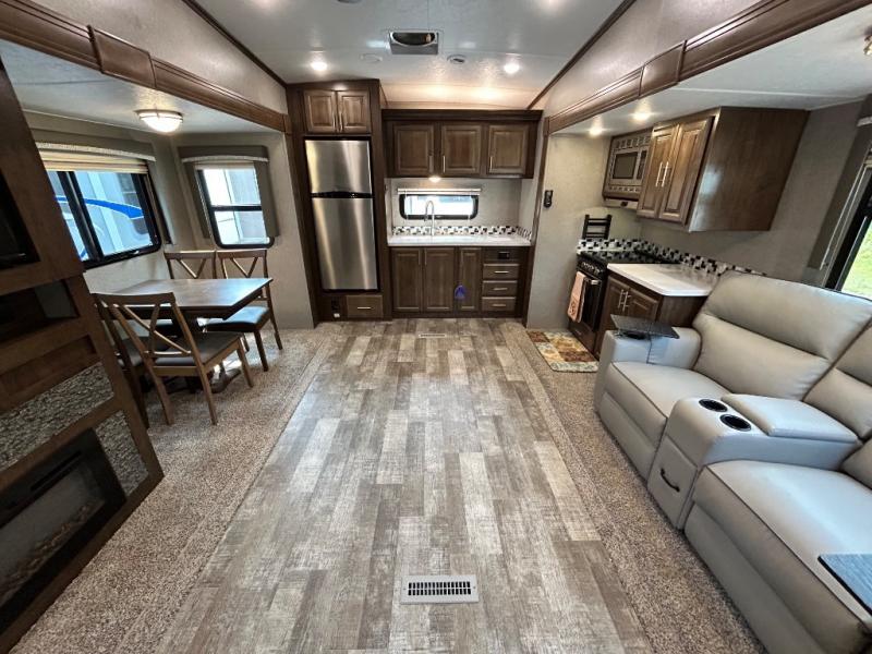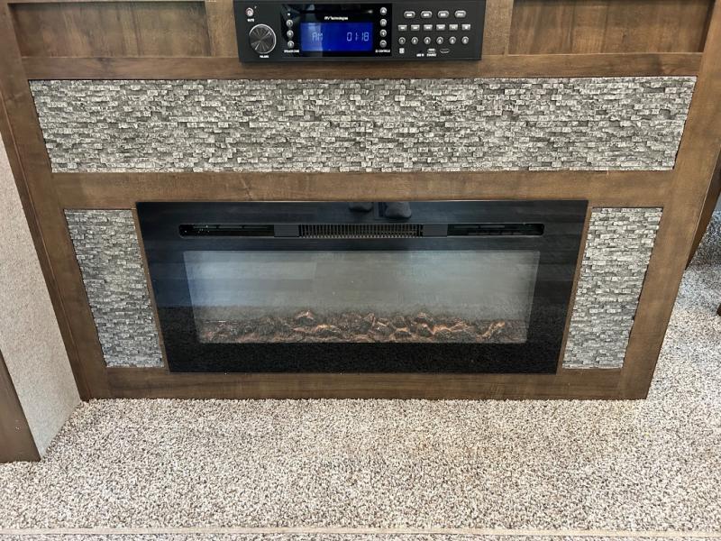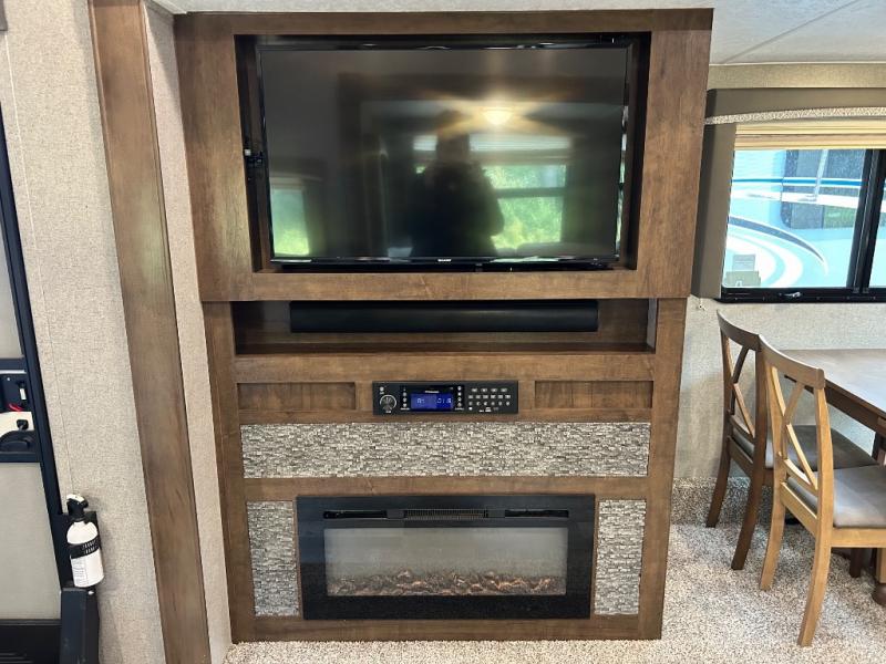Plan your next camping trip with this triple slide out fifth wheel that will fit your family perfectly. Meal prep will be a breeze, whether it's inside or outside since this model features an indoor kitchen as well as an outdoor kitchen! The exterior kitchen features a refrigerator, a swing out stove, and an overhead cabinet. Inside toward the rear of this model is the kitchen with a double door refrigerator, a three burner range, a pantry, plus a microwave for quick meals. In the evenings plan to relax on the theater seats and watch a little TV or enjoy a fire in the fireplace. This unit features a bath with a 60"x 30" walk-in shower with a skylight. In the front bedroom you will find a Serta queen bed and plenty of storage with a dresser and shirt closet. There is even a spot in the bedroom that has been prepped for an optional washer and dryer!