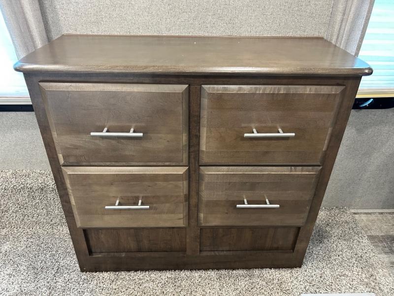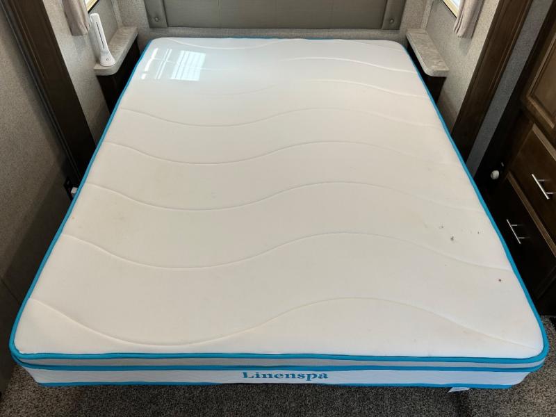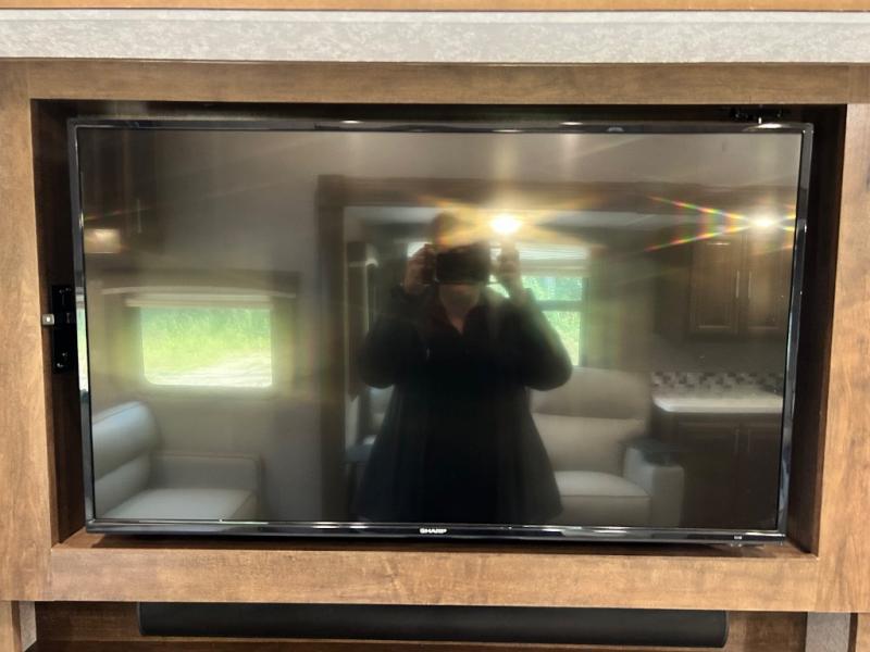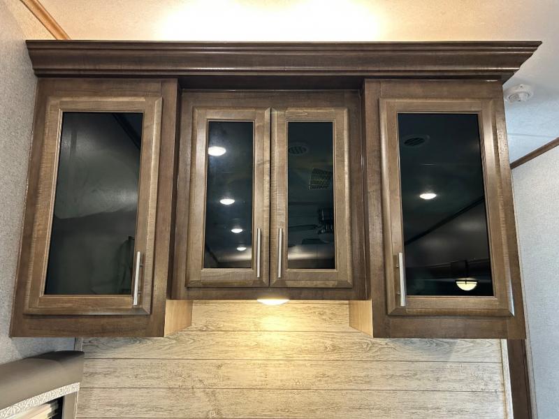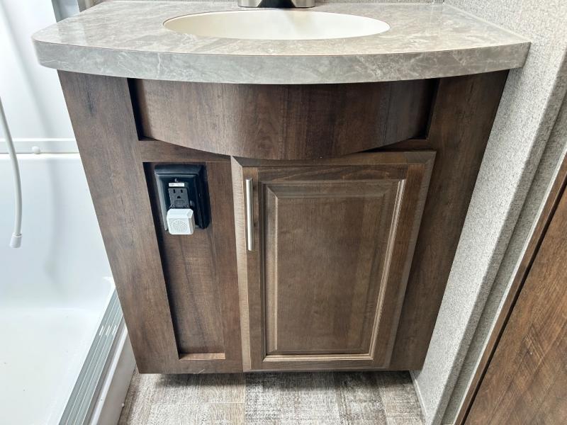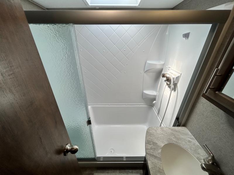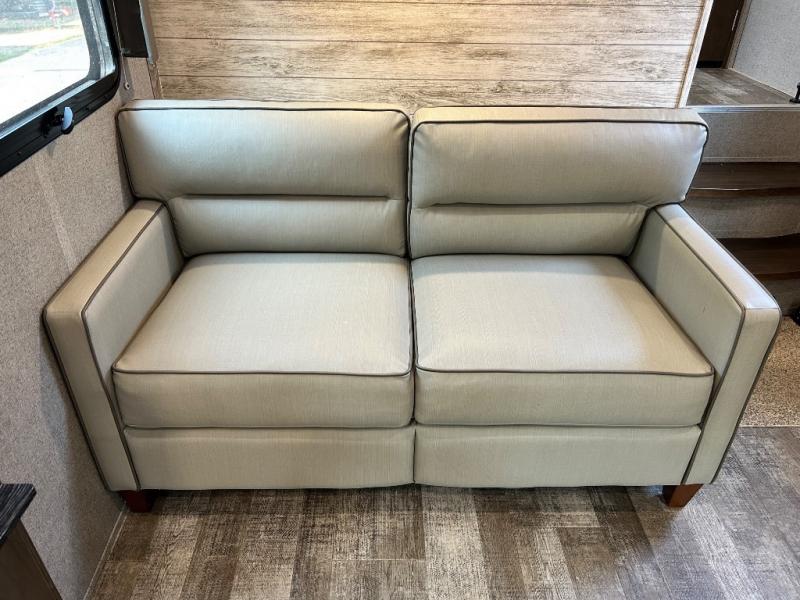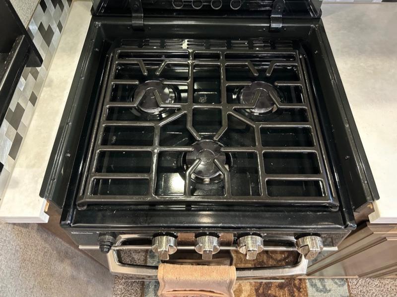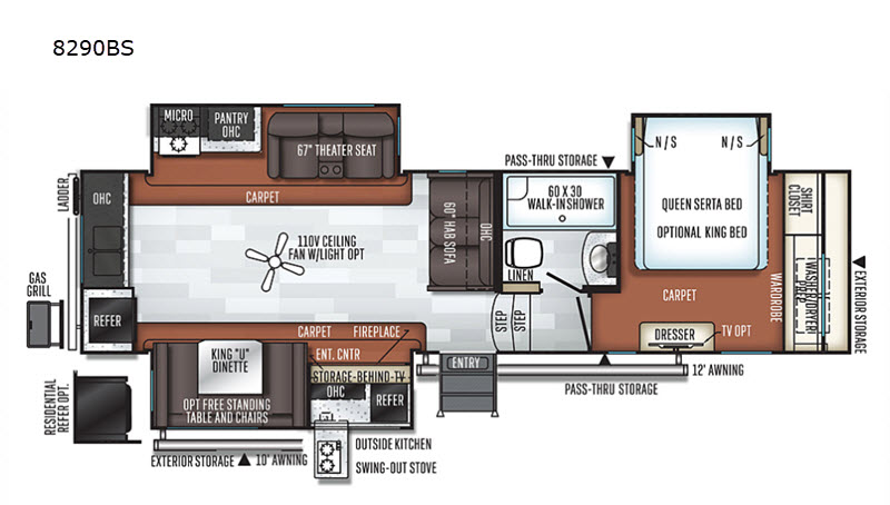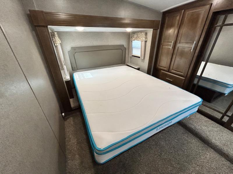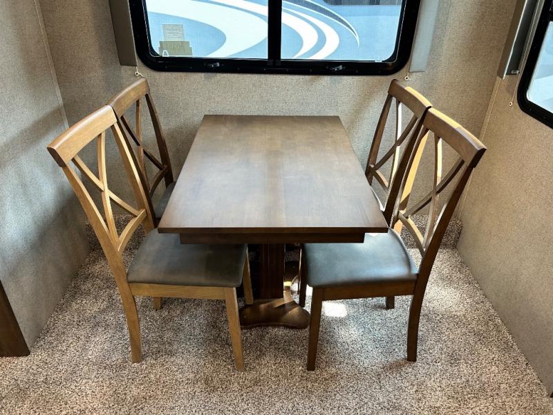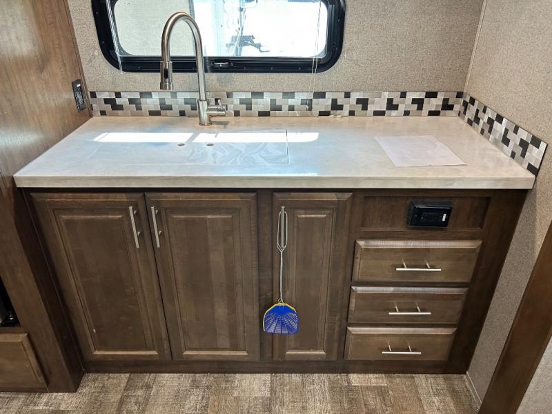 Plan your next camping trip with this triple slide out fifth wheel that will fit your family perfectly. Meal prep will be a breeze, whether it's inside or outside since this model features an indoor kitchen as well as an outdoor kitchen! The exterior kitchen features a refrigerator, a swing out stove, and an overhead cabinet. Inside toward the rear of this model is the kitchen with a double door refrigerator, a three burner range, a pantry, plus a microwave for quick meals. In the evenings plan to relax on the theater seats and watch a little TV or enjoy a fire in the fireplace. This unit features a bath with a 60"x 30" walk-in shower with a skylight. In the front bedroom you will find a Serta queen bed and plenty of storage with a dresser and shirt closet. There is even a spot in the bedroom that has been prepped for an optional washer and dryer!