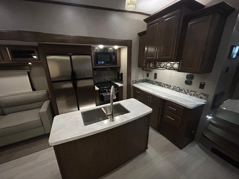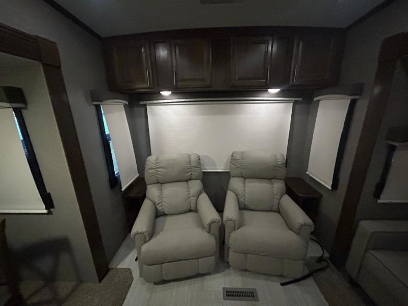 Plan to do some camping and a whole lot of relaxing with this fifth wheel. See just how easy it is to fix your favorite meals for your family in this kitchen. There is plenty of space to work, plus the kitchen island features a double sink and extra counter space. Come relax in the living area that features a hide-a-bed sofa plus there are two recliners along the rear wall or you can choose the optional Lazy Boy chairs. Within the slide out along the curbside there is a corner entertainment center with a fireplace. In the front bedroom you will find a Serta queen bed, a wardrobe that has been prepped for a washer and dryer, plus you can add an optional TV. Outside there are two awnings which offer plenty of shade, and at night you can turn on the LED lights, grab your lawn chairs, and fire up the outside gas grill for hot dogs!