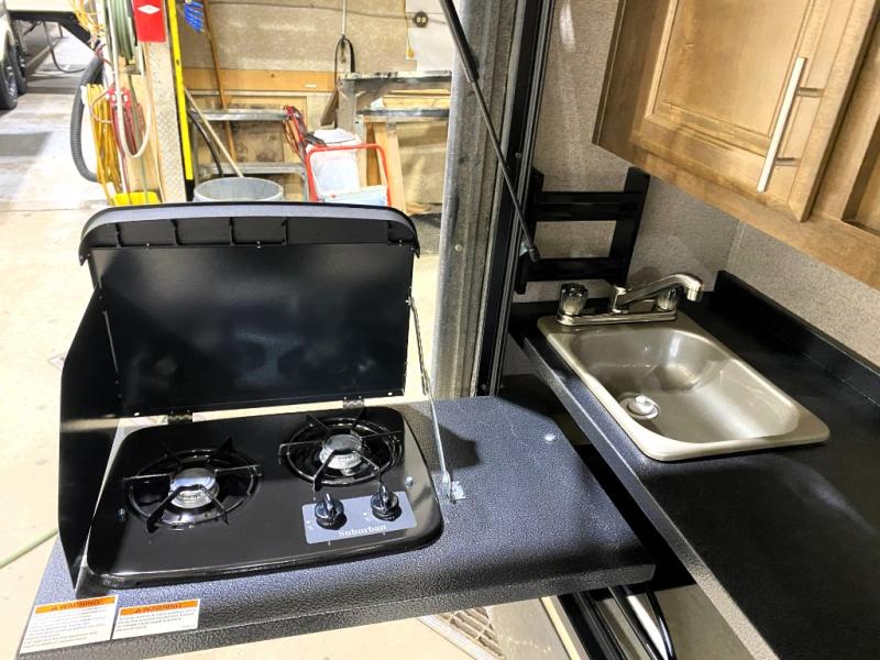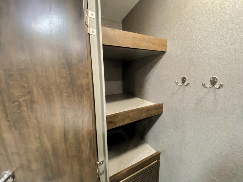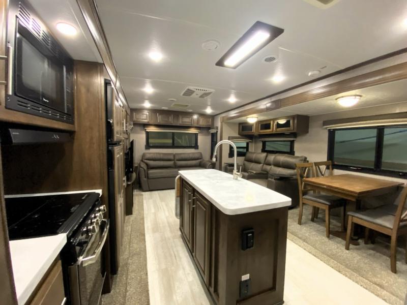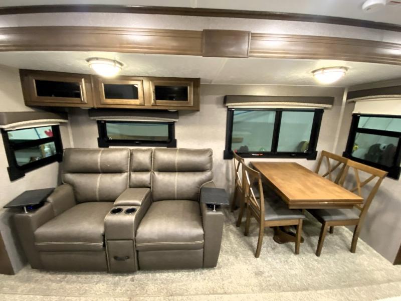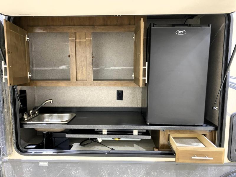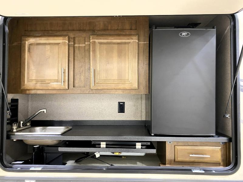 When you choose to camp with this travel trailer, the question to be asked over and over is, "Can we camp longer?" There are plenty of modern conveniences throughout this model such as an indoor full size kitchen with a kitchen island and a counter-top extension. Come relax in the rear living area. Here you will find a 76" hide-a-bed sofa along the rear wall, and within a slide out there is 67" theater seating with cup holders. Outside there are two awnings which provide plenty of shade and protection as you fix a meal or snack at the outdoor kitchen. This unit also includes a free standing table and chairs, a pantry for your dry goods, plus an exterior storage for all your gear!