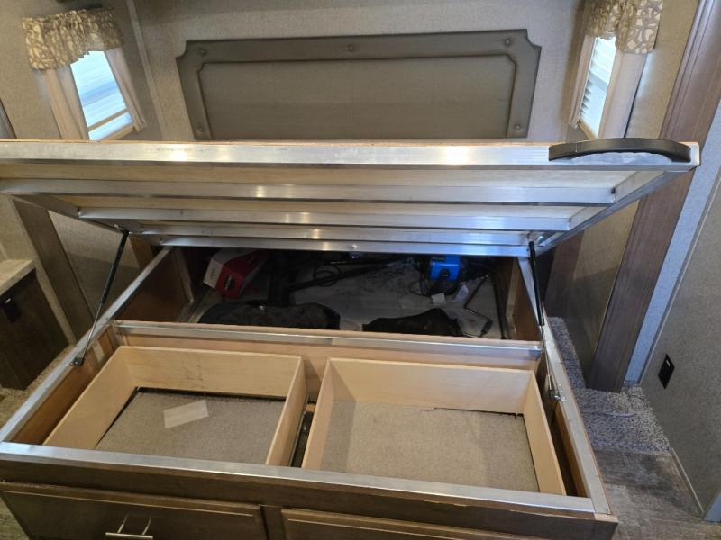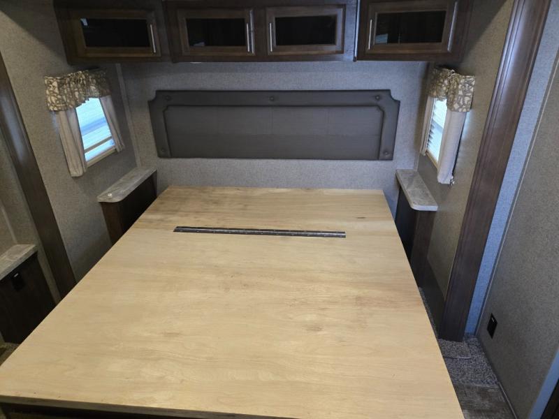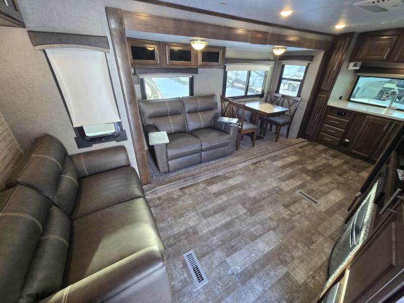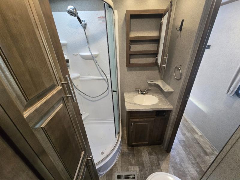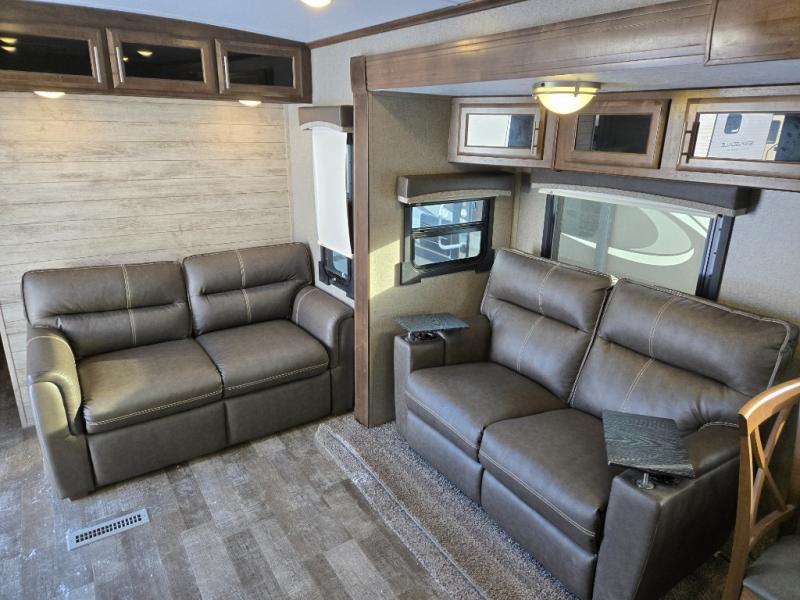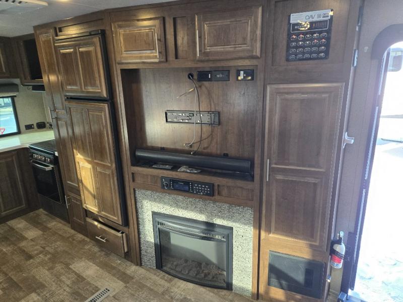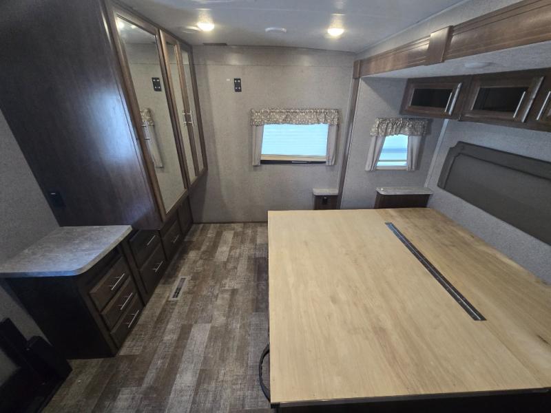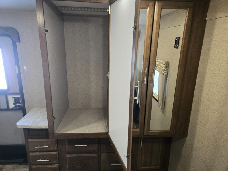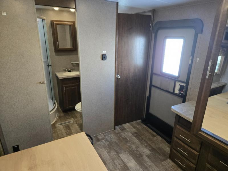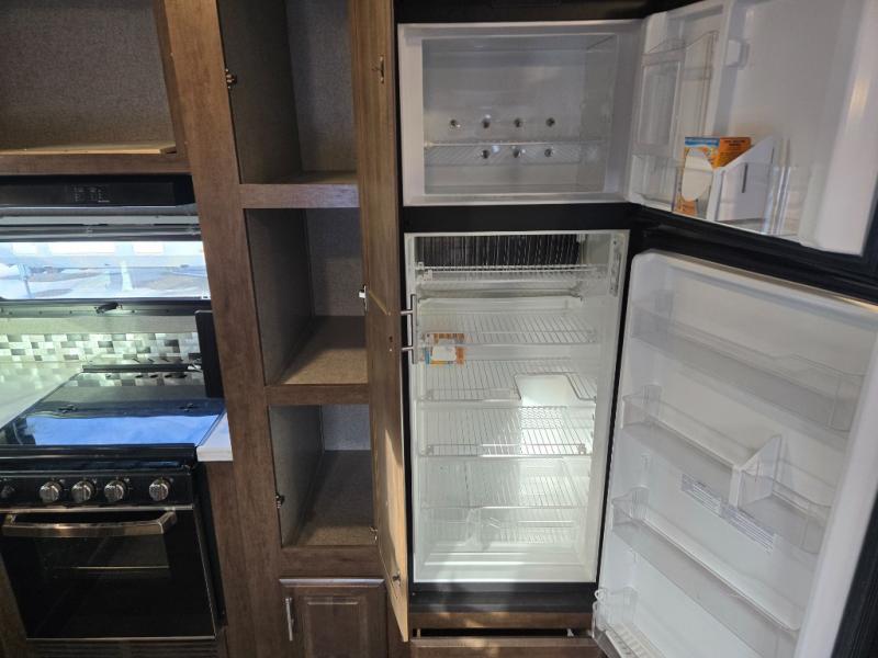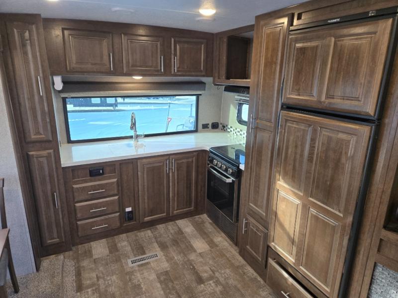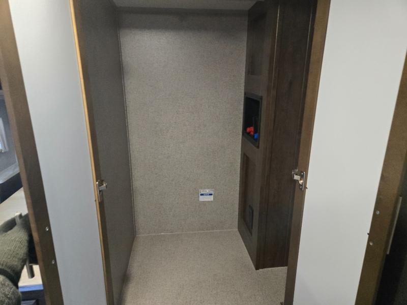 From the two entry doors, to the two slide outs, you will enjoy all of the conveniences throughout this travel trailer! The front kitchen features a three burner cooktop, two pantries, plus you have to option to upgrade to a residential refrigerator if you choose. After a day of exploring, your family will have plenty of seating options between the hide-a-bed sofa, theater seats, and the dinette where you can enjoy a meal at. The rear bedroom includes a king bed, a large wardrobe, and a space that has been prepped for an optional washer and dryer. The dual entry bath is super convenient with a door leading to the bedroom and a door to the hallway for guest. Choose this travel trailer and get started on your family vacation today!