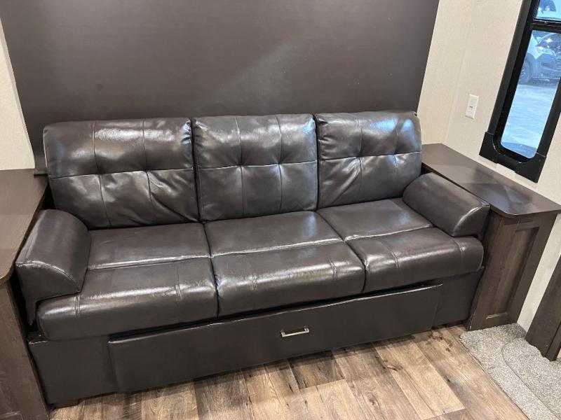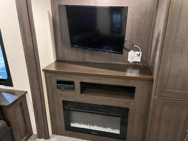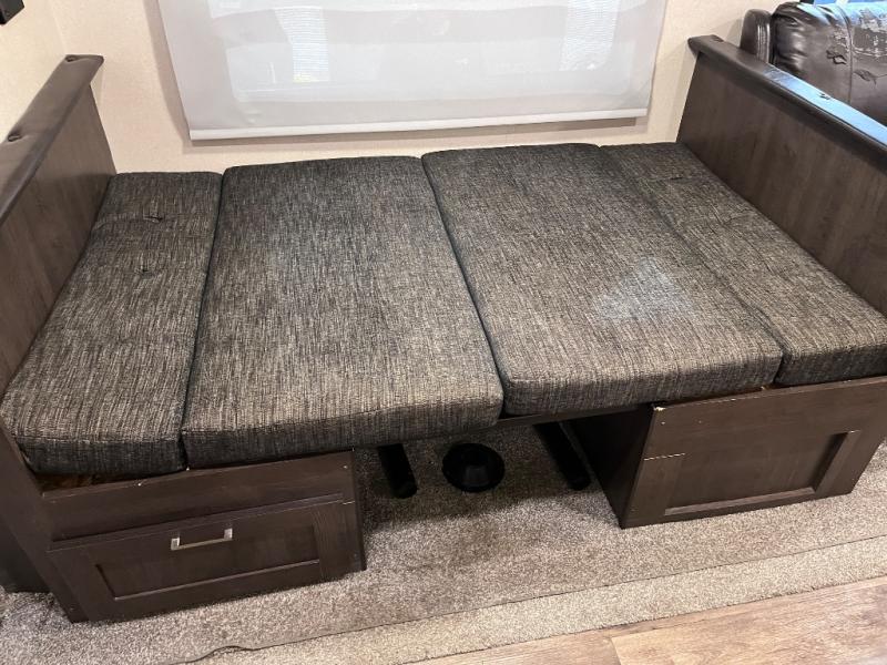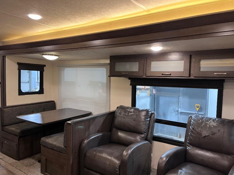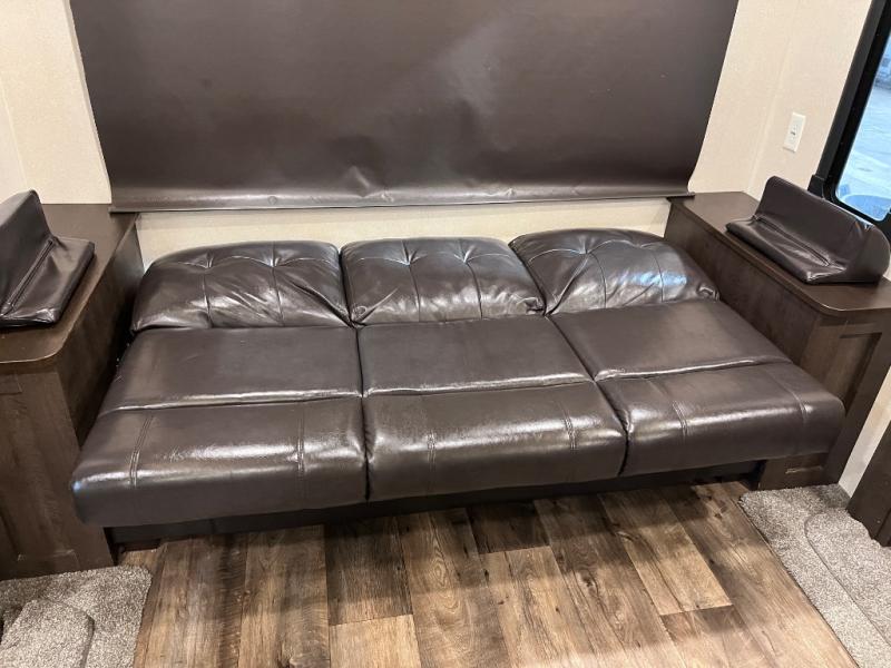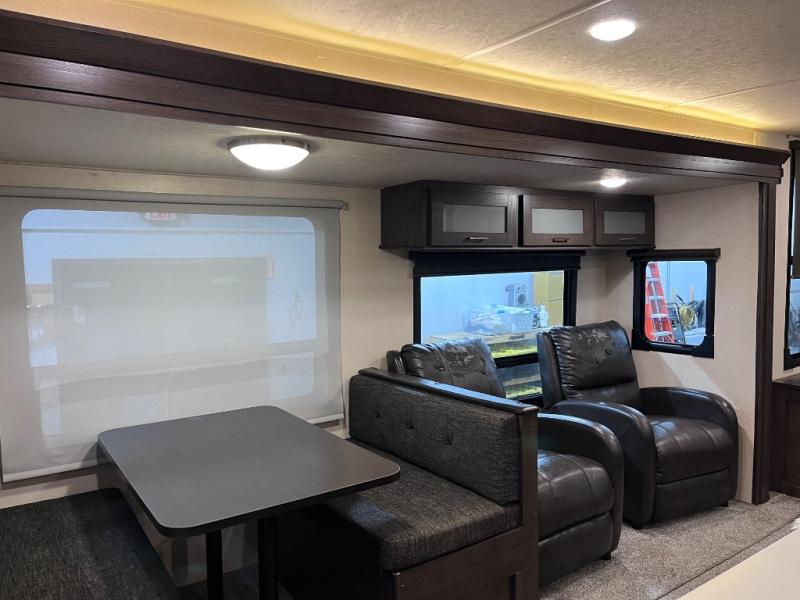 Come start your next camping trip with comfort and ease when you have this Salem travel trailer by Forest River. This model features dual opposing slides which help to open up the floor space. Along the rear wall is a Jiffy sofa, and more seating can be found on the two recliners and booth dinette within the curbside slide out. In the evening you can have a fire in the fireplace while you read a book or plan out tomorrow's adventures. Everything that you need to create your meals can be found in the kitchen, like the three-burner range and residential sink on the island. Outside you will find two awnings that will provide as much shade as possible for you!