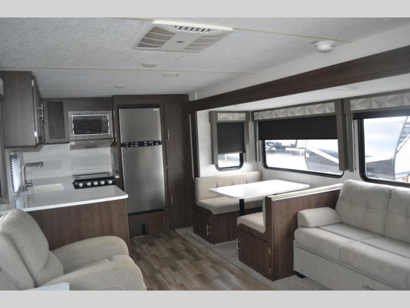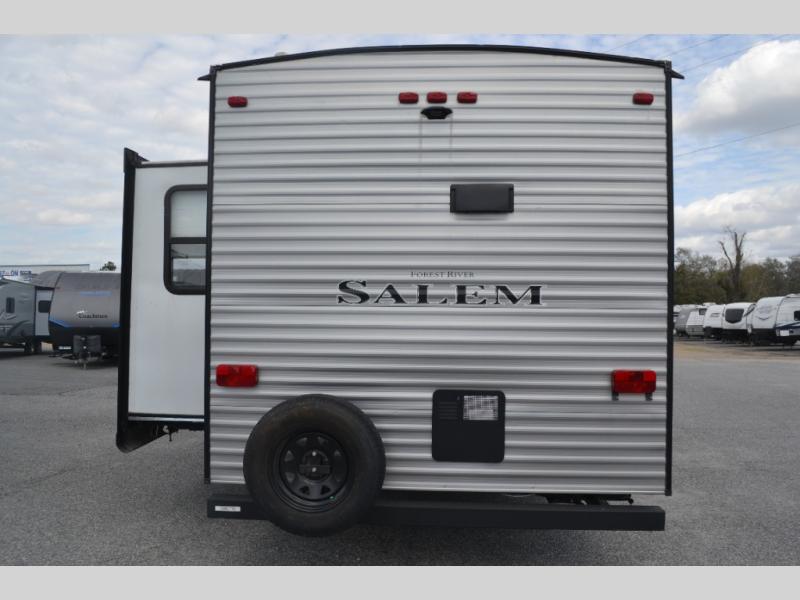 Come see just how fun camping can be with this Salem travel trailer by Forest River. Almost straight in from the door is the bathroom which features a shower, linen closet, toilet, and sink. The combined kitchen and living area has a single slide along the roadside with a booth dinette and a sofa where you can relax, dine, or sleep. In the kitchen there is a residential sink which makes cleaning up from meals easier, and you will also find tall overhead kitchen cabinets.