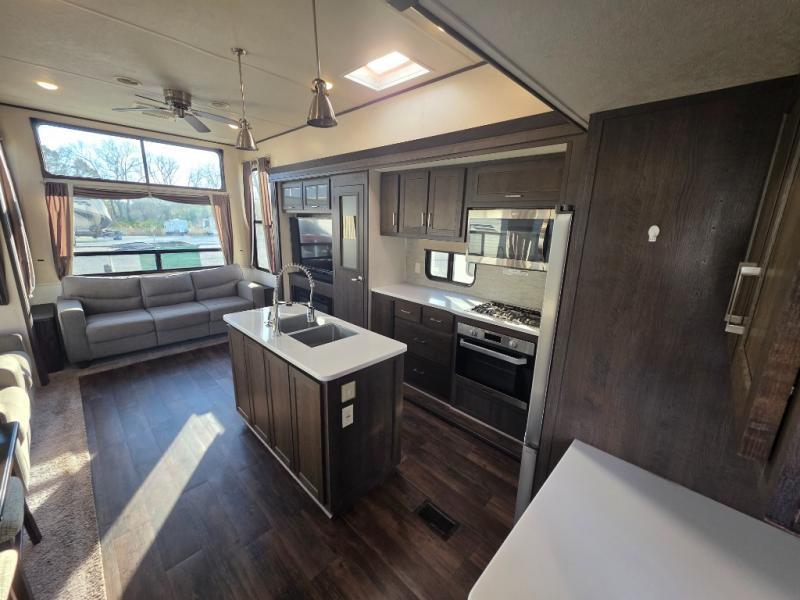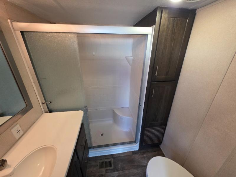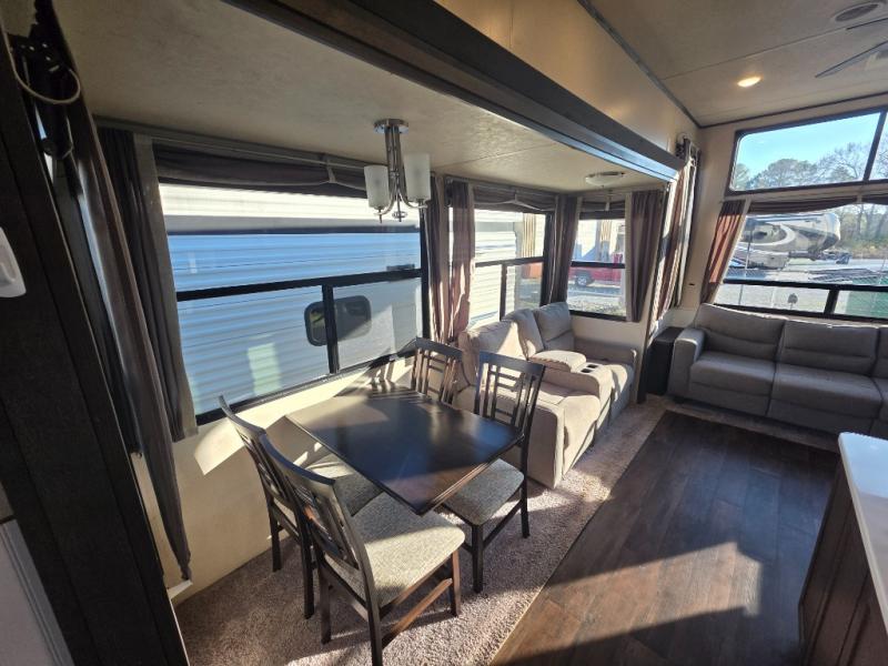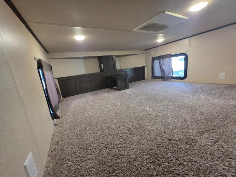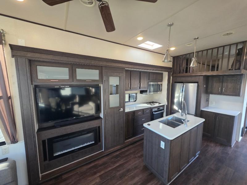 Come choose a quiet spot in the woods for your Salem Grand Villa 42DL destination trailer by Forest River. This model features triple slide outs and a loft with three bunk mats that your children or grand children will love. The double entry doors include a set of patio doors for the main entry plus a private entry door that leads into the front master bedroom. You will love the large walk-in pantry for all of your non-perishables, and the kitchen island which provides extra counter space to prep and serve your meals, plus added storage beneath for your larger pots and pans. The kitchen also features a skylight for added natural light making it seem bright even on cloudy days!