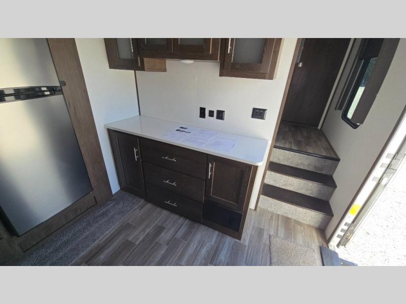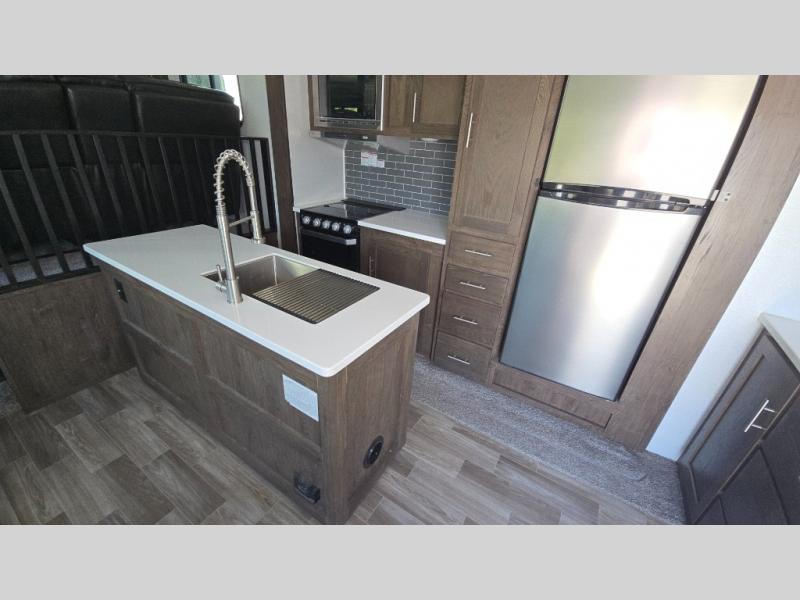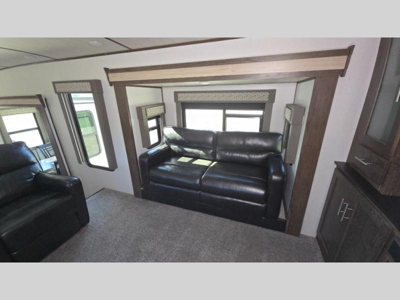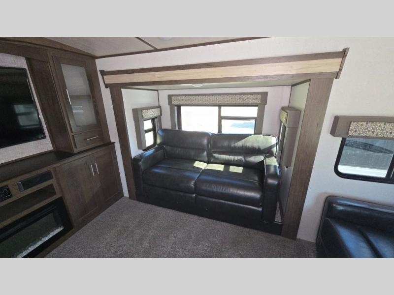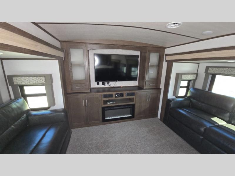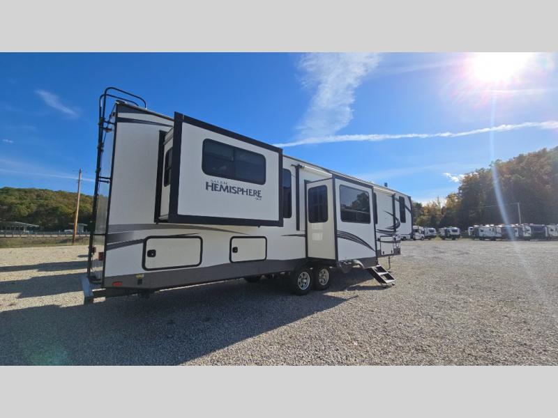 Get ready to make plenty of memories with your family while camping in this five slide out Salem Hemisphere GLX 372RD fifth wheel. In the rear living area there is a large entertainment center and plenty of seating at the two tri-fold sofas and the theater seats. The kitchen area has an island with a large sink and a high-rise faucet. You can enjoy your meals at the free-standing table or plan to play a card game or two here after dinner. Outside there is a 20' awning which provides plenty of shade during the day and gives you a nice outdoor living space where you can sit and visit in the evening. For all of your extra camping gear there are plenty of exterior pass through storage areas and more!