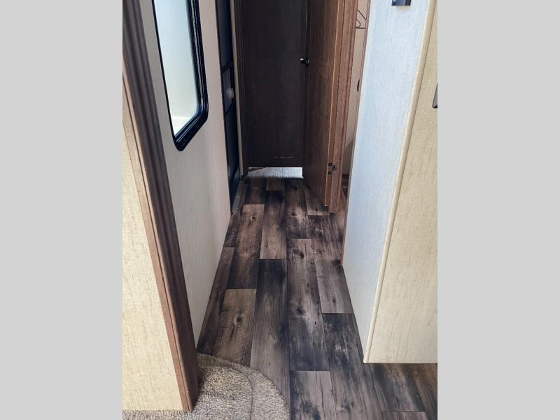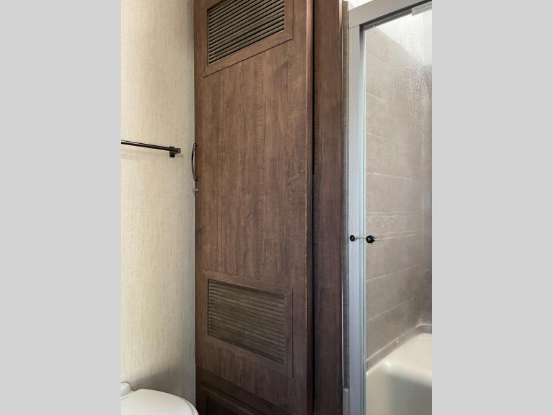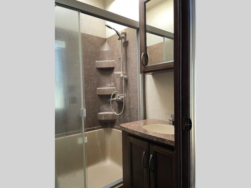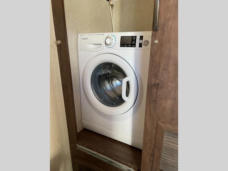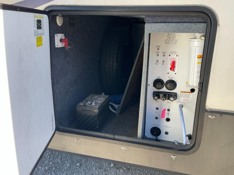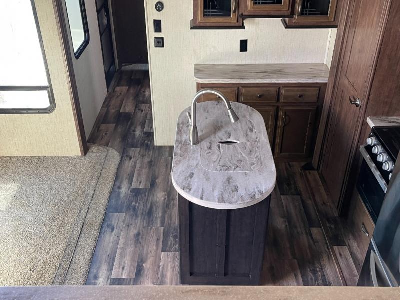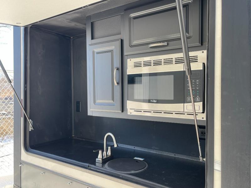 Get ready to camp in comfort when you choose to camp in this Sandpiper fifth wheel by Forest River. This model features sleeping space for up to six people with a rear queen bed and two tri-fold hide-a-bed sofas in the front living area. Along the front of this unit there is an entertainment center where you can watch a movie on rainy afternoons with the 40" flat screen LED HDTV as you snuggle up next to the fireplace. With two entry doors, you can easily enter this unit and be in the kitchen area, or you can enter through the rear door and have easy access to the bathroom. The exterior kitchen is ideal for storing drinks or snacks so that you can grab them quickly while you are playing outside with the kids.