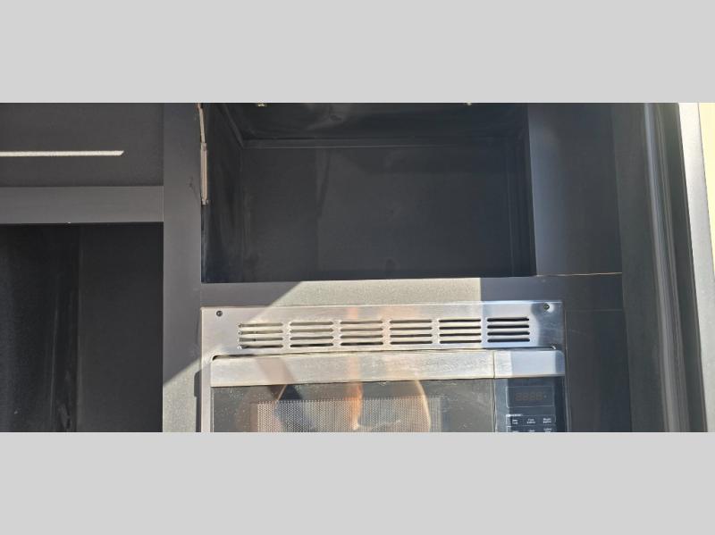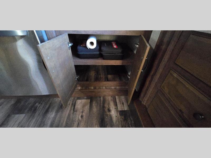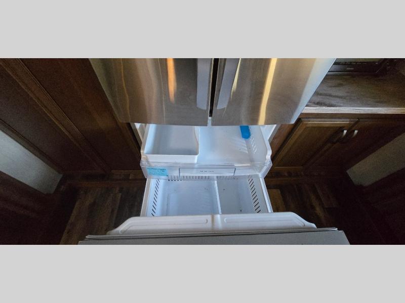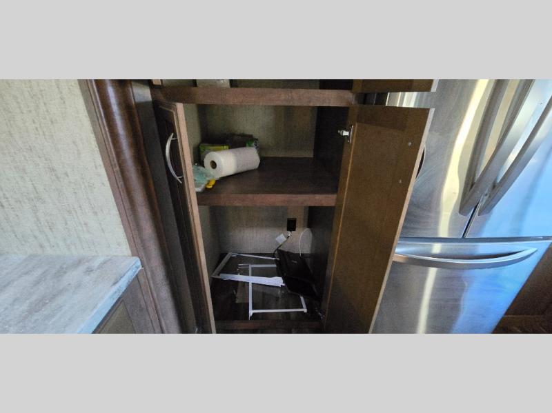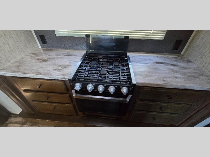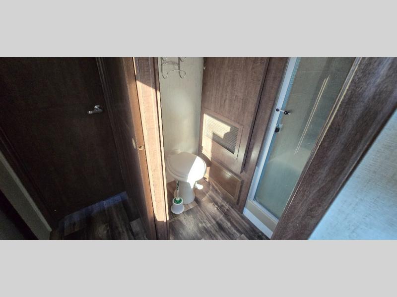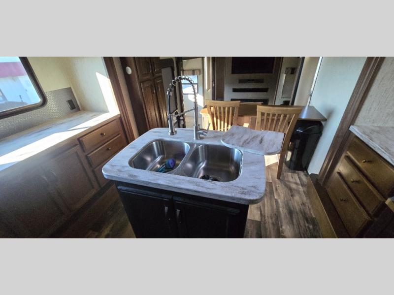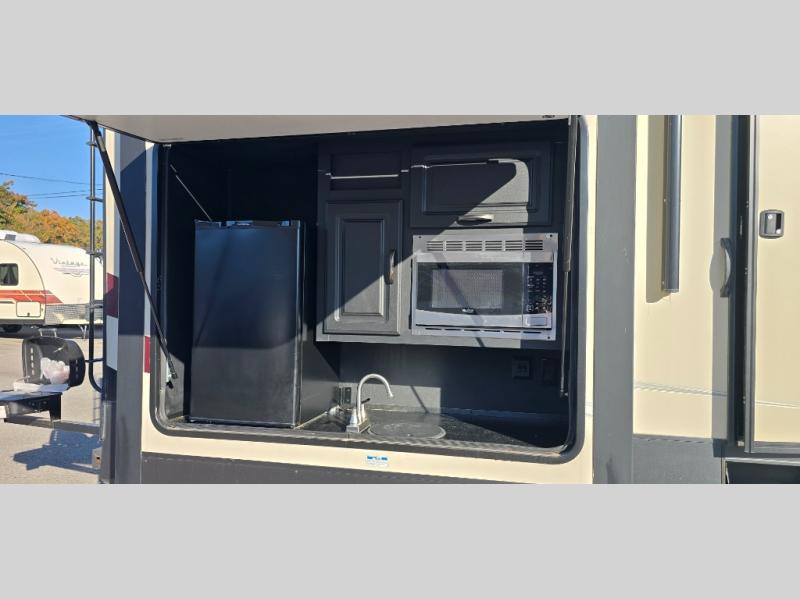 Get ready for more family time and new experiences when you choose to camp with this six-slide Sandpiper fifth wheel. Where are you going to make dinner tonight? That is the question you will be asking yourself when you see this unit. The exterior kitchen allows more time outdoors with your family and features a refrigerator and microwave. The unique front kitchen is spacious and accommodating with opposing slides, an island with a double sink, and a dinette with two chairs. In the spacious bathroom is a large walk-in shower with a seat, plus a closet that has been prepped for a washer and dryer. With two entry doors into this model, you can easily slip out the rear door and head out for an early morning fishing trip!