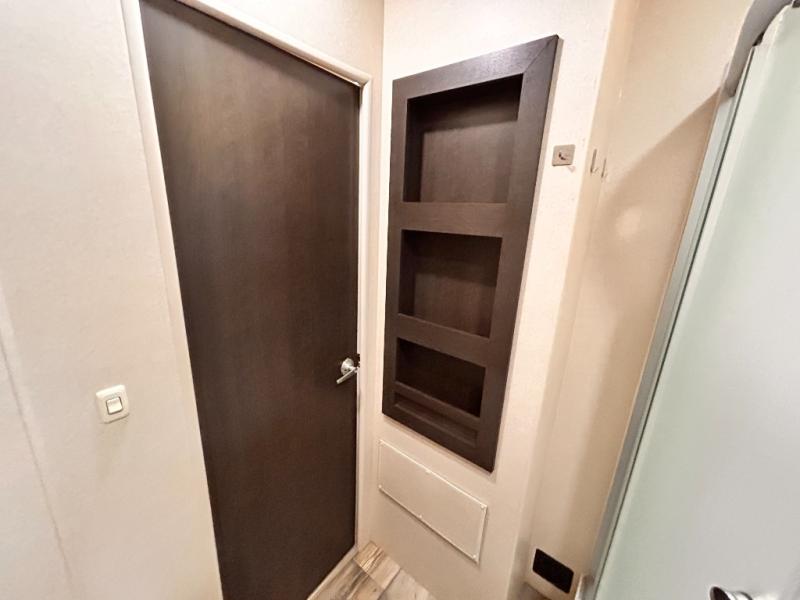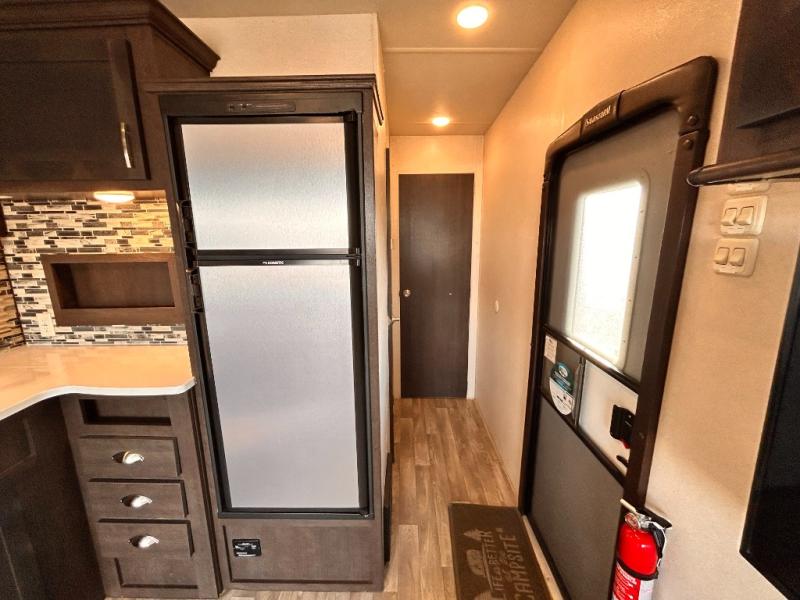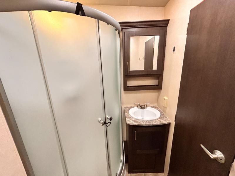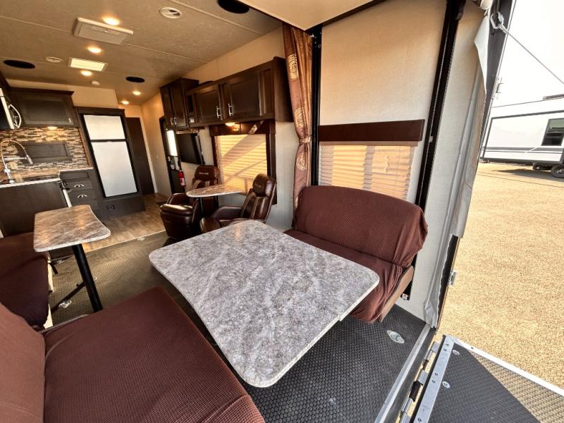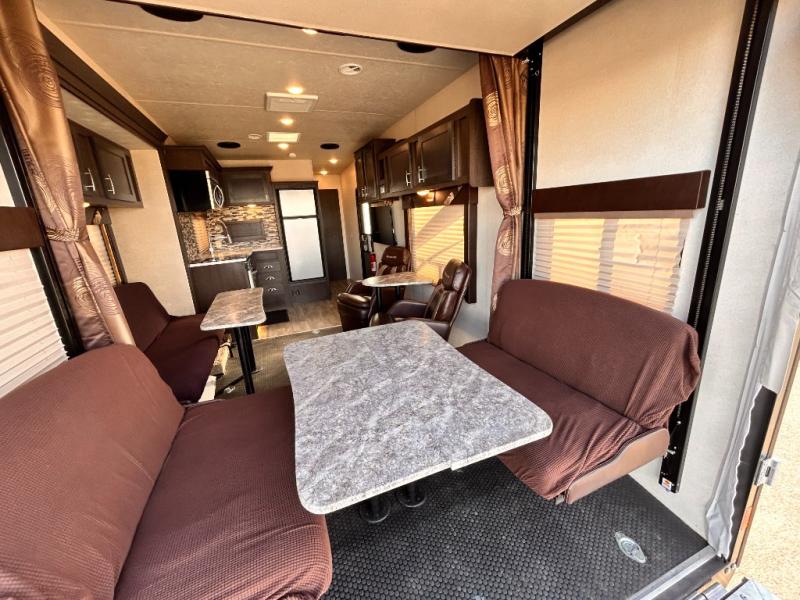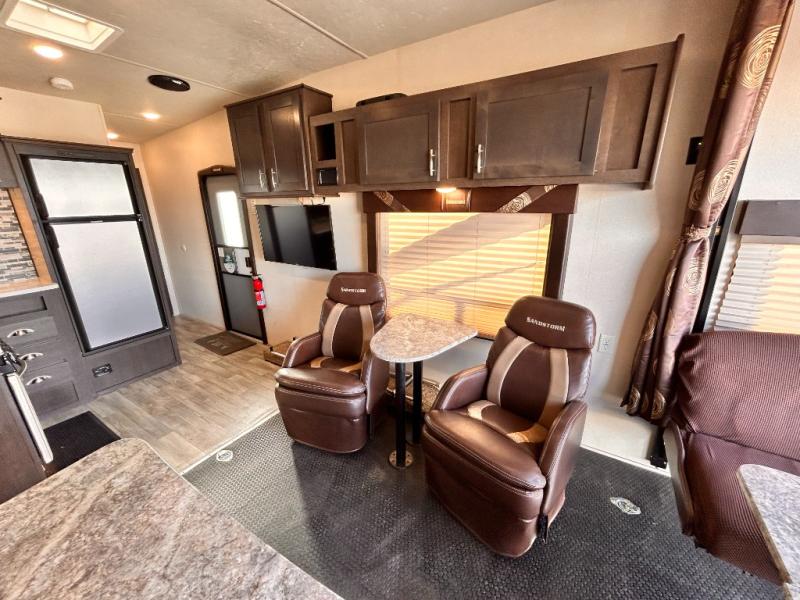 This Sandstorm 271SLR toy hauler travel trailer by Forest River features a front private bedroom and a 3,000 lb. radius ramp for ease of loading and unloading your off-road toys. It also features an electric bed with sofa underneath, as well as, an additional sofa with a table and recliner chairs with a table so there are plenty of seating options to choose from! The dual entry bath is not only easily accessed, but also keen on sleek features such as the glass shower. What better way to enjoy the outdoors without the suns rays than to spend it underneath the power awning that is equipped with LED lights too.