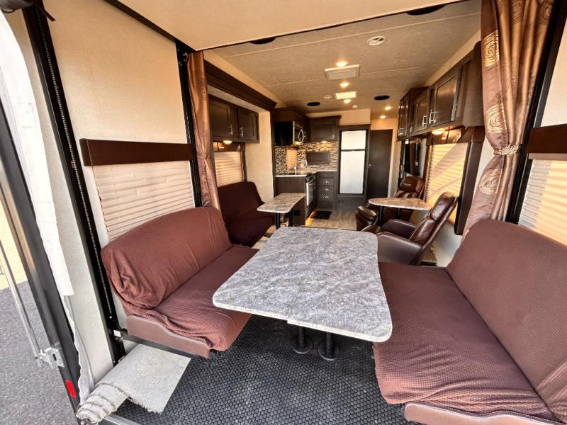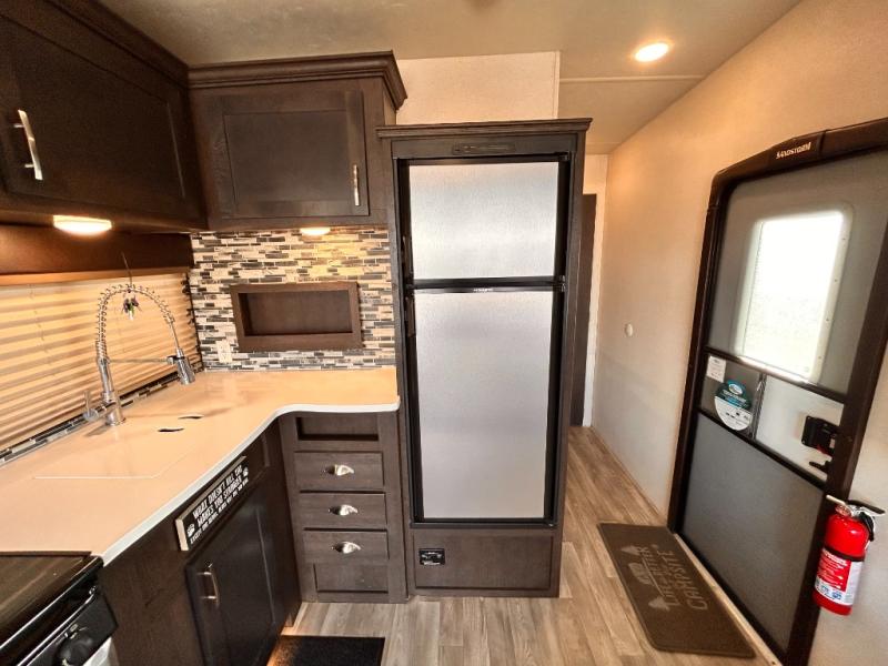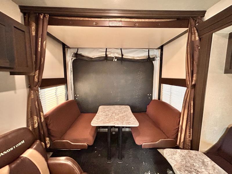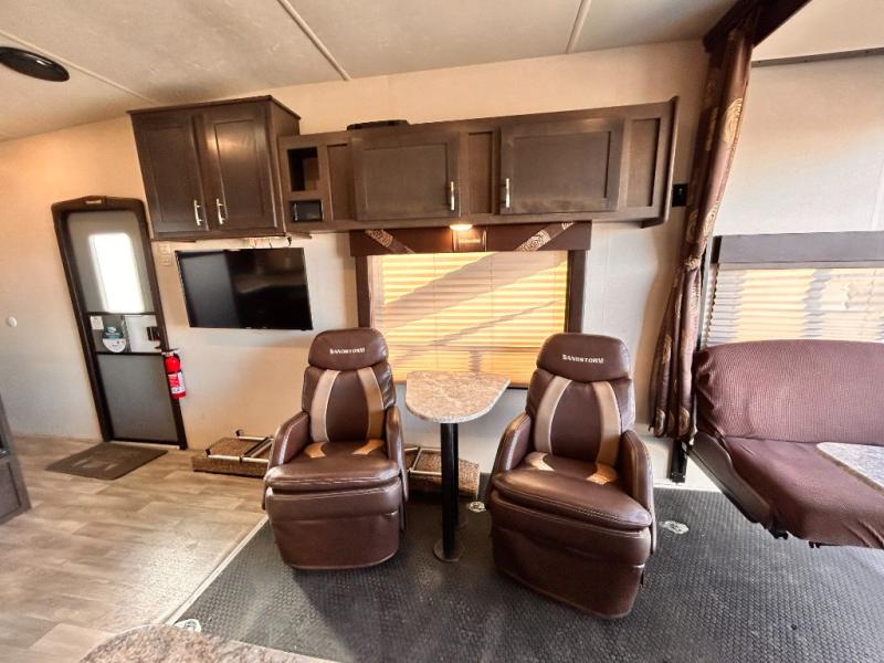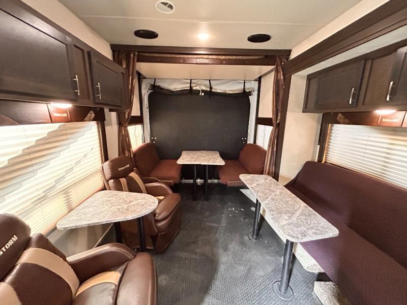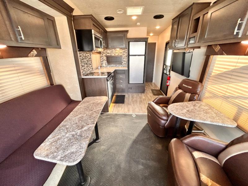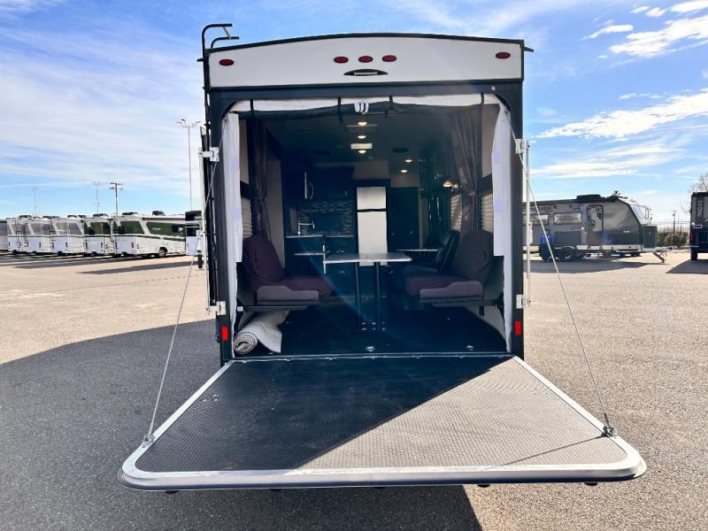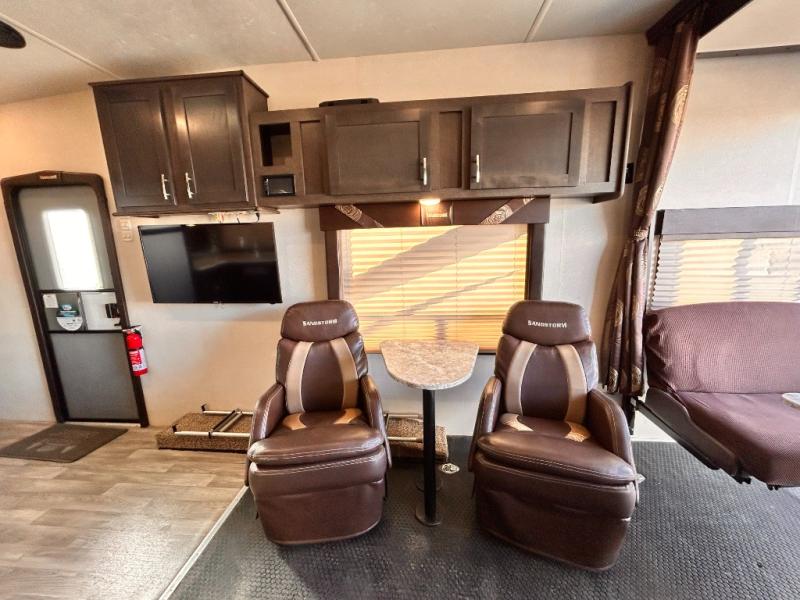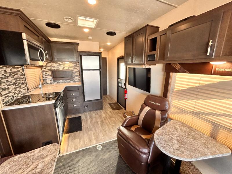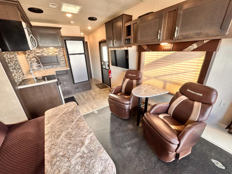 If you're looking for a lightweight and easy to tow travel trailer then one of these toy haulers by Forest River Sandstorm is for you! Each unit features a 102" wide body construction, a 3,000 lb. radius ramp door, and 2" fully insulated floors making these toy haulers flexible to your vacation destinations whether it's to the dunes or mountains it is ready. Some of the interior features that will impress you are the Bluetooth stereo with indoor and outdoor speakers, the Thermafoil countertops, a Denver pillow top mattress, and the 3 electric charging stations.