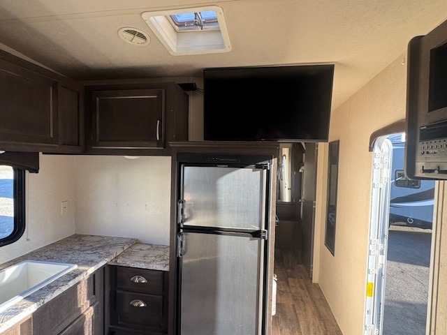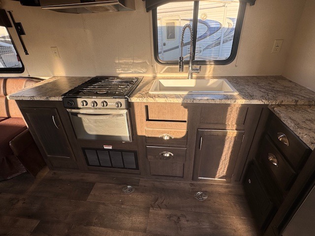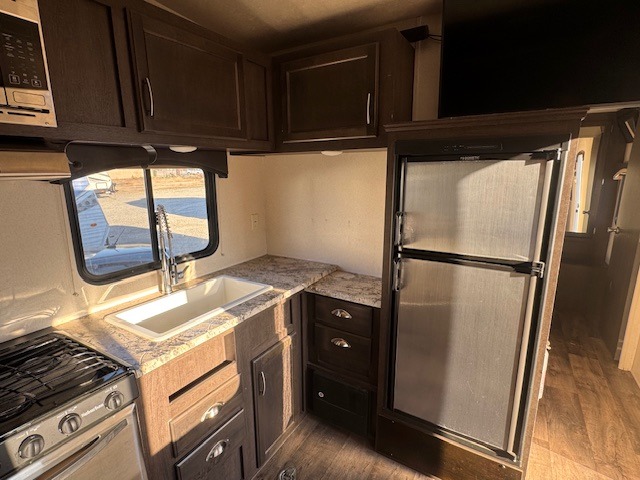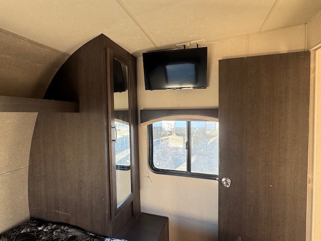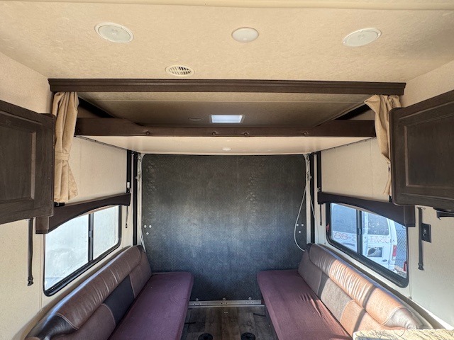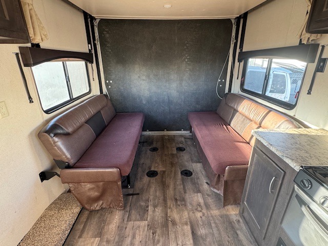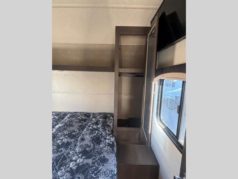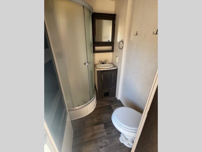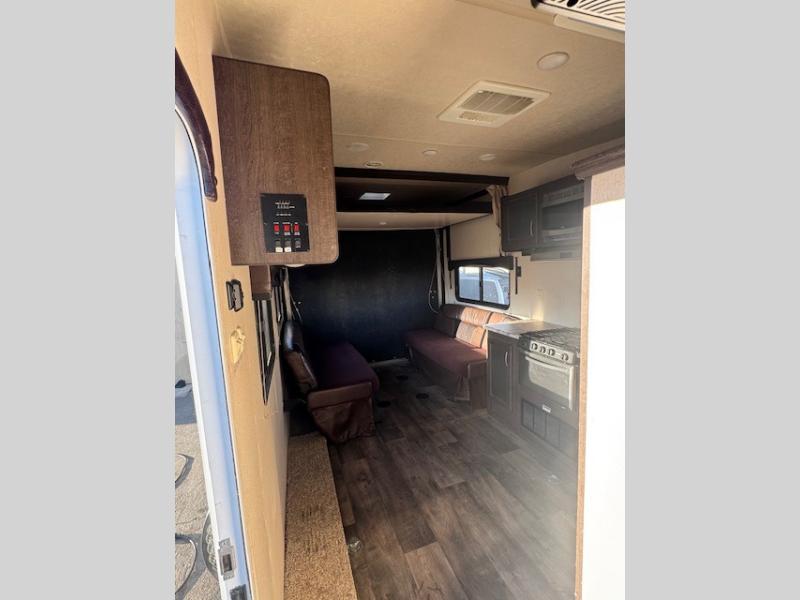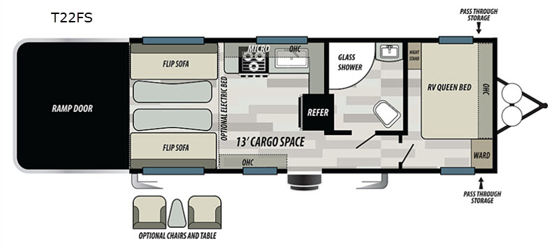 Whether you have been camping for years, or this is a new adventure for you, let this travel trailer take you, your family, and a few off-road toys away to the outdoor playground of your choice. It features a front bedroom with an RV queen bed, a nightstand, and clothing storage so that you can sleep and get dressed in privacy. The pass-through storage is the perfect place for you to easily store and access all of your outdoor camping equipment. You can comfortably enjoy your meals at the dual opposing flip sofas with tables or transform them into an extra sleeping space at night. You might even choose a few options such as adding an electric bed for more sleeping space, and optional chairs with a table in place of a sofa. Take a look today!