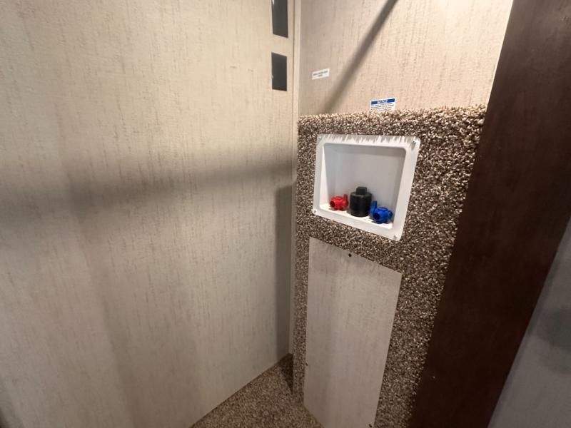 This unique middle bunkhouse includes a glide sofa with a bunk above, plus storage, and a loft above this room. Your kids or guests will appreciate their own space to hang out as well as sleep. Just imagine having your own private bedroom with a large wardrobe with shelves, and the option of adding a washer and dryer if you like. You can even sit down while taking a shower. The main living and kitchen area is wide open with dual slides, and offers plenty of seating to eat or relax while enjoying a show and the fireplace. The outdoor person in the family will love the exterior kitchen and electric awning, plus MAX XL storage.