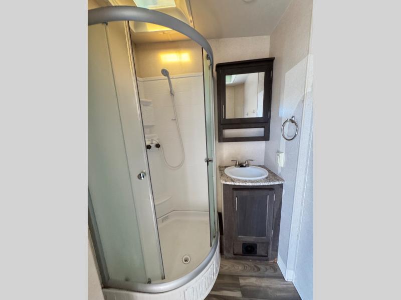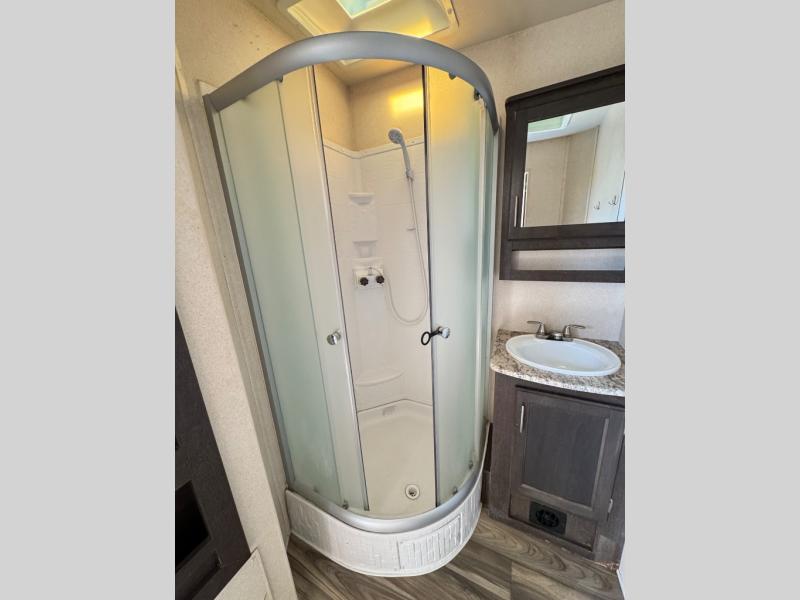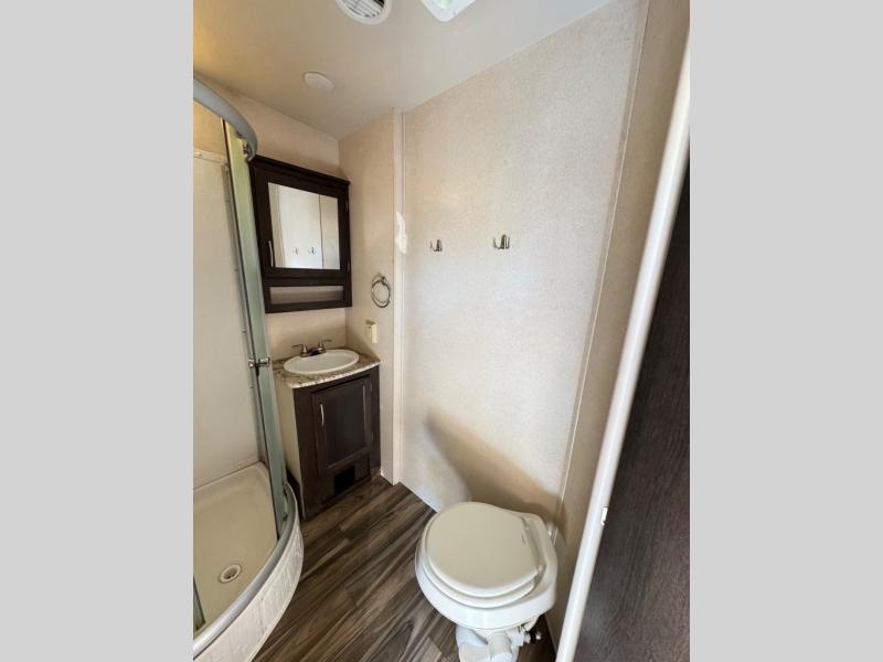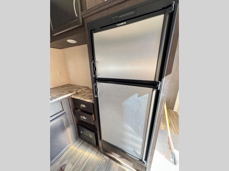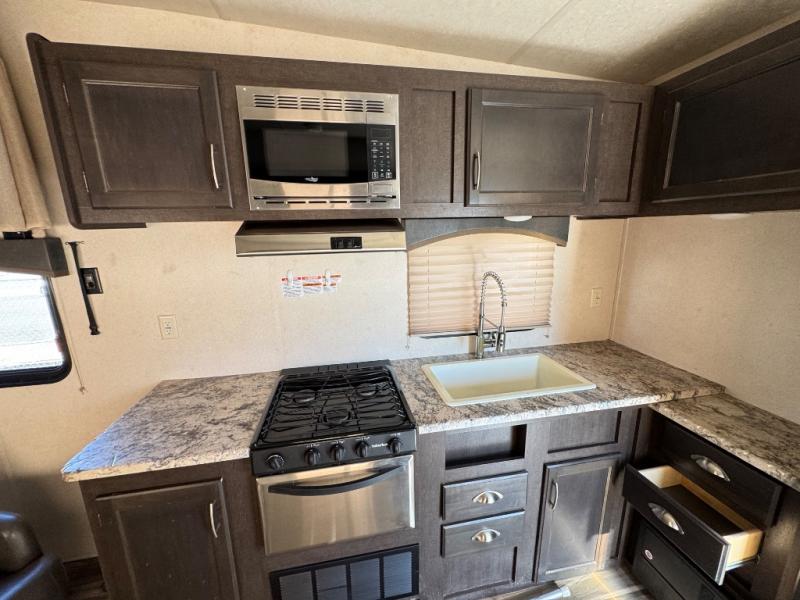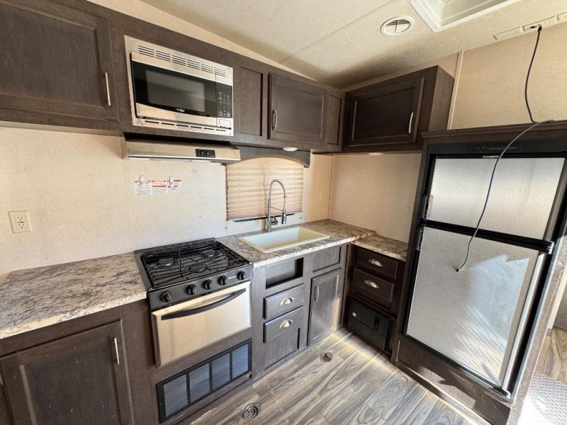 Are you looking for a toy hauler that can haul your dirt bikes but also give you comfortable features that you can enjoy while you're away from home? Look no further than this unit that features 13' 9" of cargo space and your own private bedroom with a queen bed and wardrobes for your clothes. Your riding buddies can crash on the electric bed or convert the electric pass through dinette for more sleeping space. You can prepare dinner just like you do at home on the three burner range or make something quick in the microwave oven so you can get back outside to ride some more!