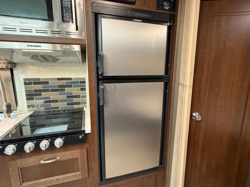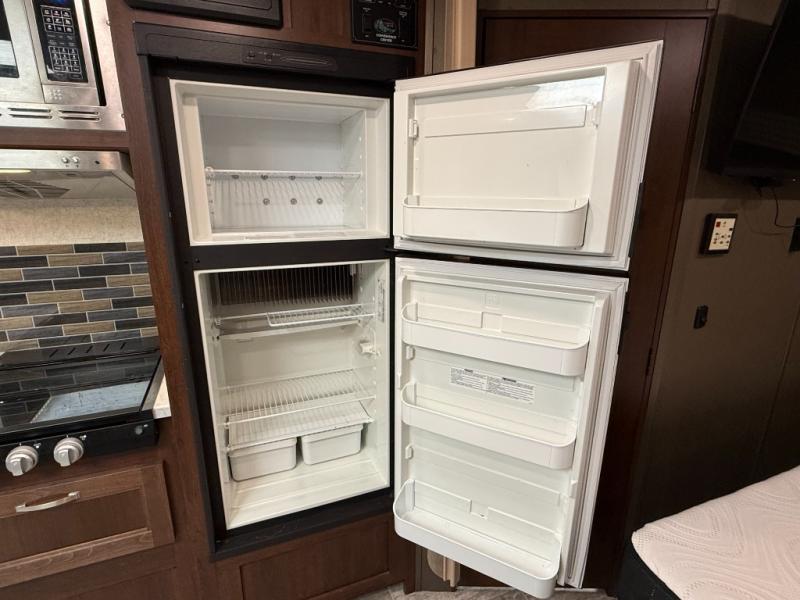 Galley/Kitchen: 3-burner range, convection microwave, double-door refrigerator, U-shaped dinette
