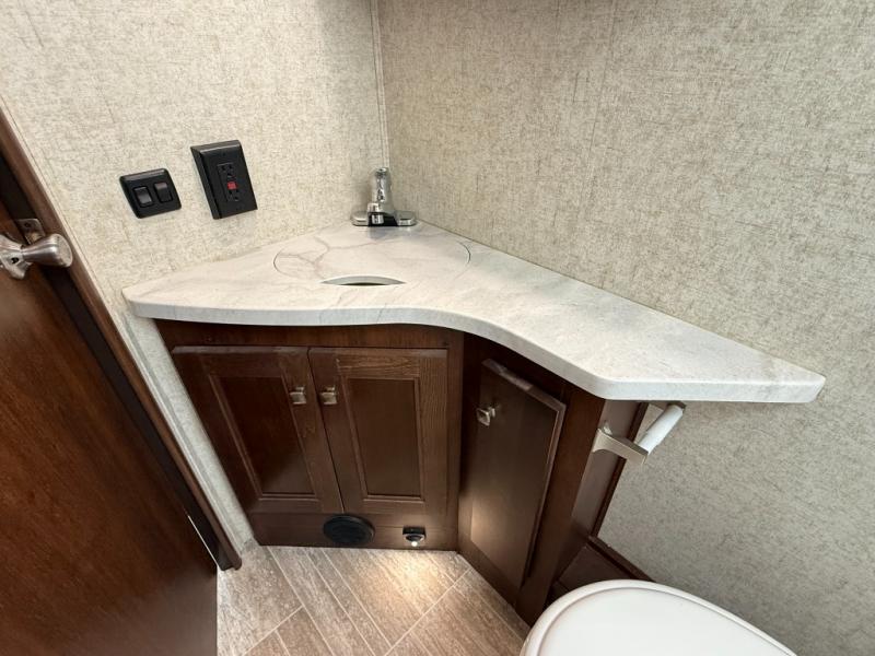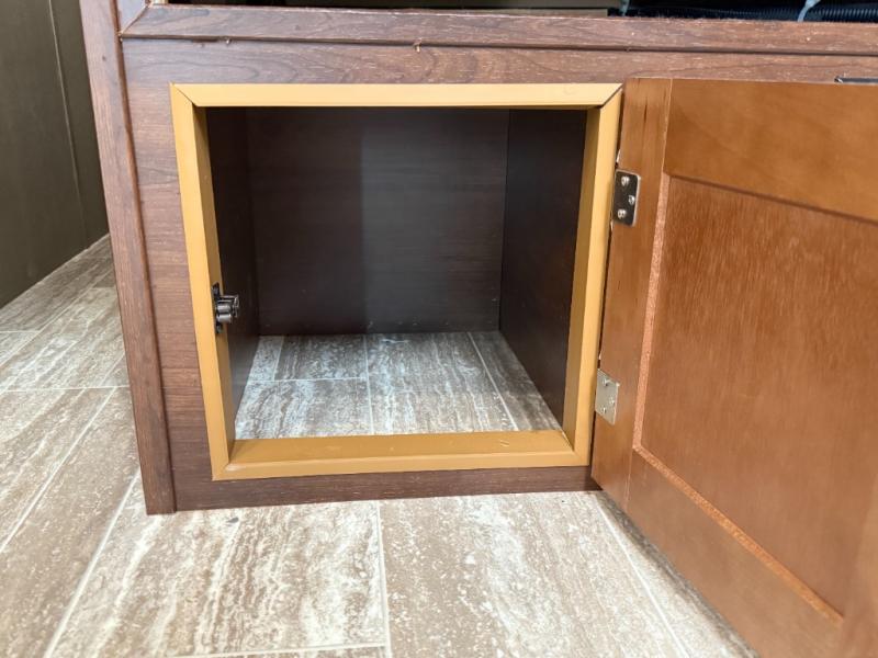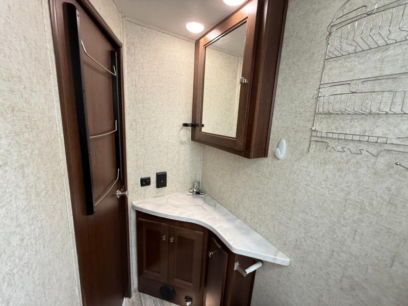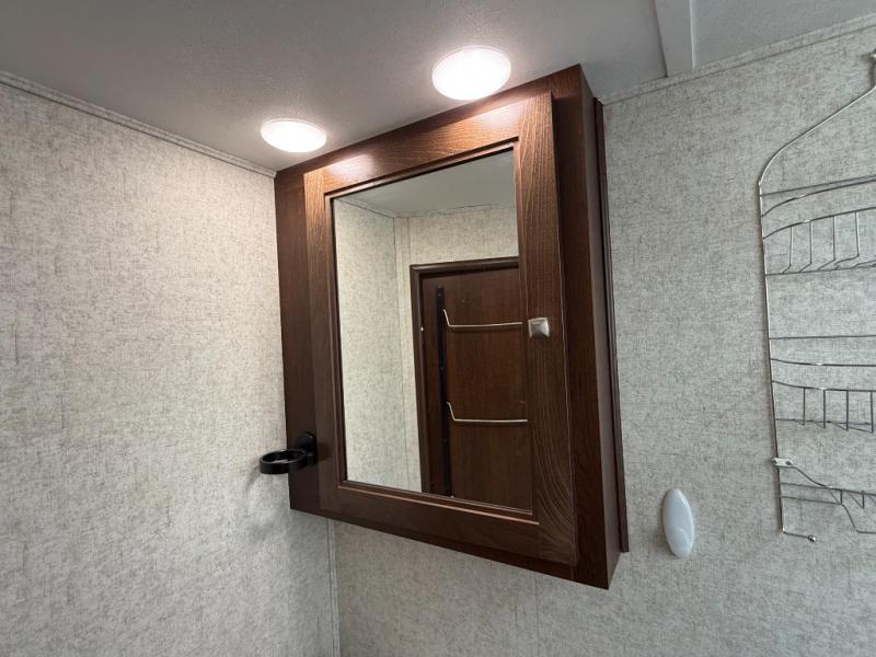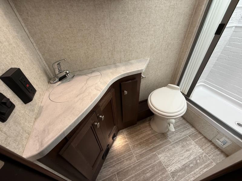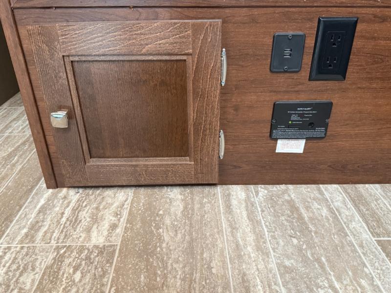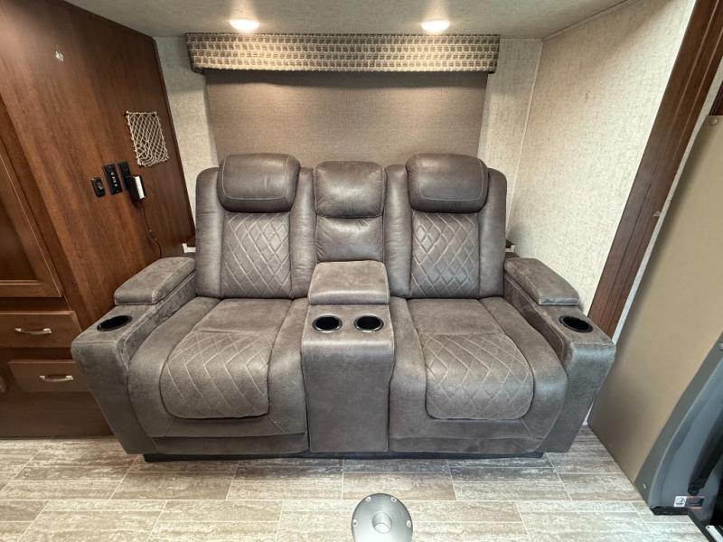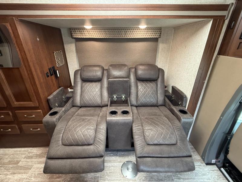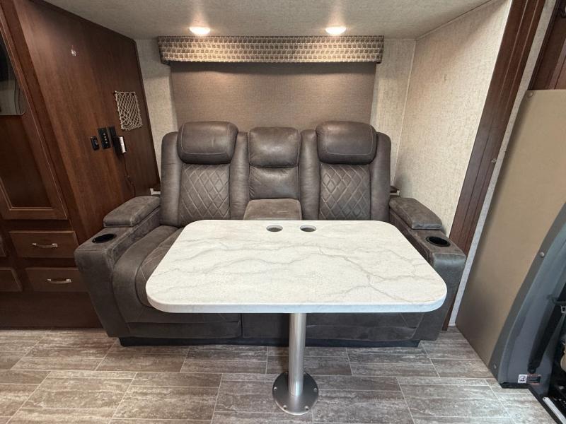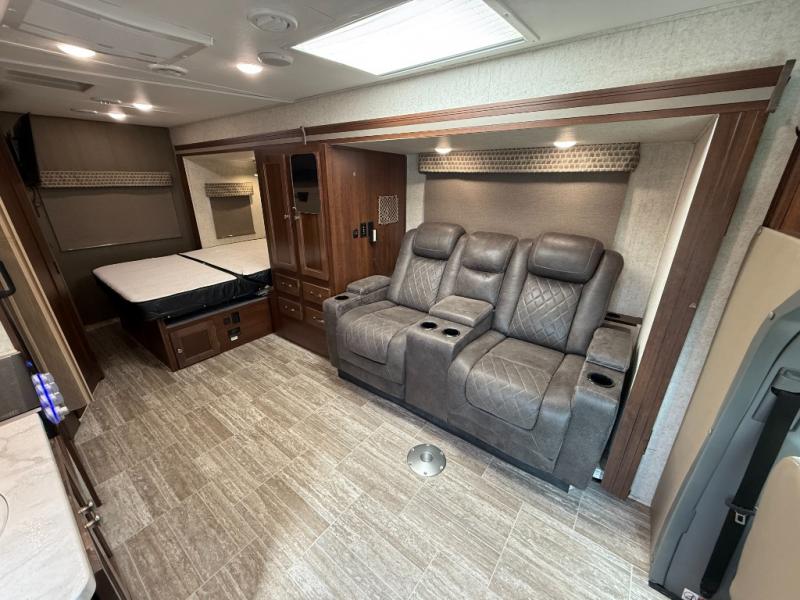 Interior: U-dinette, 12V charging, 12V LED TVs, blackout shades, theater seating