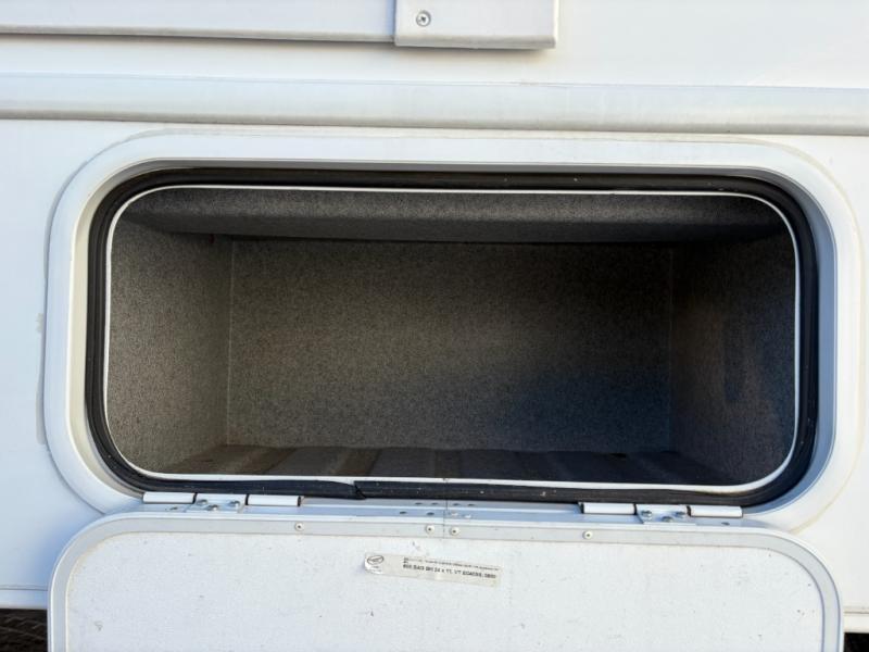 A Ford chassis carries this Sunseeker Class C gas motorhome that offers ample space thanks to three slides. There is a 60" x 80" bunk over the cab that can sleep two individuals, a U-shaped dinette that can sleep two smaller individuals, and a queen bed that can sleep two as well. You can take this motorhome on a weekend trip and have plenty of space for your friends and their things. There is a wardrobe slide in the bedroom, a unique rear slide that houses the bed, and overhead storage throughout this unit. If it is a cooler day, there is an LED TV in the front for watching movies.