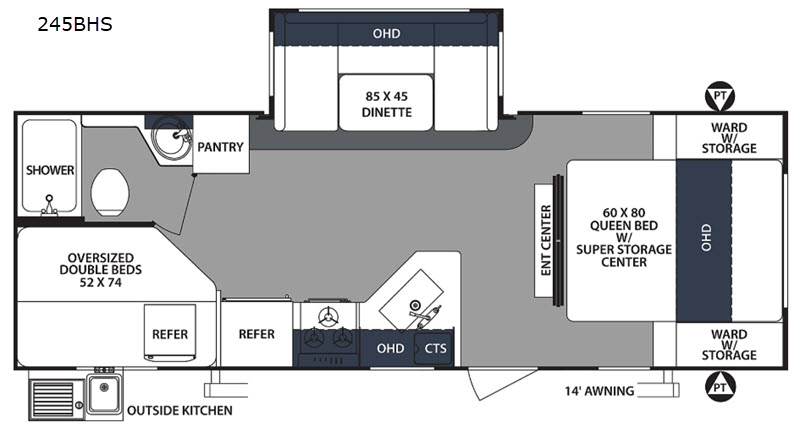 Your family of eight will enjoy all of the space throughout this single slide out Surveyor 245BHS travel trailer. Sleeping space can be found in the front private bedroom for mom and dad with the queen bed, the rear oversized double bunks for the kids, and if needed the U-shaped dinette can easily convert into additional sleeping space. Throughout this model there are Shaker style cabinets plus more storage can be found under the queen bed and with the two wardrobes on either side. Outside there is a front pass-through storage area and an outside kitchen where you can fix your evening meal. The 14' electric awning provides plenty of shade and gives you more outdoor living space!