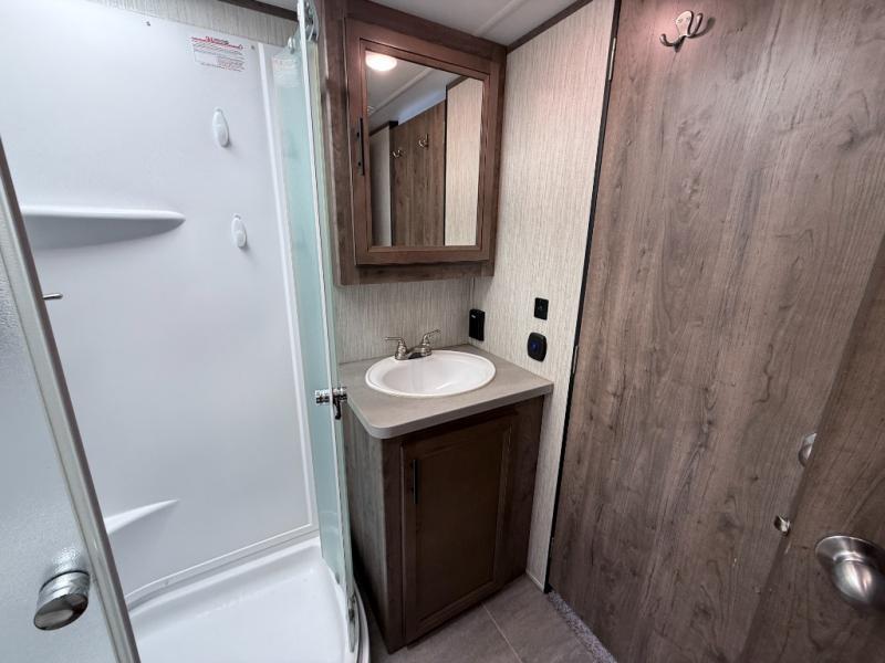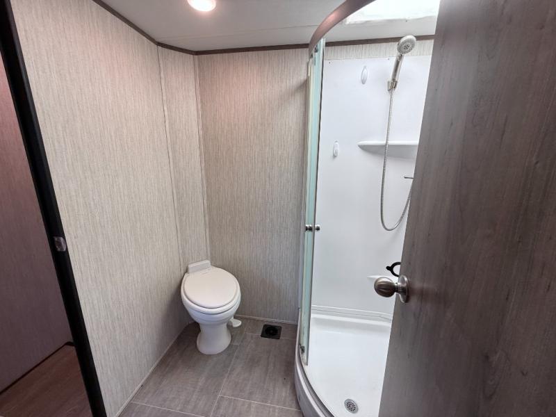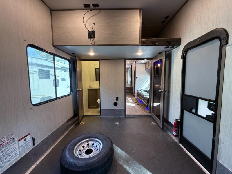 Step inside and experience a roomy kitchen and living area, thanks to dual slide-outs that open up the floorplan. The main living space offers comfortable seating, premium finishes, and an inviting fireplace for those cool nights. Whether you're preparing meals or watching the game, you'll have the space you need. In the 13' separate garage, you’ll find room for all your outdoor toys and gear. A fuel station with pump ensures your fun doesn’t stop early, and the rear ramp doubles as a patio for added versatility. Guests or kids will appreciate the drop-down bunk and overhead loft, maximizing sleeping space without compromising function. The full bath is thoughtfully placed near the main living area, while the half bath in the garage offers added convenience. Outside, rinse off the day’s adventures with the outdoor shower before heading back indoors.
