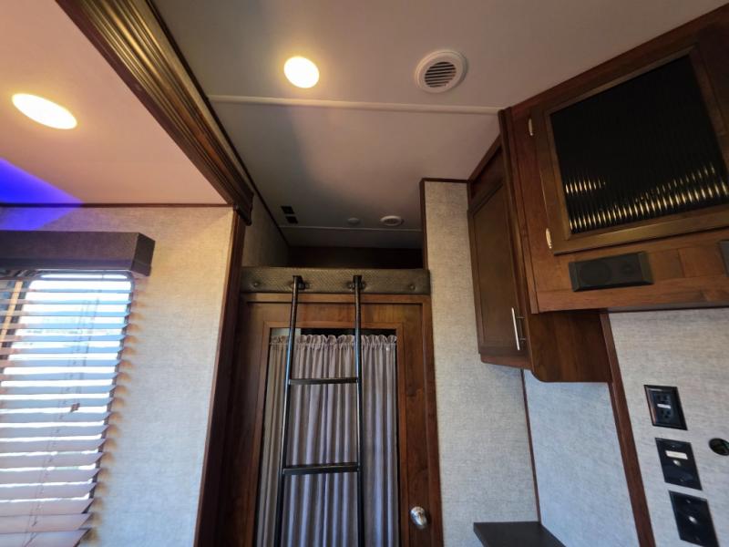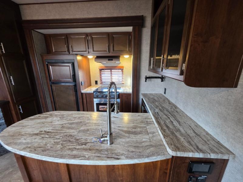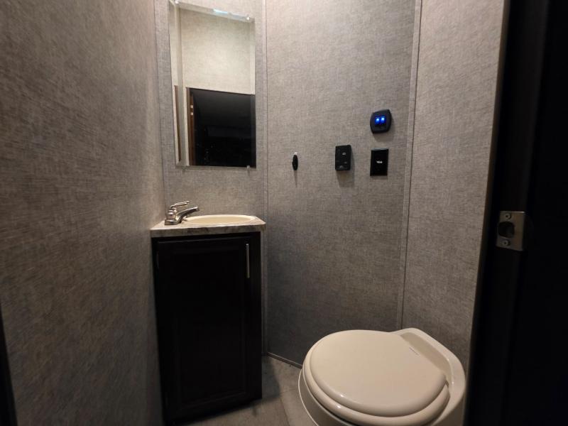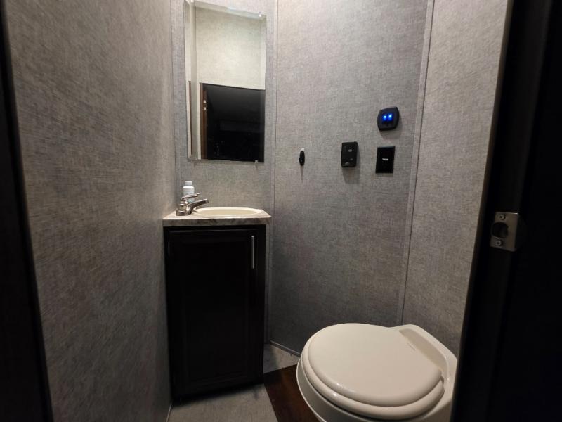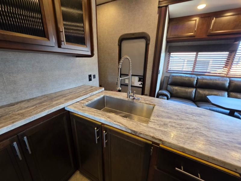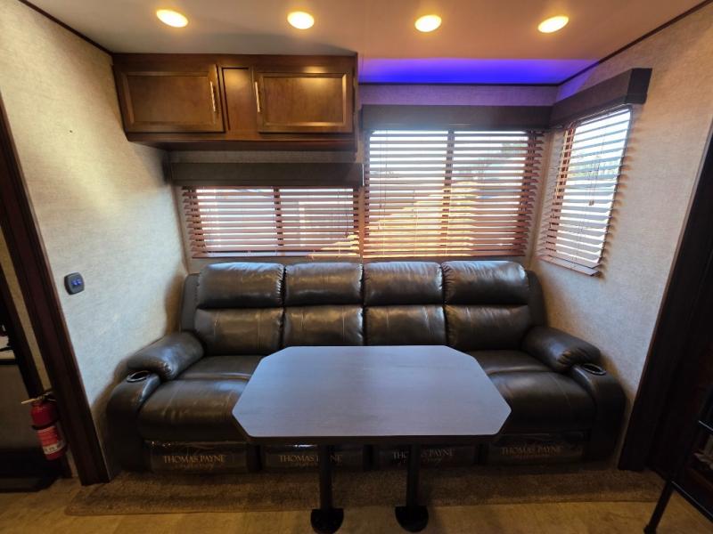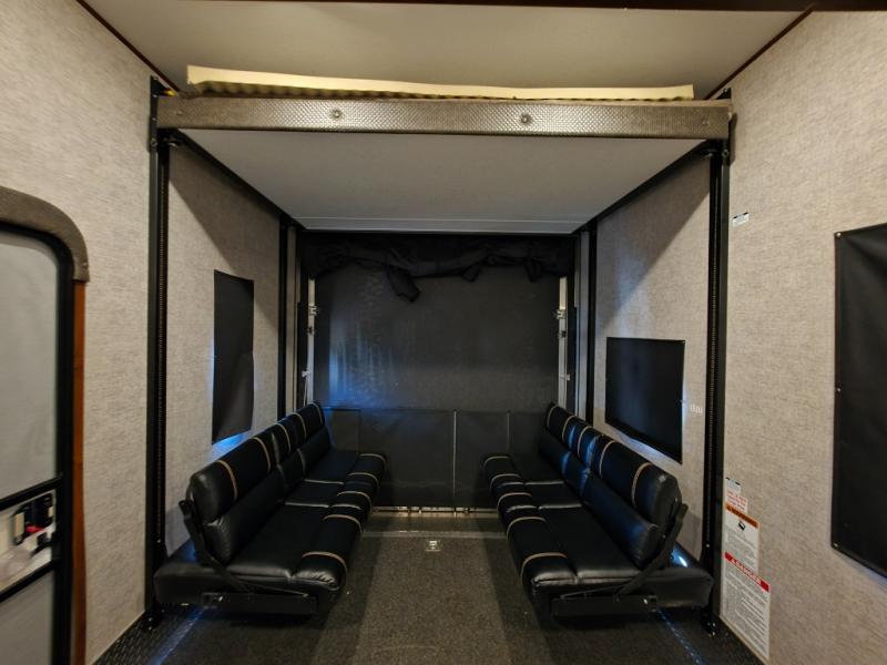 This Vengeance toy hauler is a unit that is filled to the brim with an abundance of helpful amenities. The loft and Happijac electric bunk add to this unit's ability to sleep nine people by making wonderful use of space that would otherwise be left empty, and the two slides provide extra room in the kitchen area so that a full and half bathroom could be included.