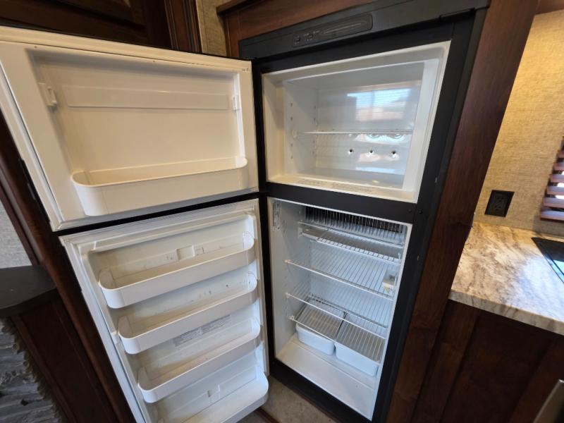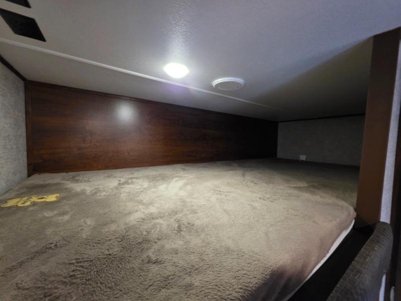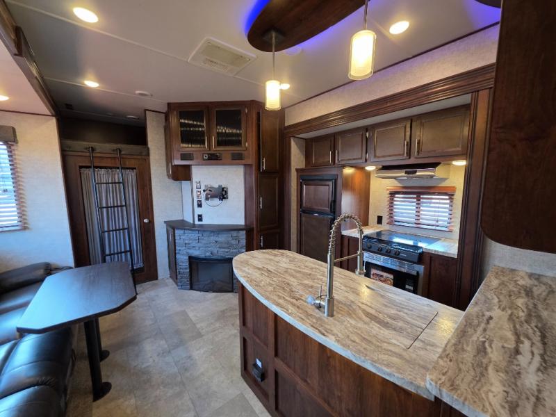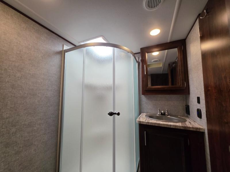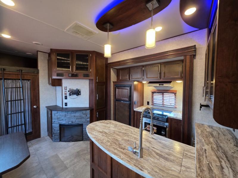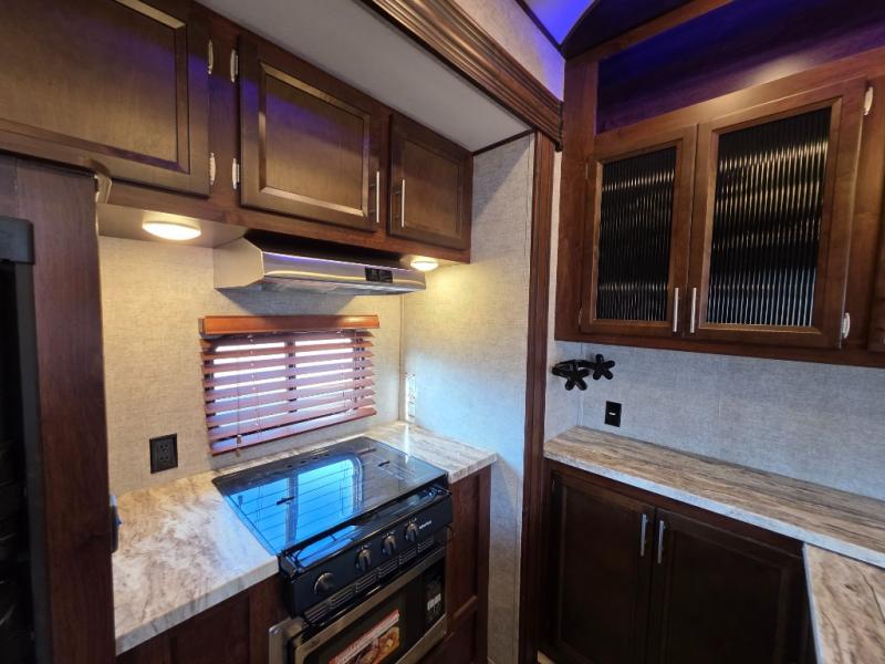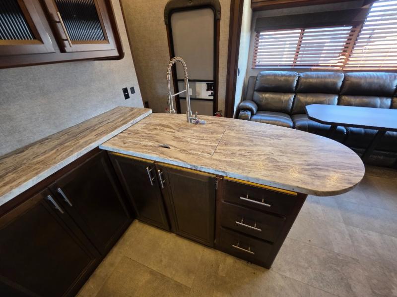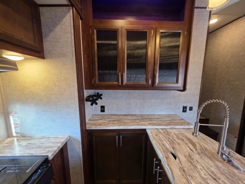 This Vengeance toy hauler is a unit that is filled to the brim with an abundance of helpful amenities. The loft and Happijac electric bunk add to this unit's ability to sleep nine people by making wonderful use of space that would otherwise be left empty, and the two slides provide extra room in the kitchen area so that a full and half bathroom could be included.