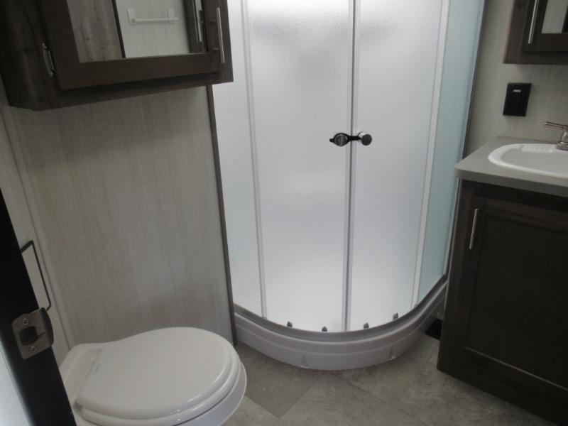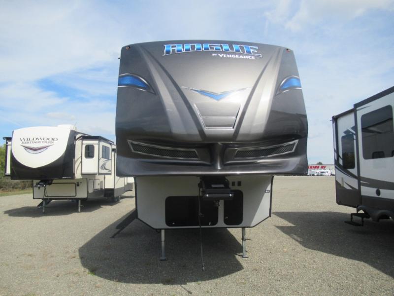 For any outdoor adventure you will want a Vengeance Rogue toy hauler fifth wheel by Forest River! Each model features a ramp door patio system providing you an above ground outdoor living space, and a screen wall/tent wall to separate the inside from the outside without giving up any fresh air. With the enclosed underbelly you can now camp in all types of weather, and after a day of playing outdoors, you will enjoy washing off the dirt in the outside shower. Inside you will appreciate the 11 cu. ft. residential refrigerator, the convection microwave oven with a glass cooktop, the multiple USB charging ports, and the premium lighting package with lighted switches. Go Rogue today!