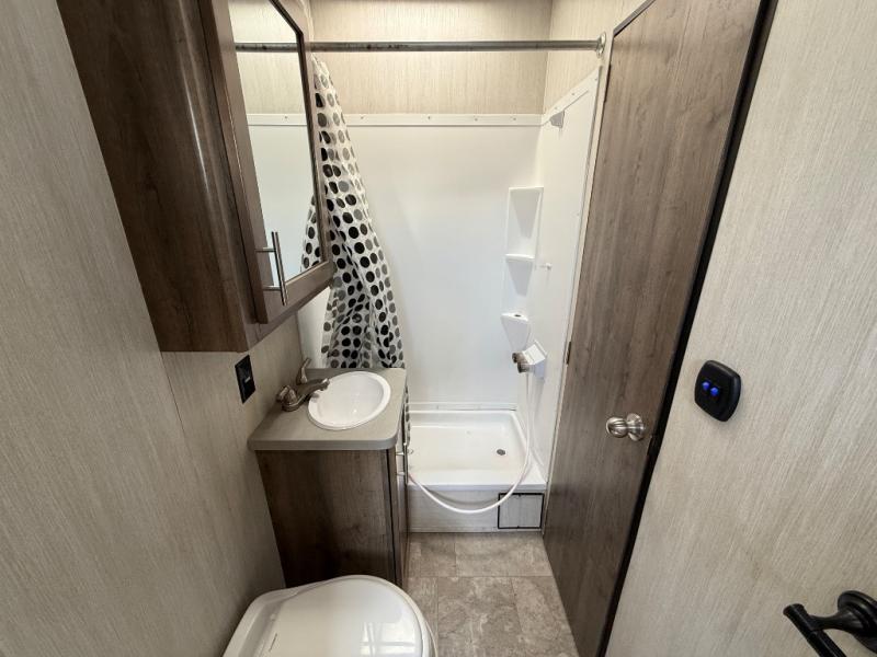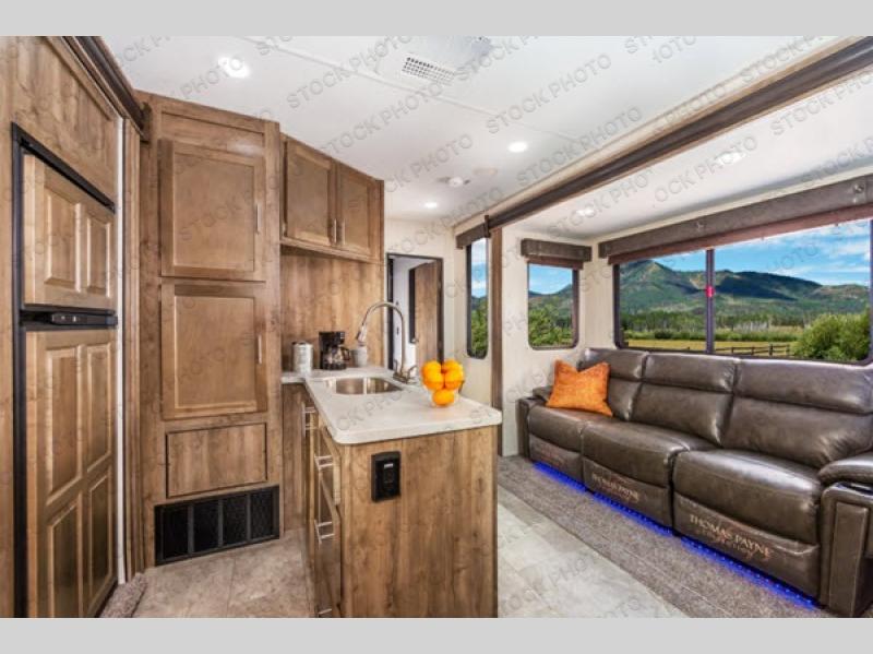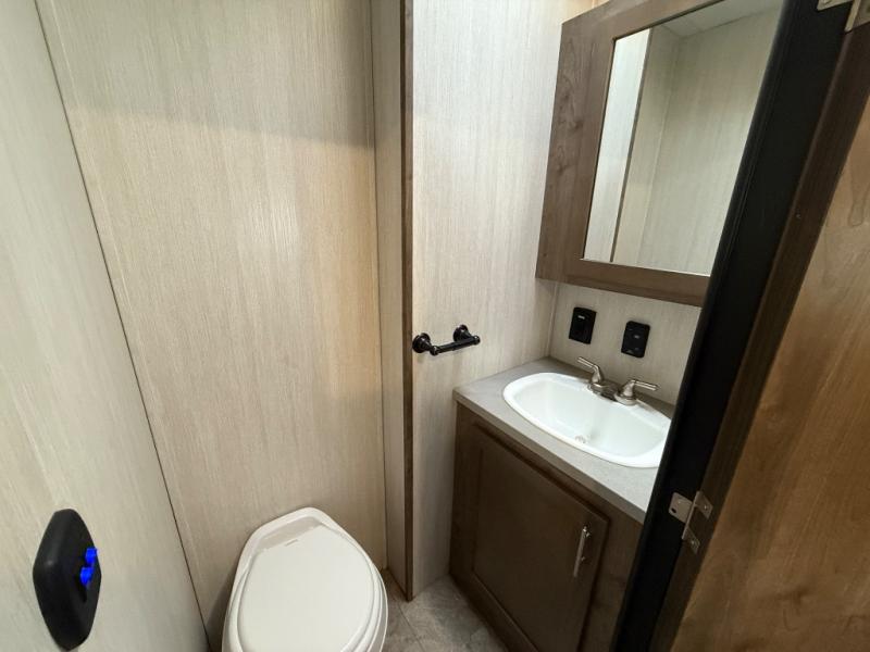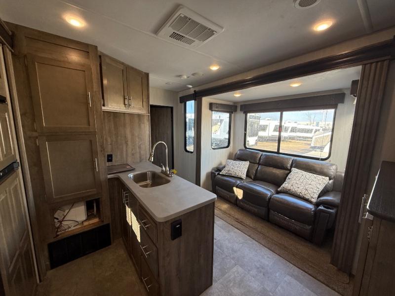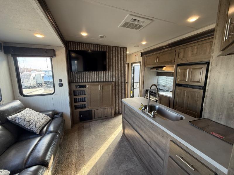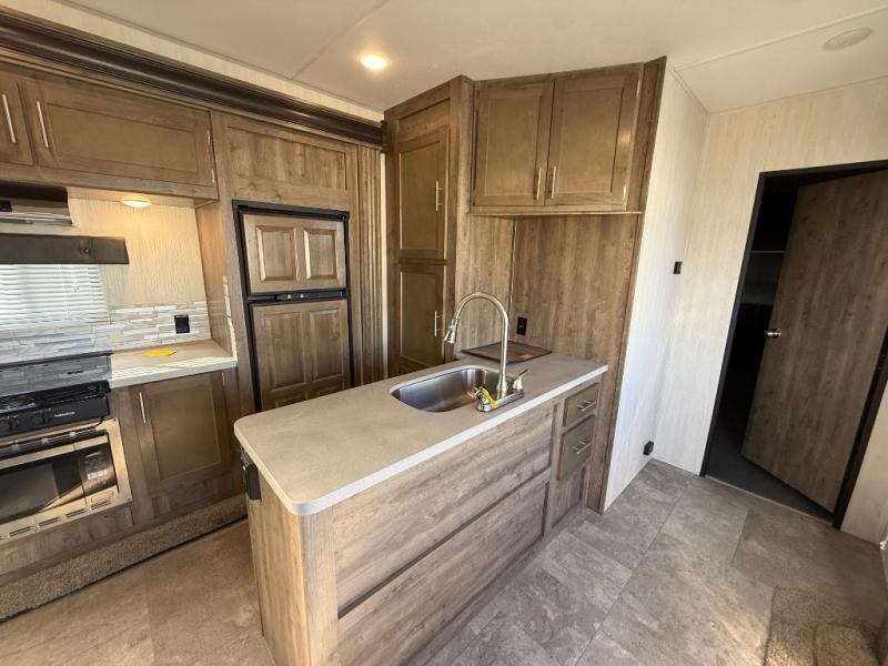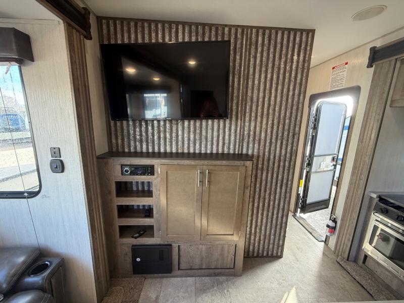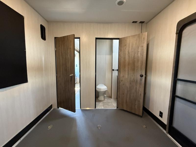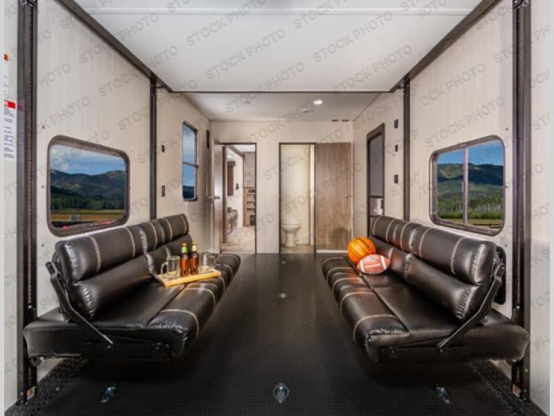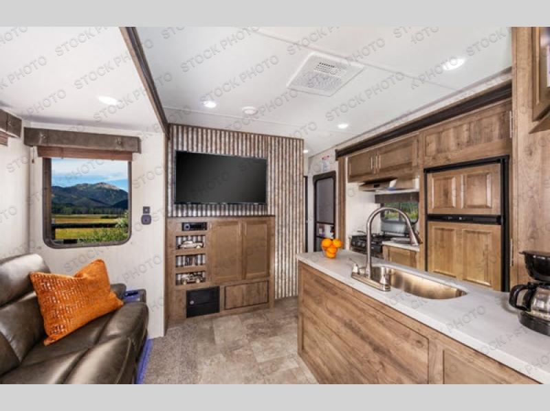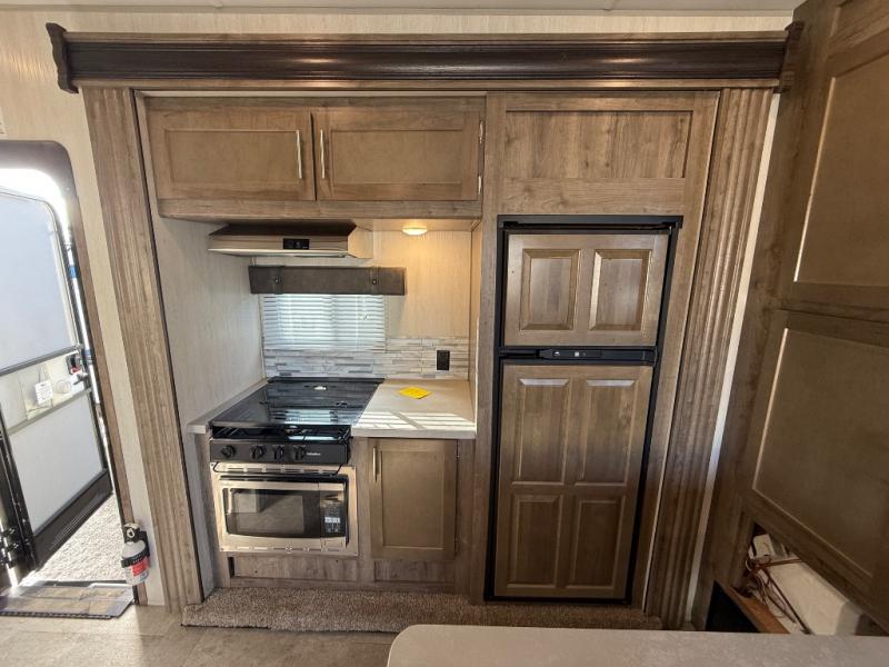 When the trails are calling your name and you are ready for a weekend away from home, then load up your riding gear, your family, and head out to your favorite campground in this travel trailer. Your four wheeler, dirt bikes, or ATV can be stored in the 12' 6" separate garage, and the two entry doors allow you to easily access the trailer from outside. You will also find that this model conveniently has a bath and a half with the half bathroom accessible in the garage. In the combined kitchen/living area there are two opposing slides which help to maximize the living space and give you plenty of room to move around the kitchen as you work to prepare your favorite meals for your family.