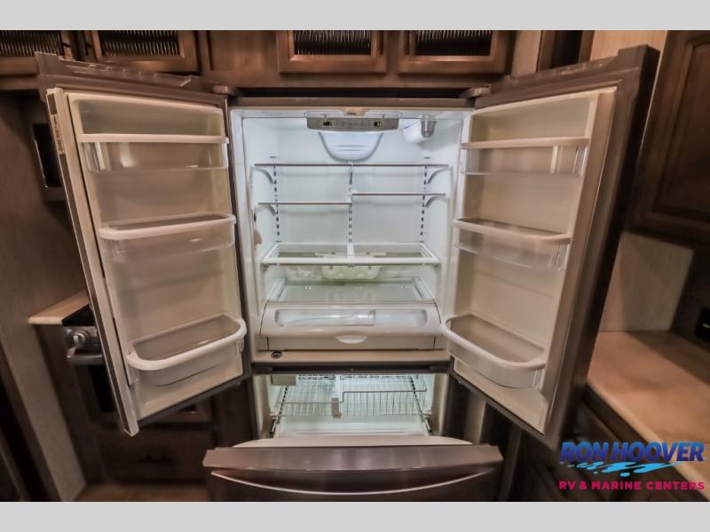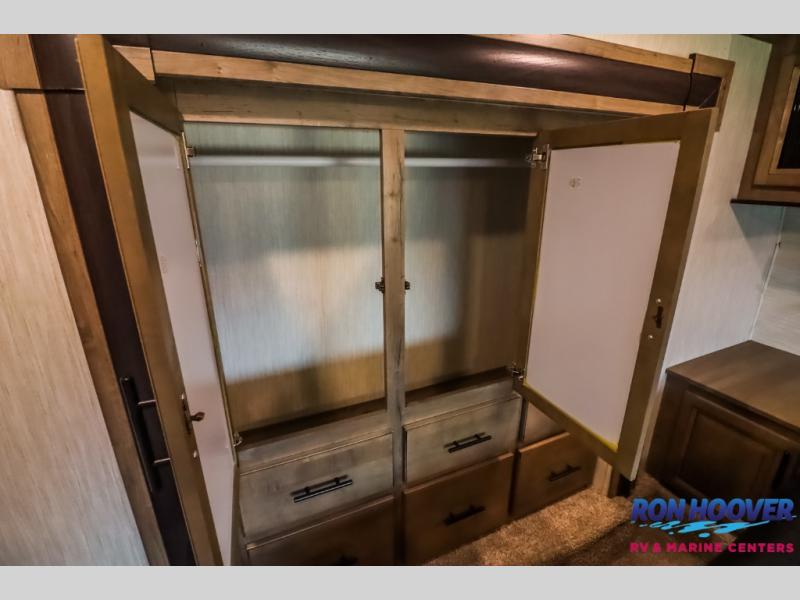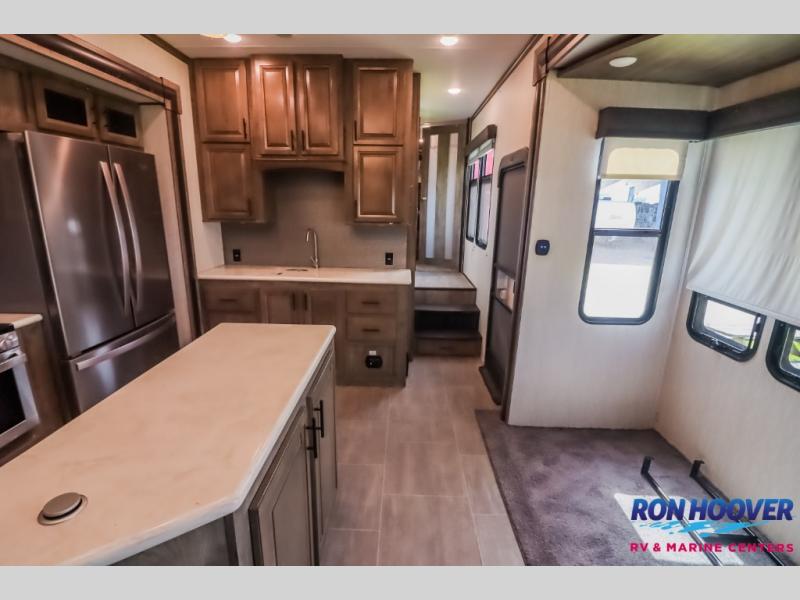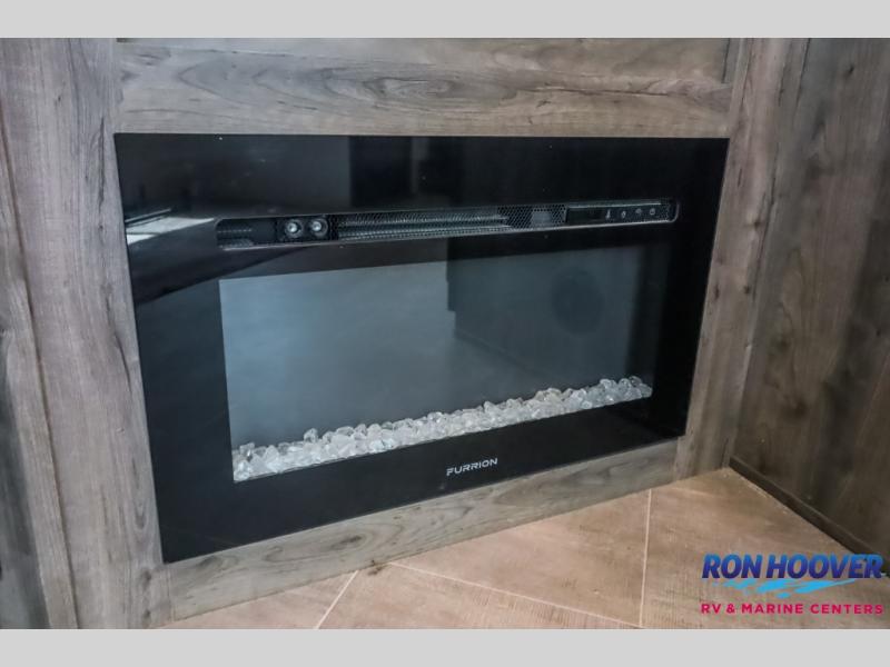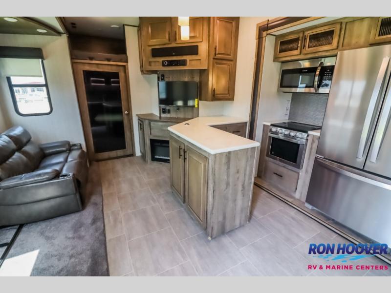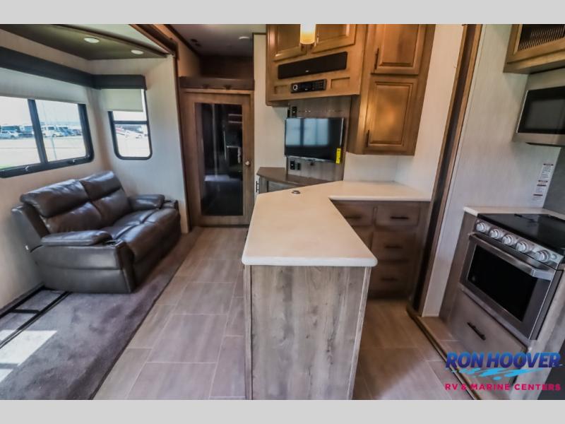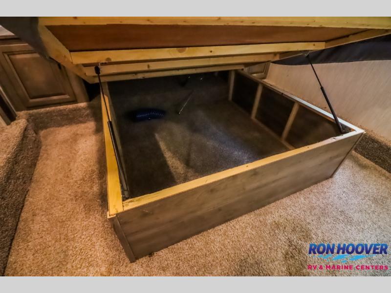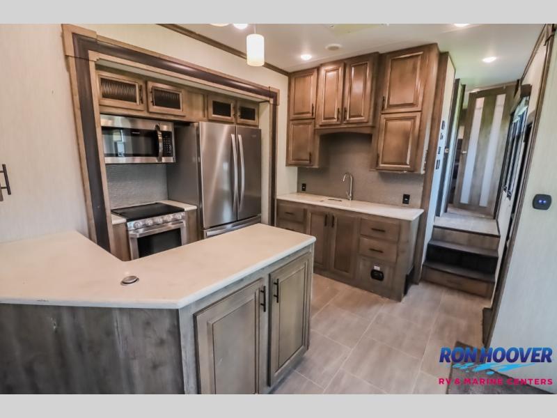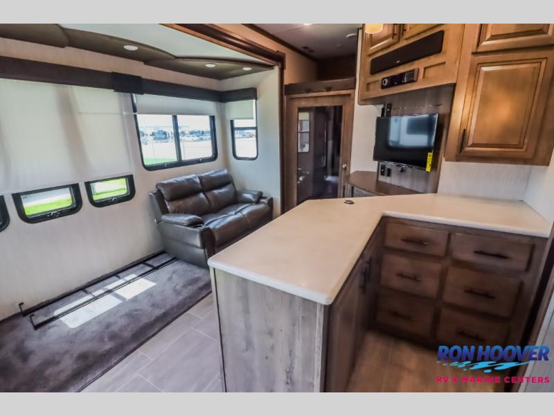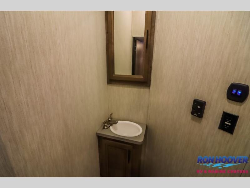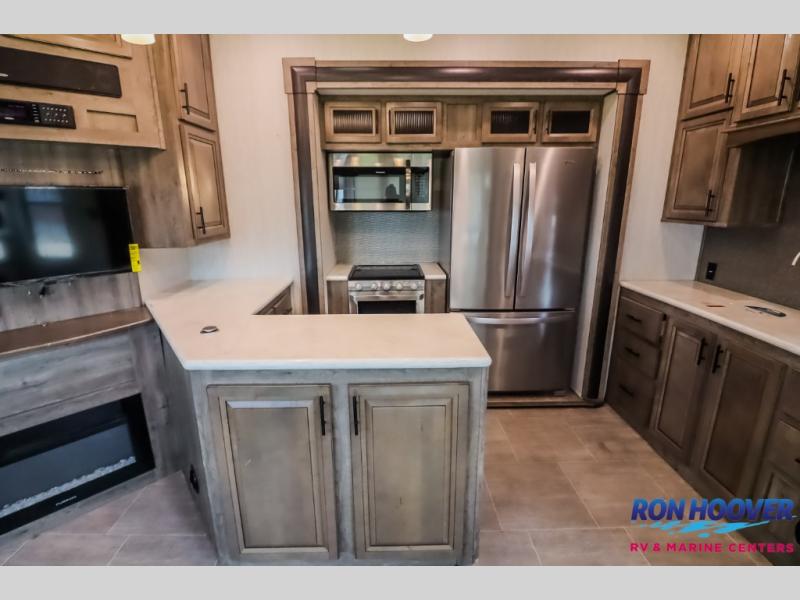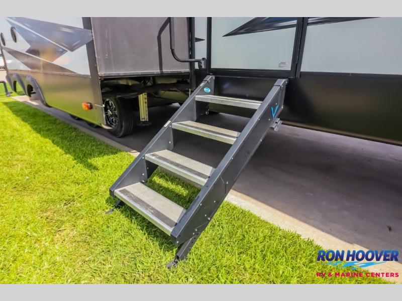 When you like to play hard outdoors then relax in comfort indoors, you'll need this Vengeance Touring Edition toy hauler fifth wheel. You will find the rear ramp door into the 12' 6" garage super easy to handle, and the HappiJac electric bunk in back along with a sofa/bed combo underneath will come in handy for extra guests. The spacious kitchen features a peninsula countertop and a pantry for your dry goods. There is also a large TV with a fireplace and a sofa to kick back on before you head off to rest on the upgraded Denver queen mattress in the master bedroom. Oh, and the bathroom facilities won't disappoint either as there is a half bath off the garage and a full bath with a large shower with seat which will be great after a full day of playing hard.