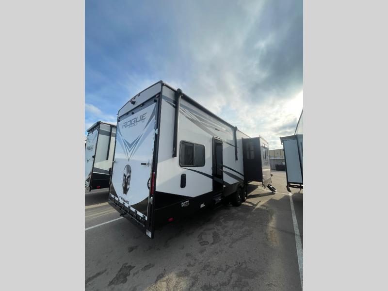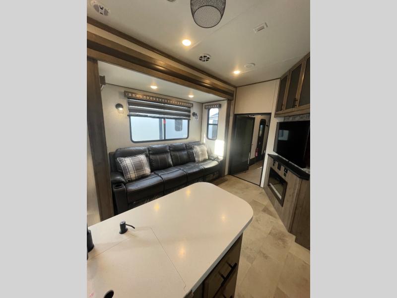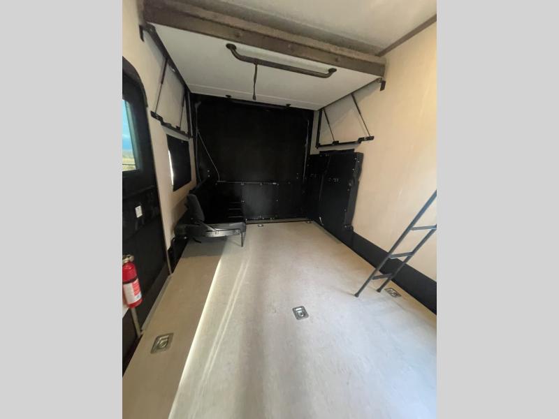 When you like to play hard outdoors then relax in comfort indoors, you'll need this Vengeance Touring Edition toy hauler fifth wheel. You will find the rear ramp door into the 12' 6" garage super easy to handle, and the HappiJac electric bunk in back along with a sofa/bed combo underneath will come in handy for extra guests. The spacious kitchen features a peninsula countertop and a pantry for your dry goods. There is also a large TV with a fireplace and a sofa to kick back on before you head off to rest on the upgraded Denver queen mattress in the master bedroom. Oh, and the bathroom facilities won't disappoint either as there is a half bath off the garage and a full bath with a large shower with seat which will be great after a full day of playing hard.
